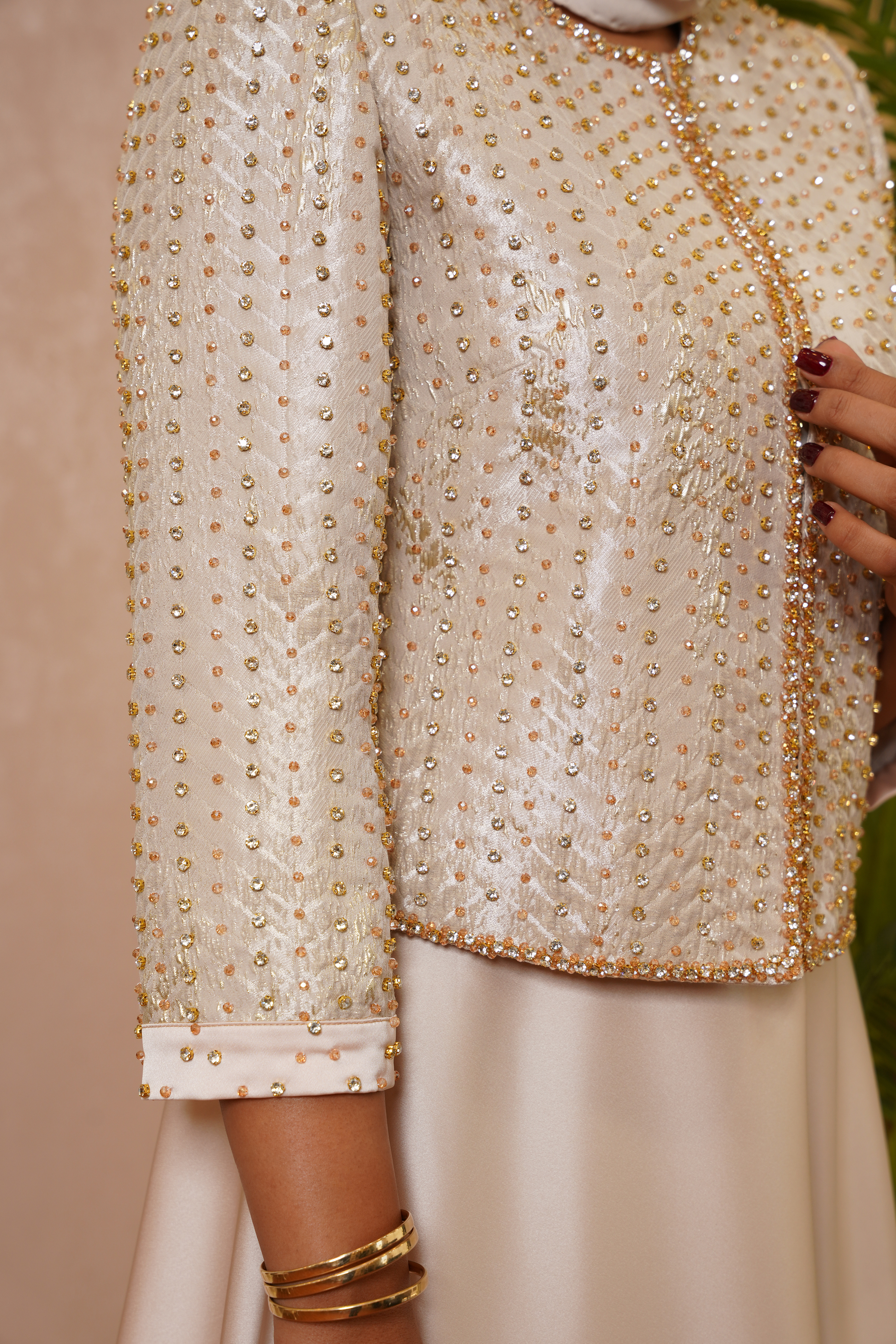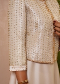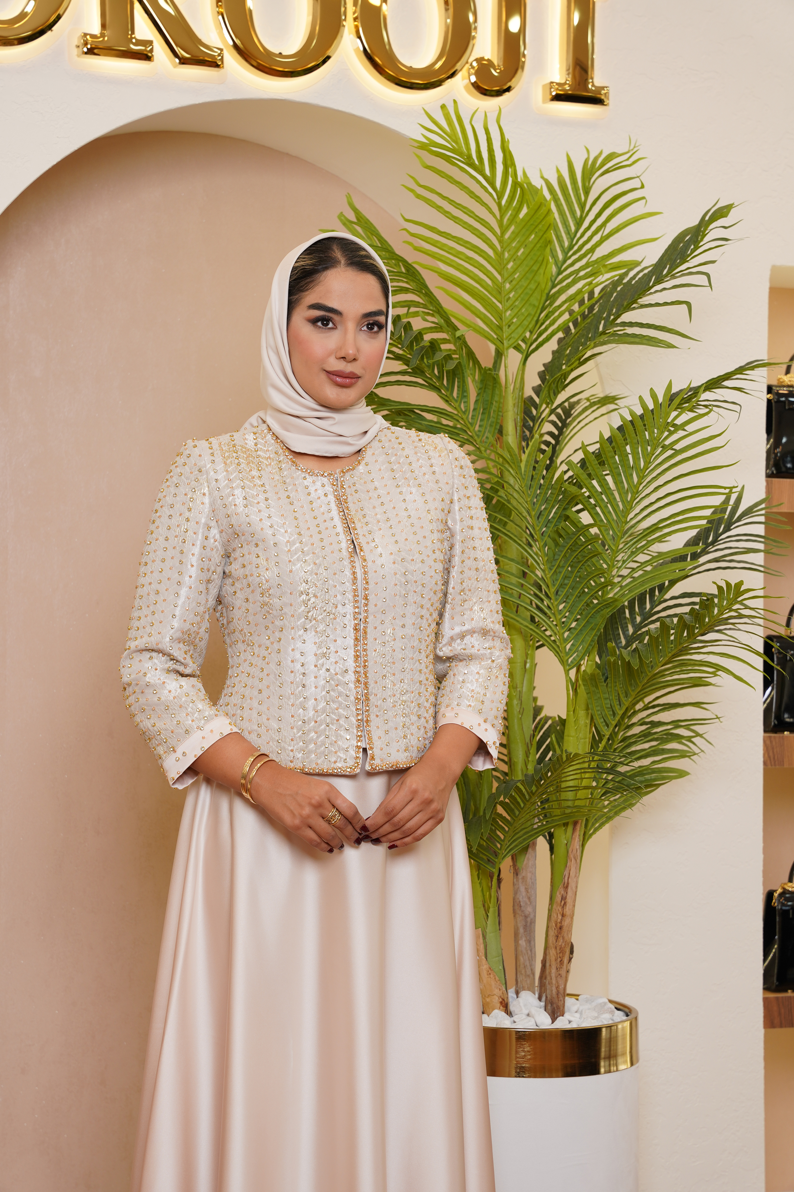 این ست با پارچه ژاکارد ترک درجهیک دوخته شده و با سنگهای اورجینال کارشده بهصورت ظریف و دستی تزئین شده است. ترکیب رنگهای هماهنگ و طراحی دقیق آن، استایلی خاص و لوکس خلق کرده که برای بانوانی با سلیقهی منحصربهفرد و استایل متمایز طراحی شده است.