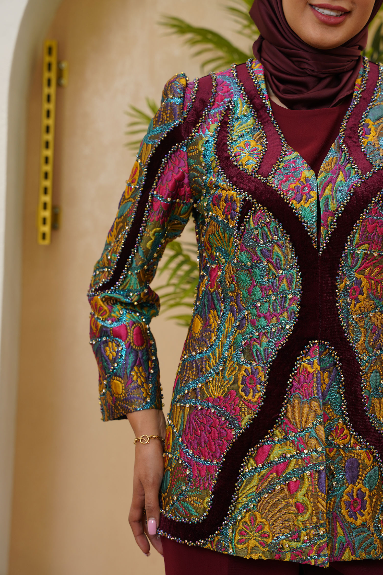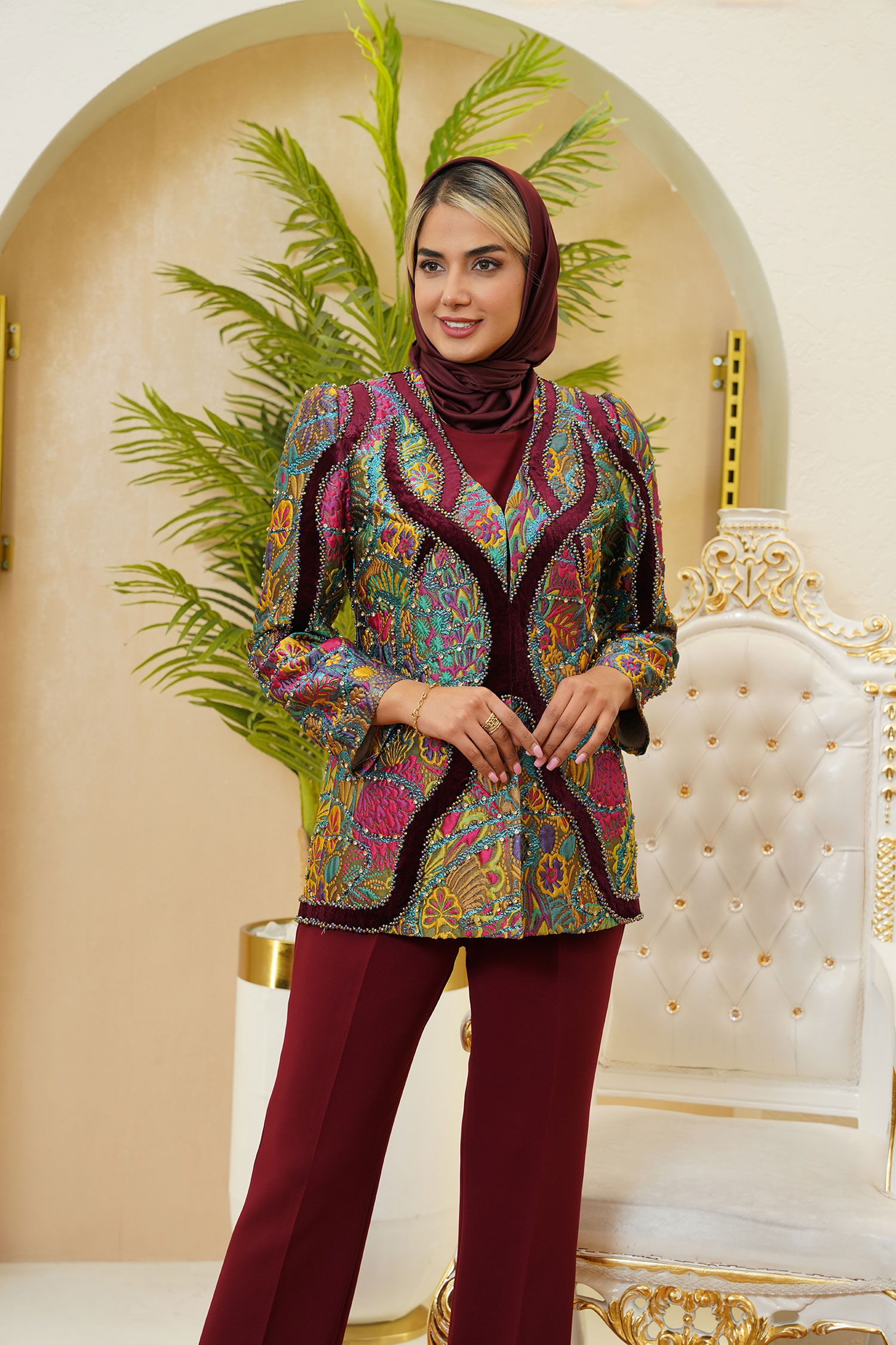 مانتو بهنوش یک کت‌مانتوی مجلسی با ساختار کاملاً مهندسی‌شده است که بر پایه‌ی فرم کت کلاسیک طراحی شده اما با تزریق جزئیات آرتیستیک و تزئینی، به یک آیتم لاکچری تبدیل شده است. پارچه‌ی اصلی دارای بافت ژاکارد چندرنگ با موتیف‌های ارگانیک و الهام‌گرفته از نقوش گیاهی است که عمق بصری بالایی ایجاد می‌کند.