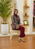 خطوط عمودی و منحنیِ طراحی‌شده با نوارهای سنگ‌دوزی‌شده، به‌صورت هوشمندانه روی الگو جانمایی شده‌اند تا خطای دید کشیدگی اندام ایجاد شود و فرم بالاتنه را جمع‌وجورتر نشان دهد. یقه به‌صورت یقه کت ایستاده–باز (نیمه‌انگلیسی مدرن) طراحی شده که بدون اغراق، وقار و رسمیت کار را حفظ می‌کند. سنگ‌دوزی‌ها کاملاً کنترل‌شده، با تراکم متعادل و در امتداد خطوط برش انجام شده‌اند؛ نه تزئینیِ صرف، بلکه در خدمت فرم‌دهی لباس. فیوزینگ با حرارت بالا باعث ایستایی عالی پارچه، ثبات فرم یقه و جلوگیری از موج‌افتادگی در طول زمان شده است.