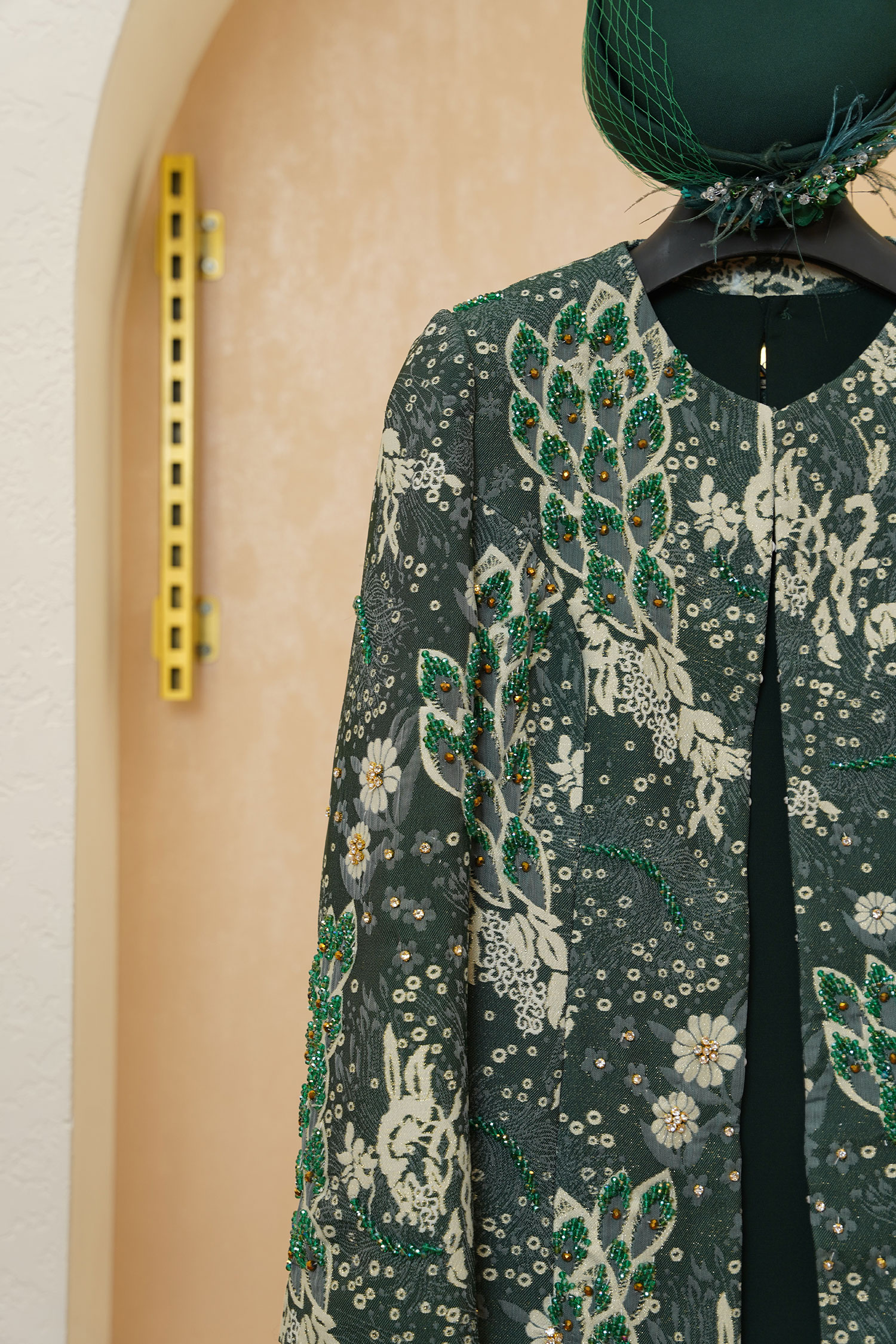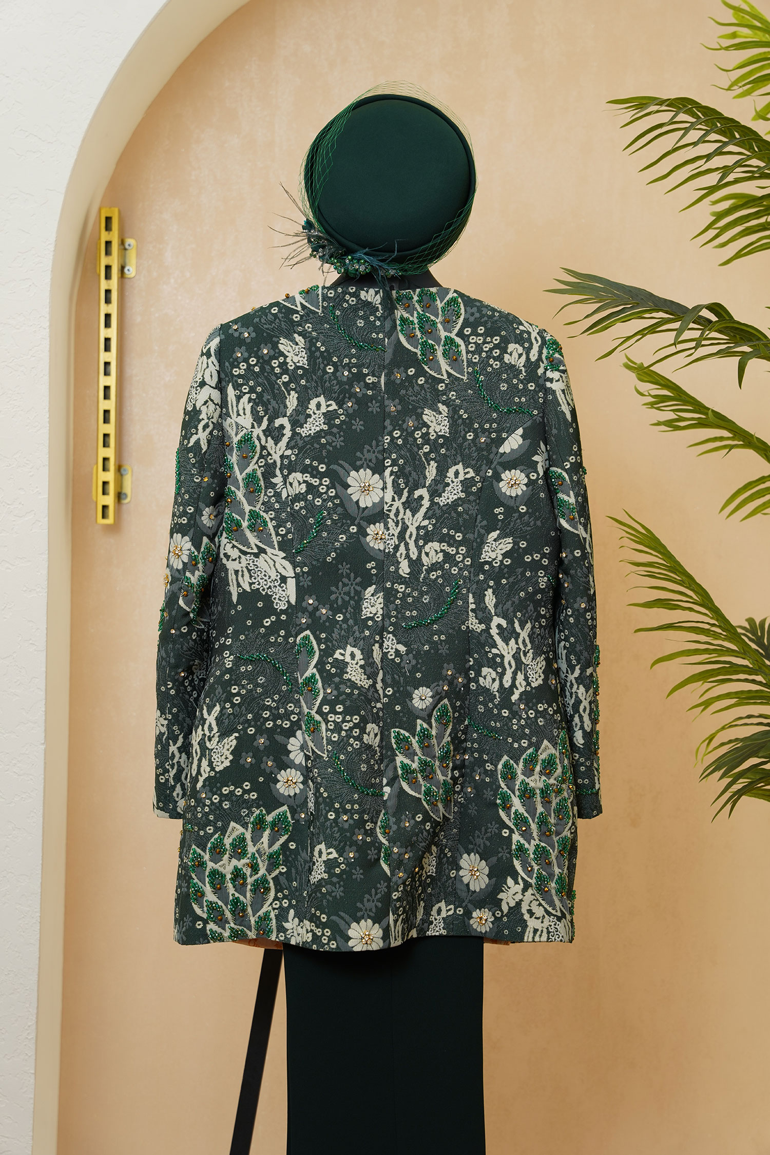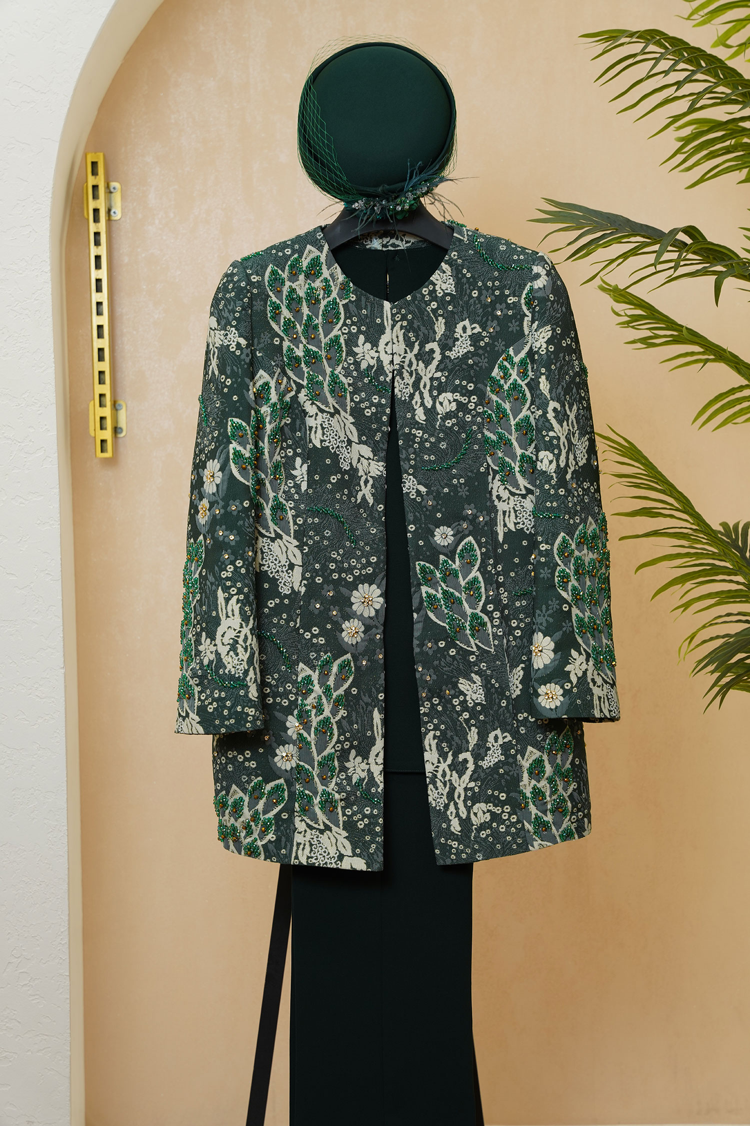 ژاکارد سلین با قد ۸۰ سانتی‌متر و آستین ۶۰ سانتی‌متر، جلوه‌ای لوکس و هنرمندانه از طراحی معاصر را به نمایش می‌گذارد. نقوش گل‌دار ظریف در طیف طوسی، بژ و جزئیات طلایی براق، روی زمینه‌ای روشن نشسته و عمق و بافتی چشم‌نواز ایجاد کرده‌اند. پارچه ژاکارد با ایستایی مناسب، فرم کت را ساختارمند و شیک نشان می‌دهد و آن را به انتخابی ایده‌آل برای استایل‌های مجلسی و نیمه‌رسمی تبدیل می‌کند. این طراحی، تلفیقی متعادل از ظرافت کلاسیک، اصالت و لوکس‌بودن مدرن است.