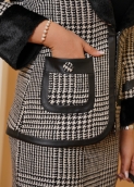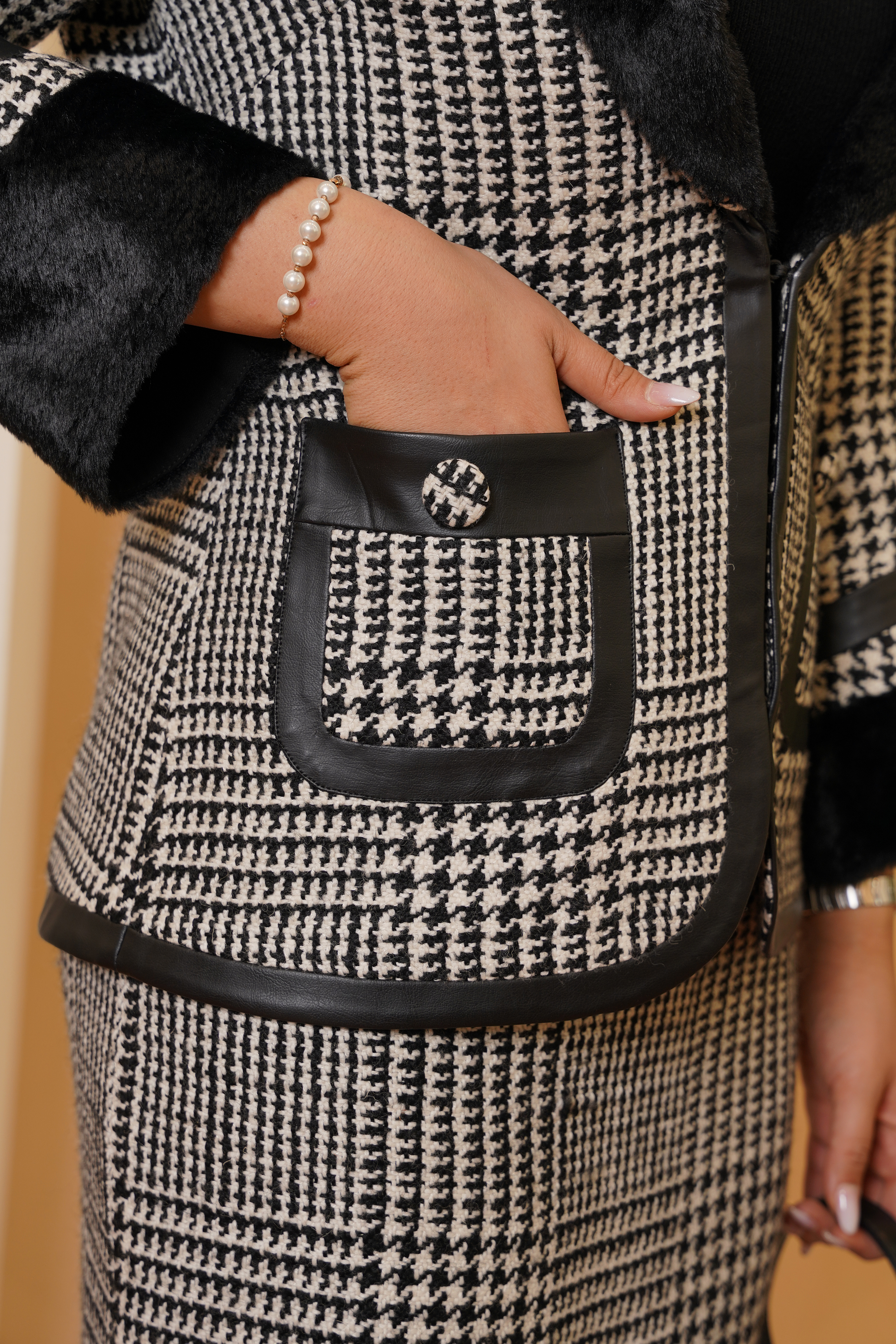 کتدامن پیچازی برند عروجی، یک ست شیک و گرم برای فصلهای سرد است. این کار از فوتر طرحدار با دوخت مزونی تهیه شده و تمام آستر و فیوزینگ استحکام بالایی به آن داده است. یقه و سرآستینها با خز کار شده و دو جیب کاربردی روی کت قرار دارد. کت قد 65 سانت و دامن قد ۸۵ سانت است؛ انتخابی ایدهآل برای استایل رسمی و مجلسی.