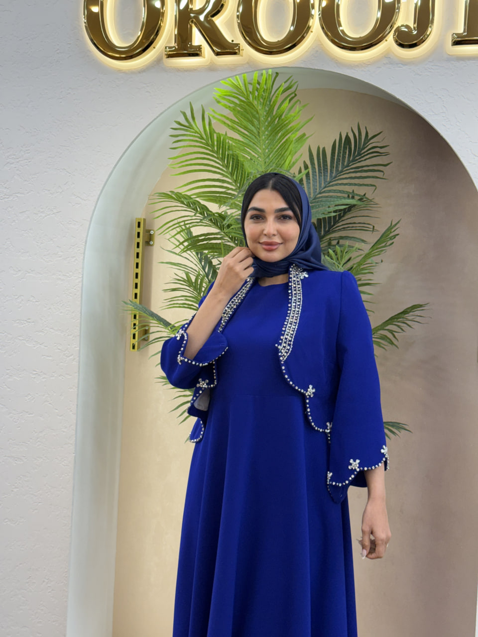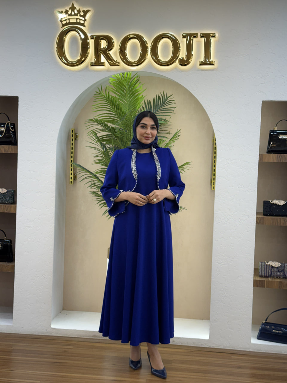 سارافون با قد ۱۳۵ سانت از جنس کرپ ندا دوخته شده و با خط عمودی ساده، قد را کشیده‌تر و استایل را یک‌دست و مرتب نشان می‌دهد. ترکیب این دو، یک ست کاملاً زنانه، نجیب و در عین حال خاص می‌سازد که برای مراسم رسمی، نامزدی‌ها، مهمانی‌های شب و مهمان‌های VIP انتخابی کاملاً مطمئن است.