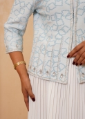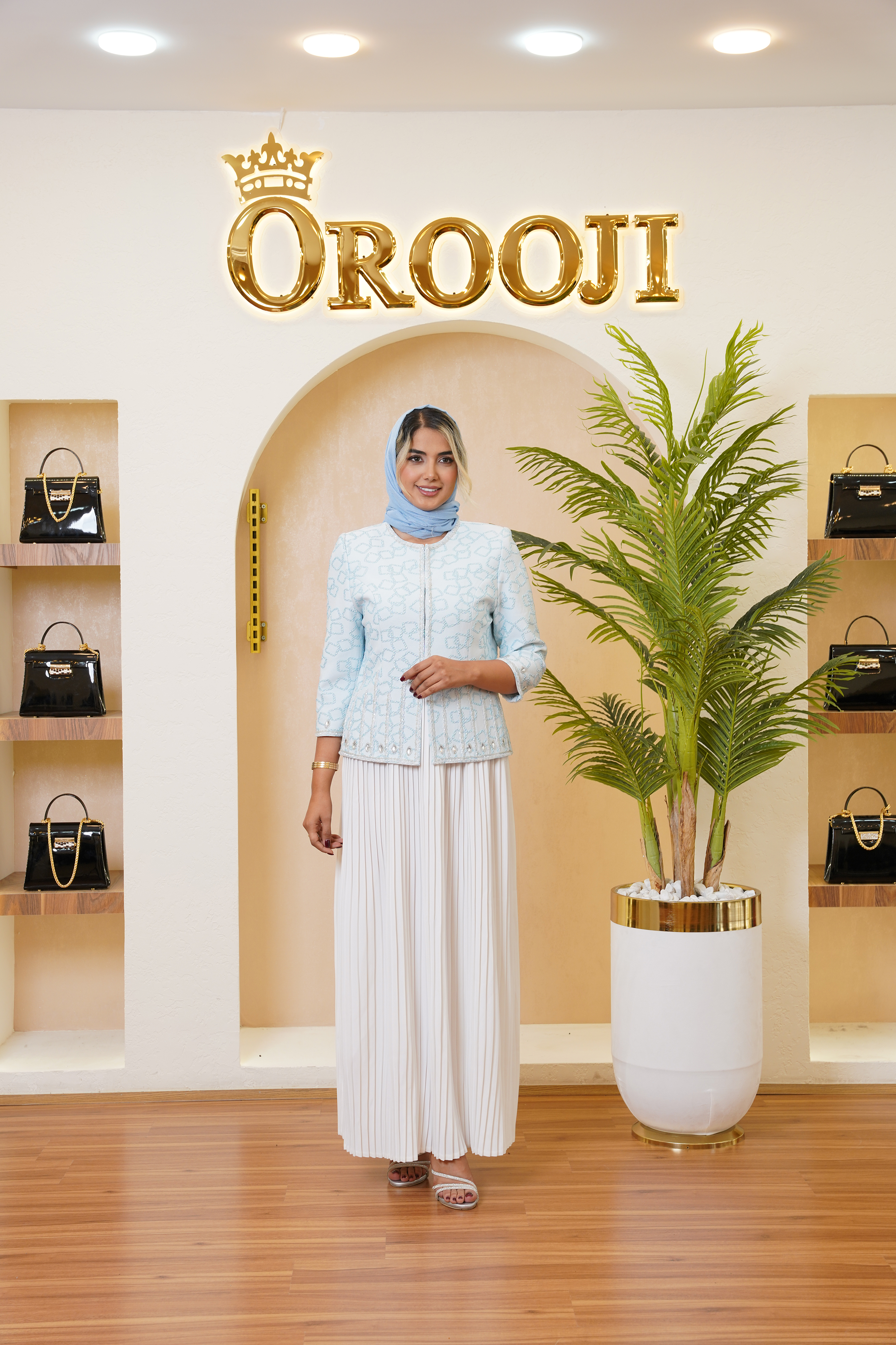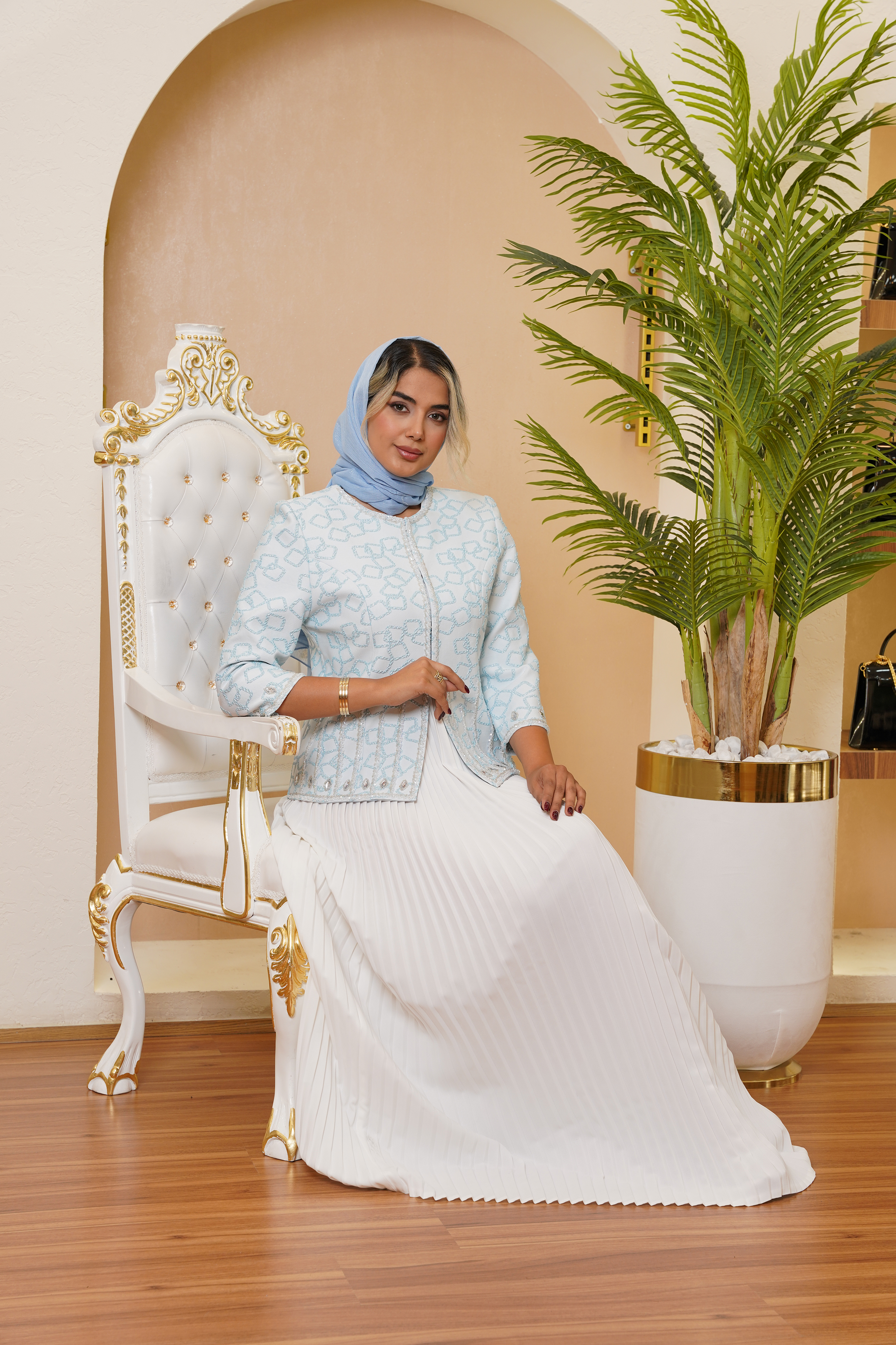کت سارافون ترک آترا تلفیقی از ظرافت کلاسیک و طراحی مدرن است. پارچه ژاکارد ترک مشکی با نقوش هندسی براق، جلوه‌ای متفاوت و قدرتمند به استایل می‌بخشد. درخشش ریز خطوط آبی و سبز تیره در نقش پارچه، مانند نوری آرام در شب، زیبایی کار را دوچندان کرده است. طراحی مزونی دقیق و سنگ‌دوزی‌های هماهنگ، کت آترا را به انتخابی شیک و خاص برای بانوان جسور و خوش‌استایل تبدیل می‌کند.