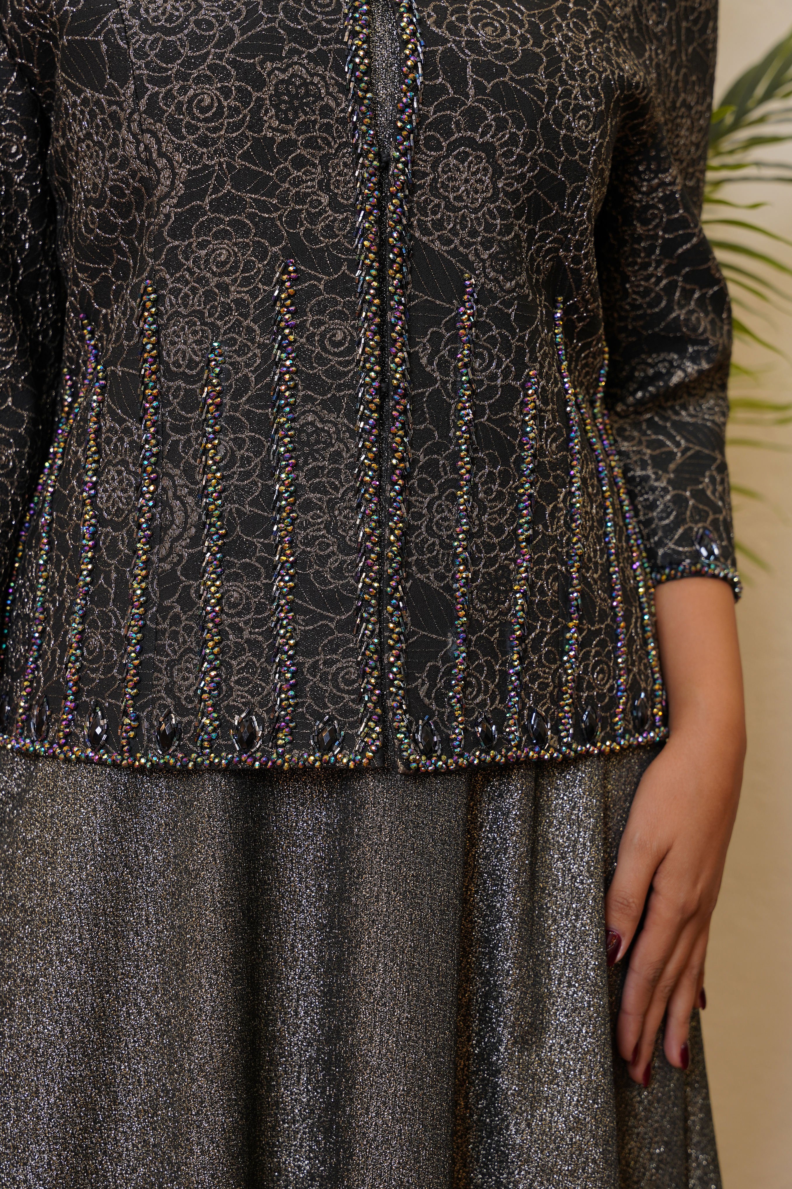 سه‌ربع (¾ length) با سرآستین کارشده سنگ و نقوش طلایی