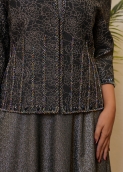 کت از پارچه ژاکارد ترک مشکی با گل‌های طلایی براق دوخته شده است؛ بافت پارچه ظریف اما مقاوم بوده و در نور جلوه‌ای درخشان و زنده دارد.