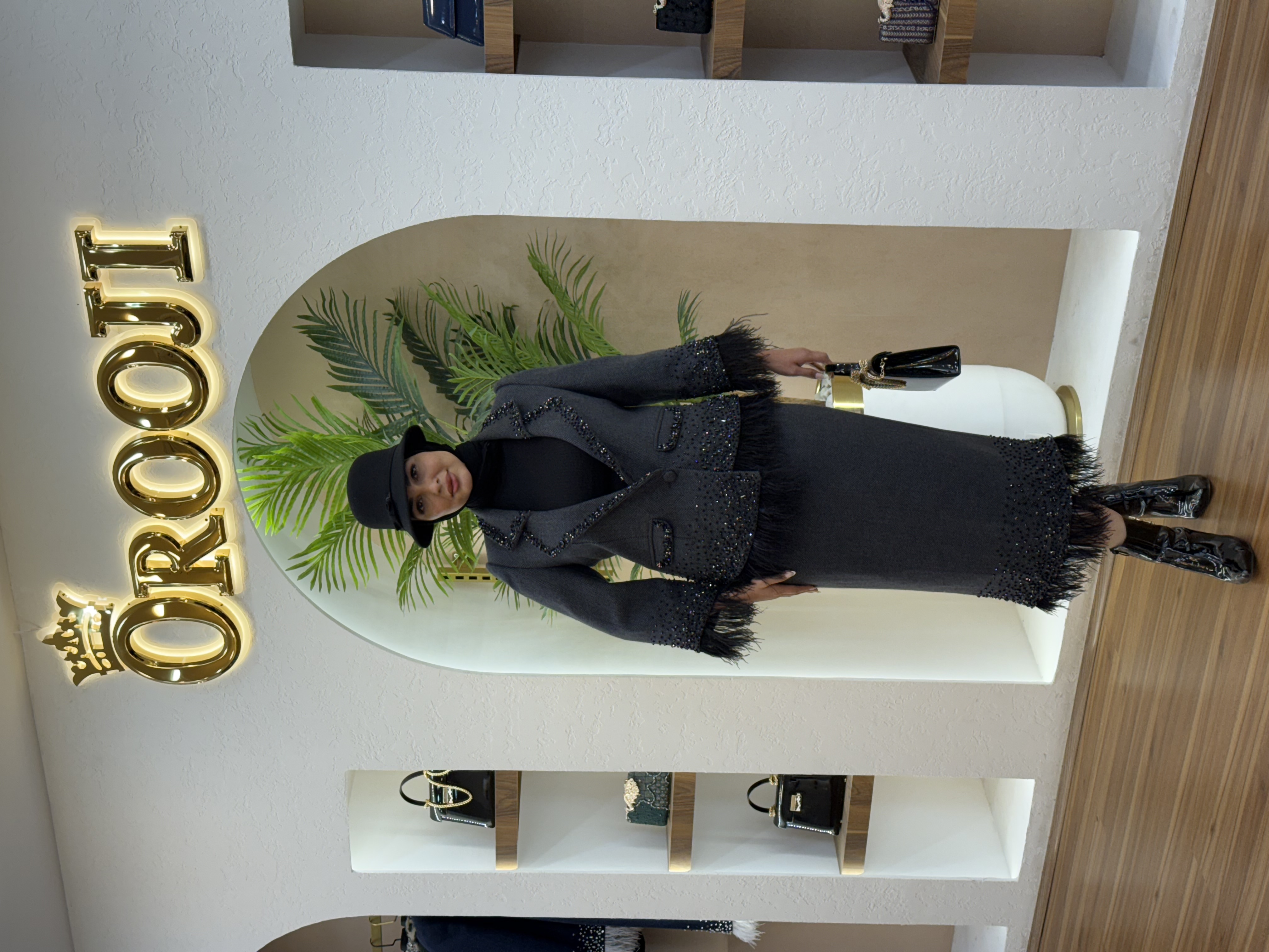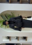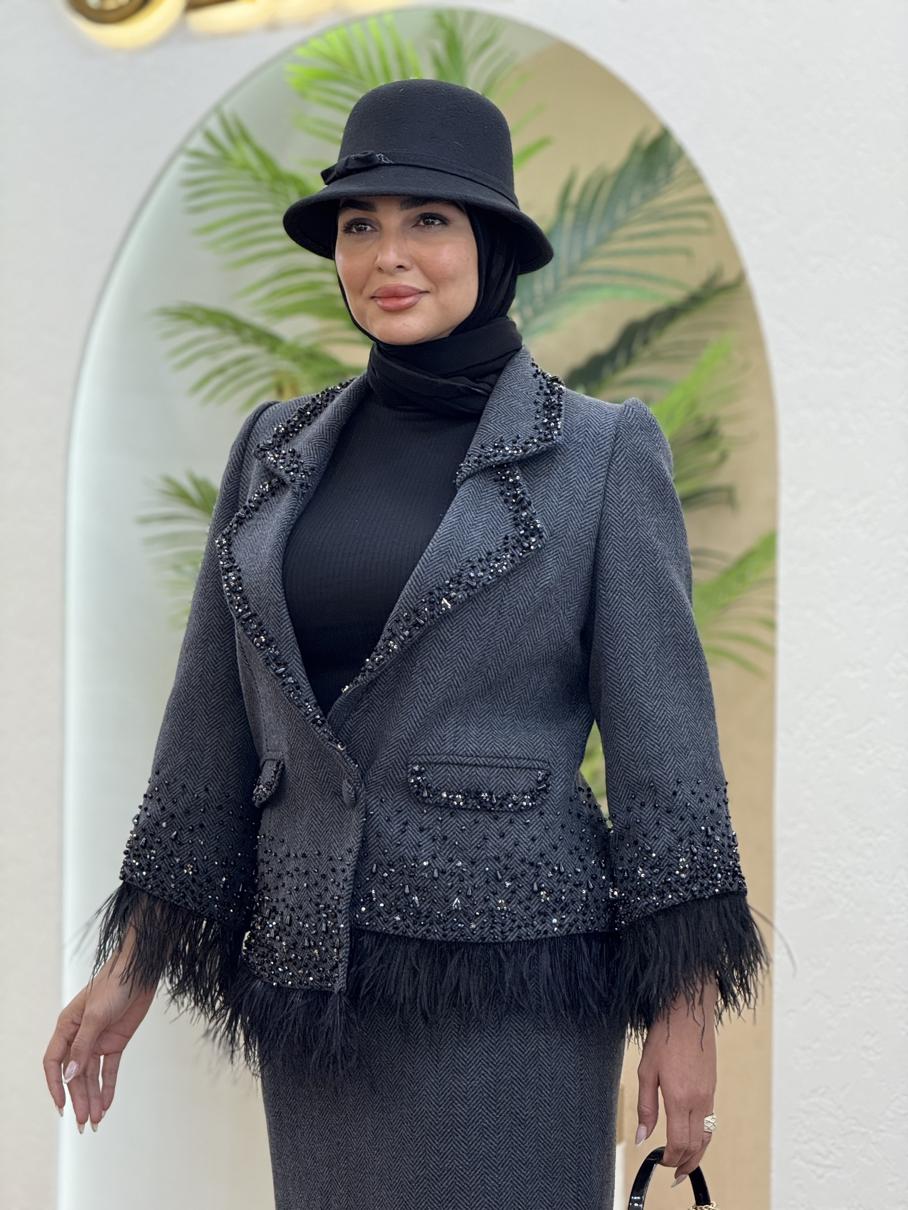 کت در بخش پایینی و آستین‌ها با پَرهای سبک و لطیف تزئین شده و تضاد جذابی میان فوتر سنگین و پرهای نرم ایجاد کرده است. دکمه‌های روکار طراحی شده‌اند تا به ظاهر کت جلوه‌ای فاخر ببخشند. ترکیب فرم فون دامن و برش فیت کت، استایلی متناسب با استایل بانوان خوش‌پوش ایرانی ایجاد می‌کند.
