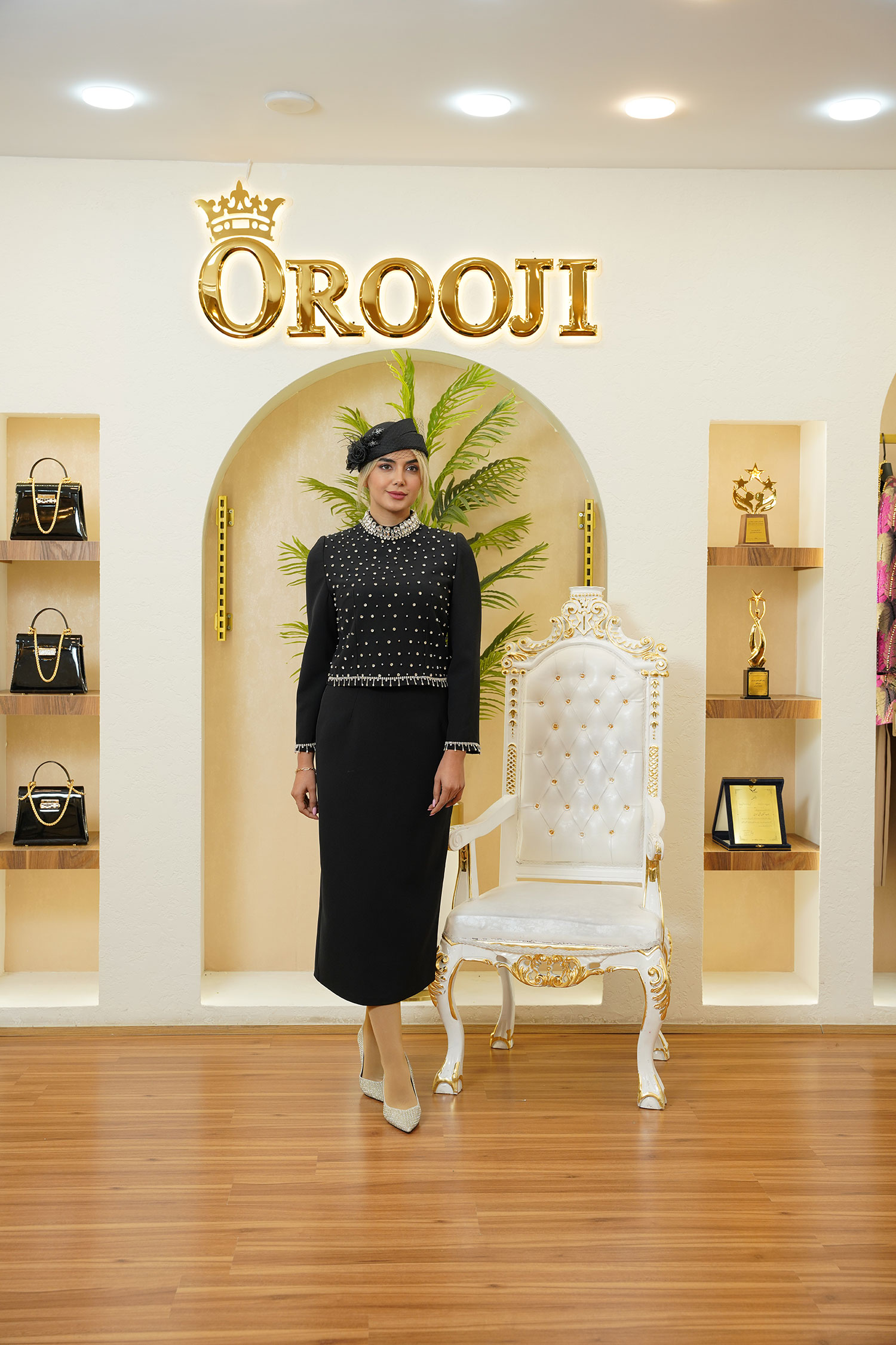 این کراپ‌کت و دامن یک ست کاملاً مینیمال-لوکس با تمرکز روی سنگدوزی کریستالی است: کراپ‌کت با قد ۴۶ سانتی‌متر روی خط کمر می‌نشیند و با یقه ایستاده که مثل یک کالرِ جواهرنشان با کریستال‌های درشت قاب‌گیری شده، فوراً نقطه کانونی صورت و گردن را برجسته می‌کند. سطح جلوی کراپ با کریستال‌دوزی پراکنده به صورت الگوی «ستاره‌ای/اسپری» چیدمان شده و به سمت کمر منظم‌تر می‌شود؛ روی خط پایین تنه کراپ، یک نوار ریزِ کریستالی کار شده که از آن آویزهای کوتاه کریستالی به شکل فرنچ/ریشه‌ای آویزان است و در حرکت، درخشش کنترل‌شده و بسیار مجلسی ایجاد می‌کند. آستین‌ها ساده (برای بالانس بصری) و فرم کلی کراپ، فیت و تمیز است تا سنگدوزی جلو کاملاً دیده شود. دامن با قد ۸۸ سانتی‌متر فرم راسته دارد و با کرپ کنزو ، خط اندام را کشیده و رسمی نگه می‌دارد.، کل کار فیوزینگ با حرارت بالا و تماماً لمینت شده تا ایستایی، دوام و تمیزی پشت‌کار سنگدوزی در سطح مزونی تضمین شود.
