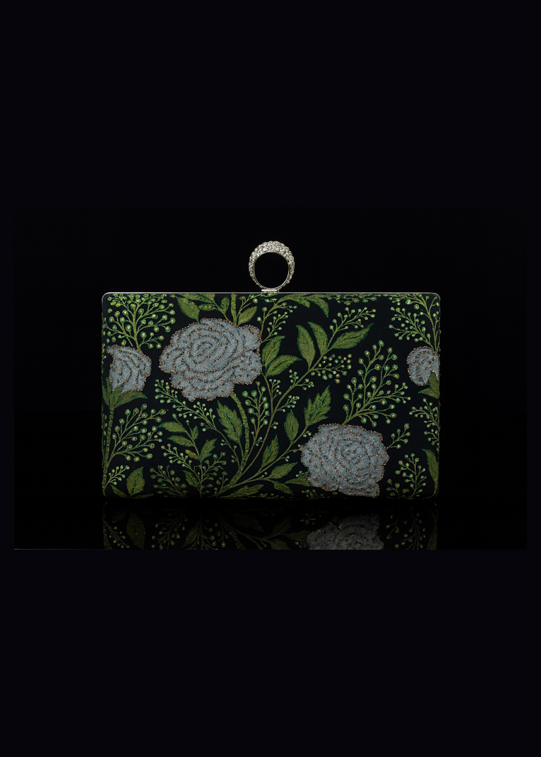 کیف طرح آرنیا یکی از خاص‌ترین کارهای مزون عروجی است که با همان پارچه مانتوی آرنیا تولید می‌شود. در این مدل، طرح گل‌های برجسته خاکستری، برگ‌های سبز لایه‌لایه و ریزه‌کاری‌های سنگدوزی ریز و درشت، کاملاً هماهنگ با مانتو روی کیف اجرا می‌شود.