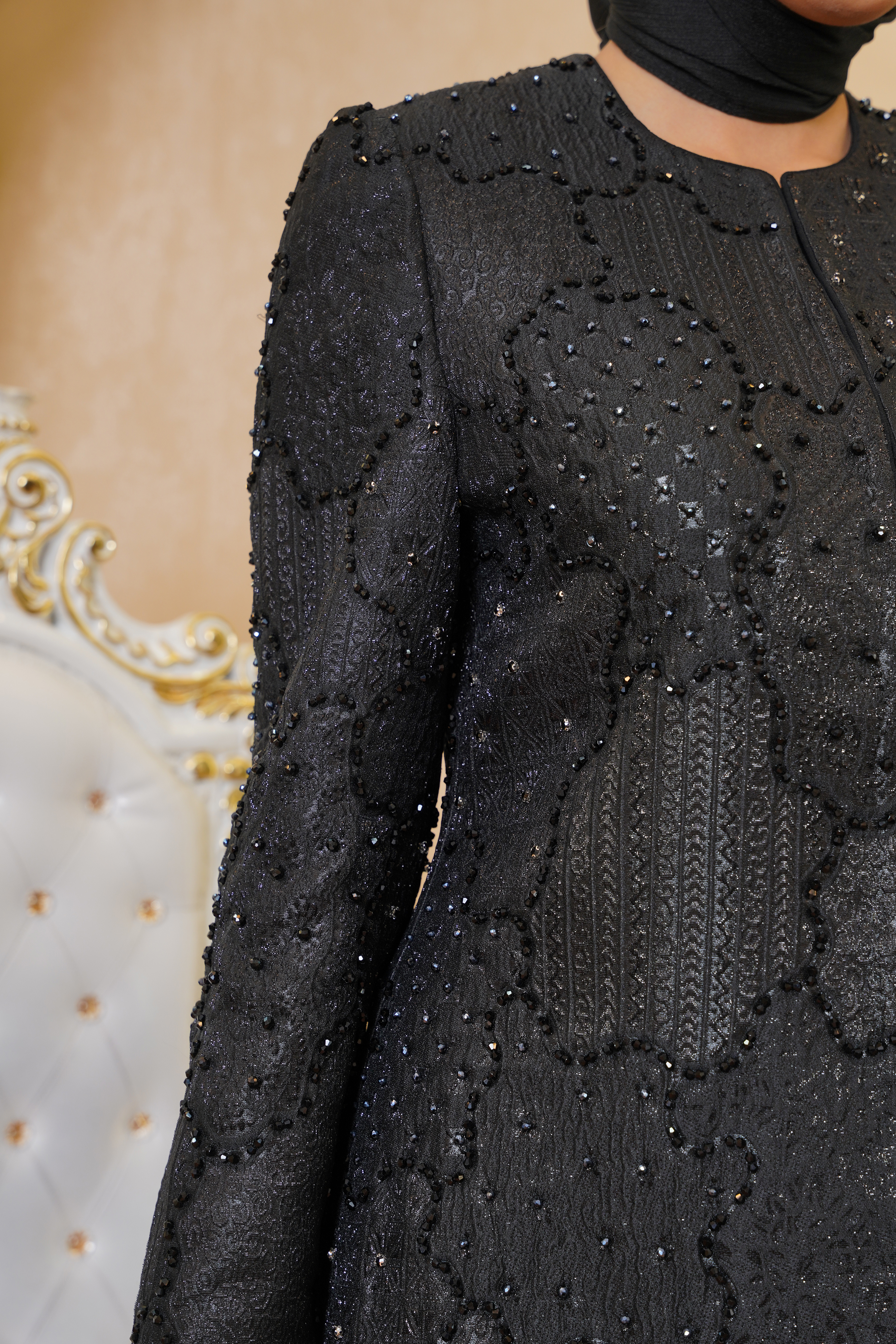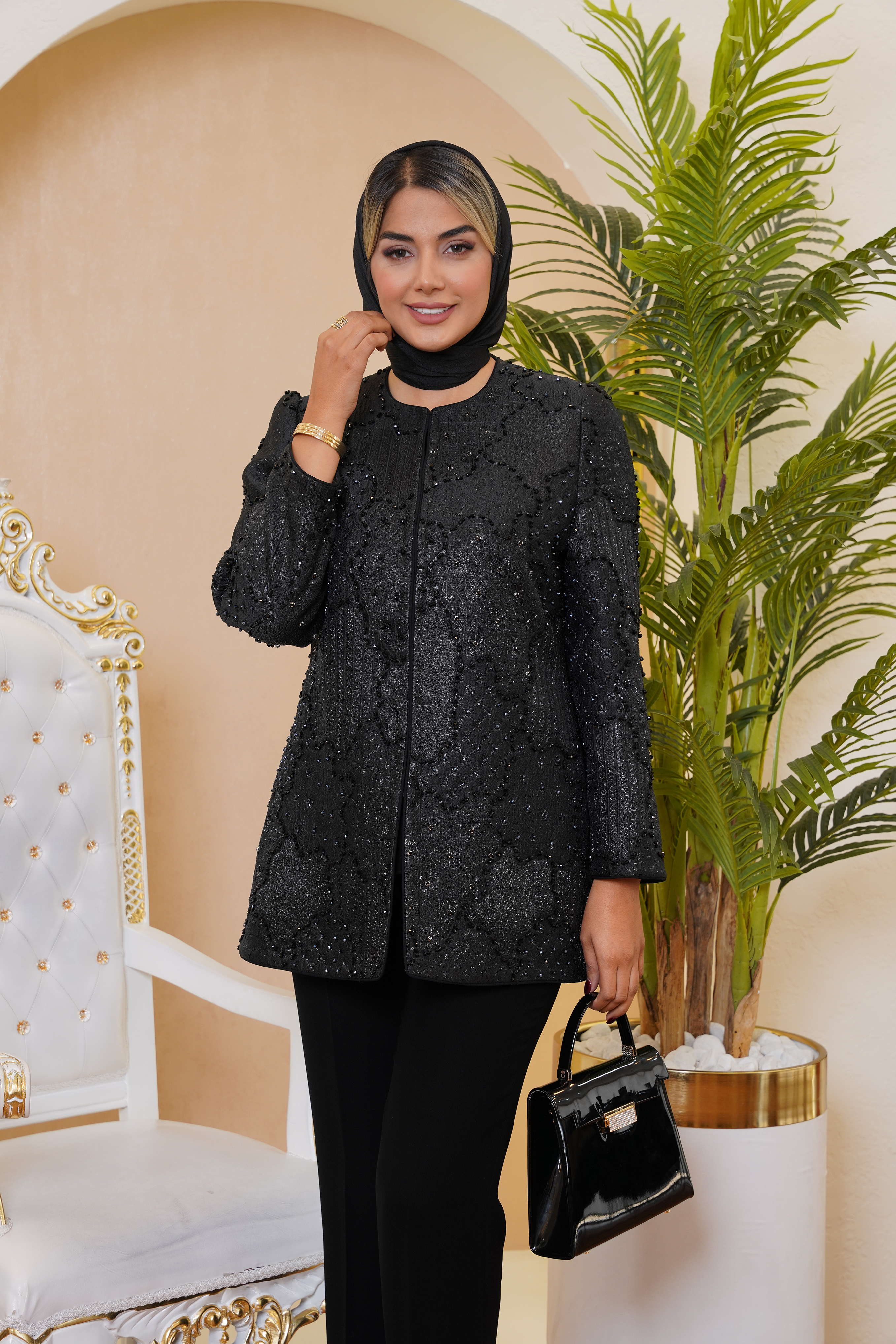 مانتوی «طرح هندسی» یکی از کارهای شاخص و لوکس برند عروجی است که با ژاکارد سنگین و گرم ترک تولید شده؛ پارچهای با بافت برجسته و ماندگاری بالا که برای فصول سرد انتخابی بینقص است. طراحی این مدل بر پایه نقشهای هندسی منظم انجام شده و روی آن سنگدوزی مزونی کاملاً دستکار شده قرار گرفته که جلوهای خاص و چشمنواز ایجاد میکند.