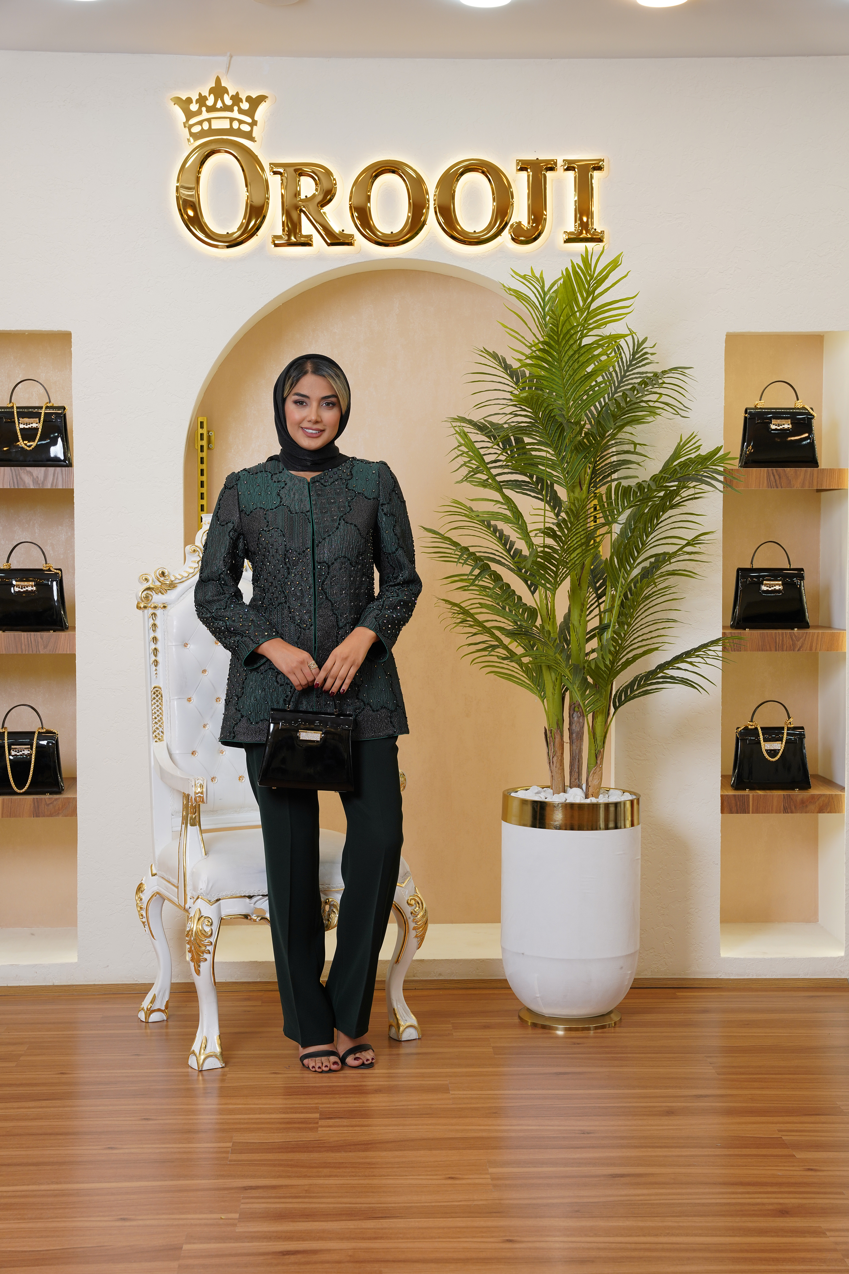 مانتوی «طرح هندسی» یکی از کارهای شاخص و لوکس برند عروجی است که با ژاکارد سنگین و گرم ترک تولید شده؛ پارچه‌ای با بافت برجسته و ماندگاری بالا که برای فصول سرد انتخابی بی‌نقص است. طراحی این مدل بر پایه نقش‌های هندسی منظم انجام شده و روی آن سنگ‌دوزی مزونی کاملاً دست‌کار شده قرار گرفته که جلوه‌ای خاص و چشم‌نواز ایجاد می‌کند.