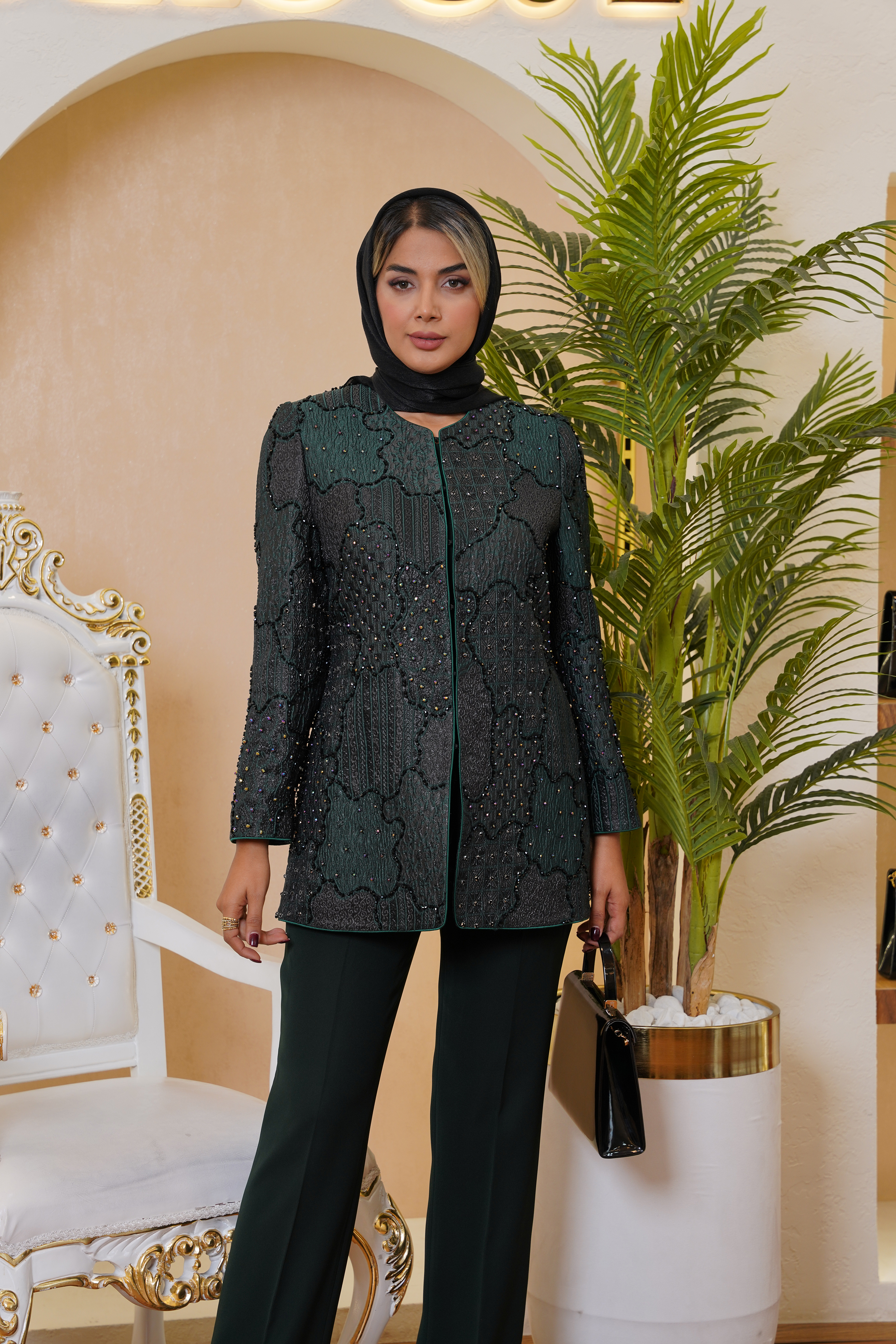 مانتوی «طرح هندسی» از پارچه ژاکارد ترک گرم، سنگین و باکیفیت دوخته شده و با سنگ‌دوزی ظریف مزونی جلوه‌ای کاملاً لاکچری دارد. این مدل با قد ۸۰ سانتی‌متر و آستین ۶۰ سانتی‌متری طراحی شده و به‌دلیل تقاضای بالا از سوی مشتریان، جزو پرفروش‌ترین کالکشن‌های عروجی است که مجدداً شارژ شده. دوخت تمیز، ترکیب رنگ منحصربه‌فرد و فرم شیک و رسمی، این محصول را به انتخابی ایده‌آل برای مهمانی‌های خاص و استایل‌های فاخر تبدیل می‌کند.