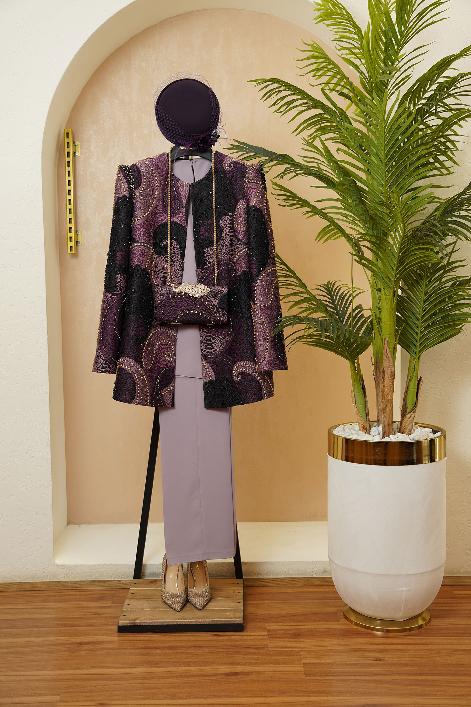 مانتوی «ژاکارد ترمه» با نگاهی معاصر به اصالت پارچه‌های سنتی طراحی شده است؛ طرحی که تمرکز آن بر بافت، ساختار و جزئیات است. پارچه‌ی ژاکارد ترمه با نقش‌مایه‌های الهام‌گرفته از ترمه‌های کلاسیک، زمینه‌ای غنی ایجاد کرده و سنگ‌دوزی‌های ظریف، بدون اغراق، به آن جلوه‌ای لوکس و کنترل‌شده بخشیده‌اند. طراحی آستین کوهانی، به مانتو ایستایی و شخصیت فرمی می‌دهد و قد ۸۰ سانتی‌متری، آن را به انتخابی کاربردی برای استایل‌های رسمی و نیمه‌مجلسی تبدیل می‌کند. تولید این طرح در پنج رنگ، انعطاف در انتخاب را فراهم کرده و «ژاکارد ترمه» را به مانتویی متمایز برای بانویی بدل می‌سازد که کیفیت، طراحی و هویت بصری برای او اولویت دارد.