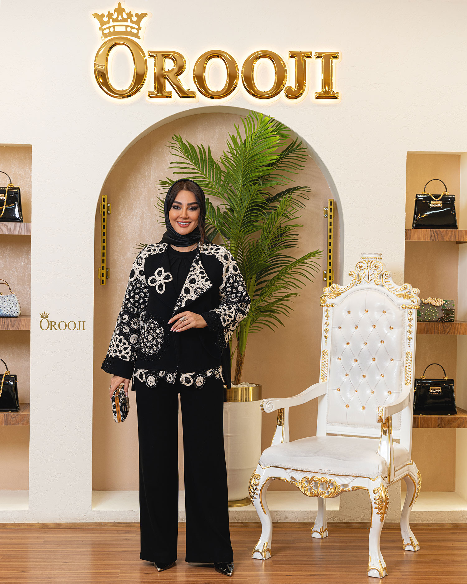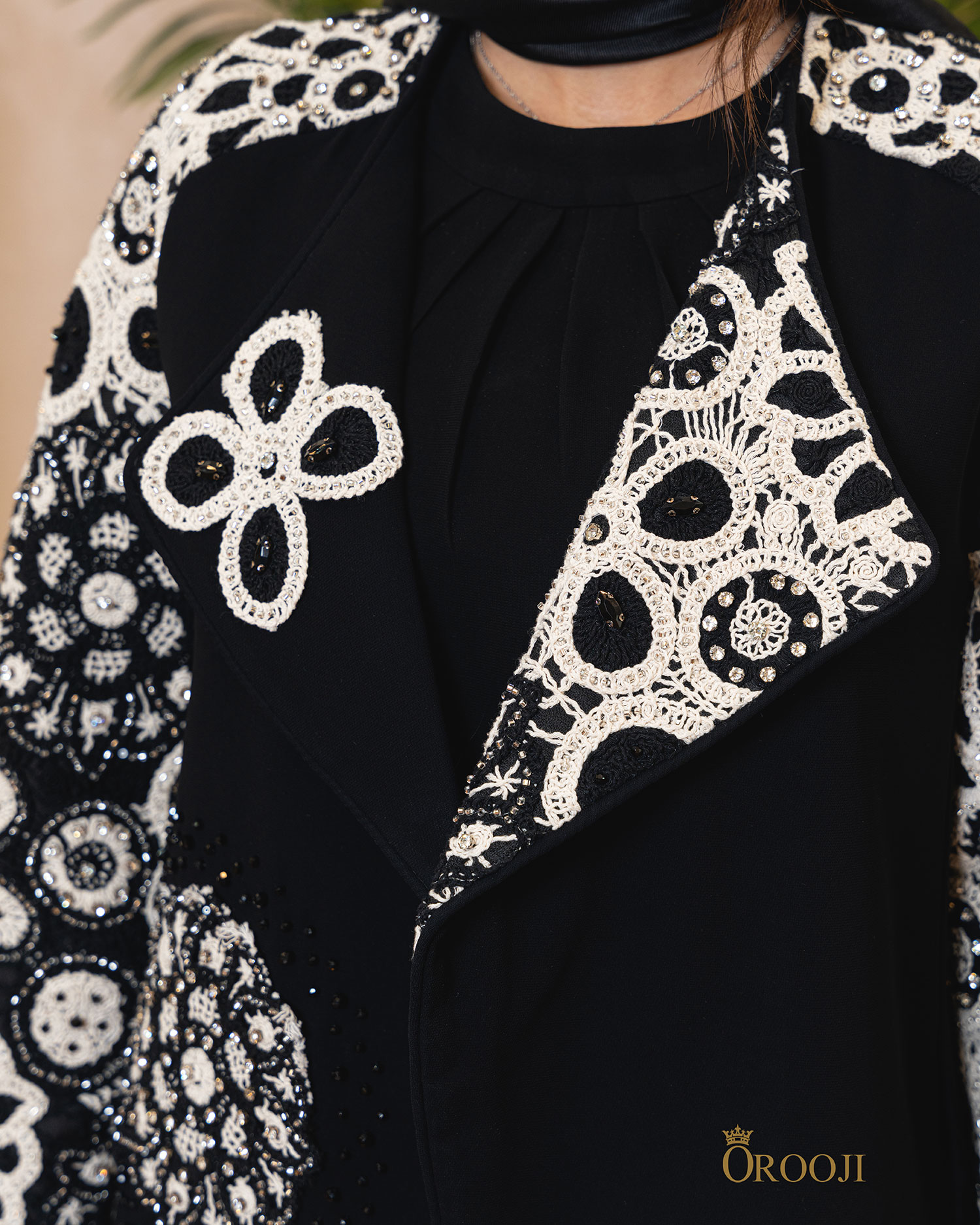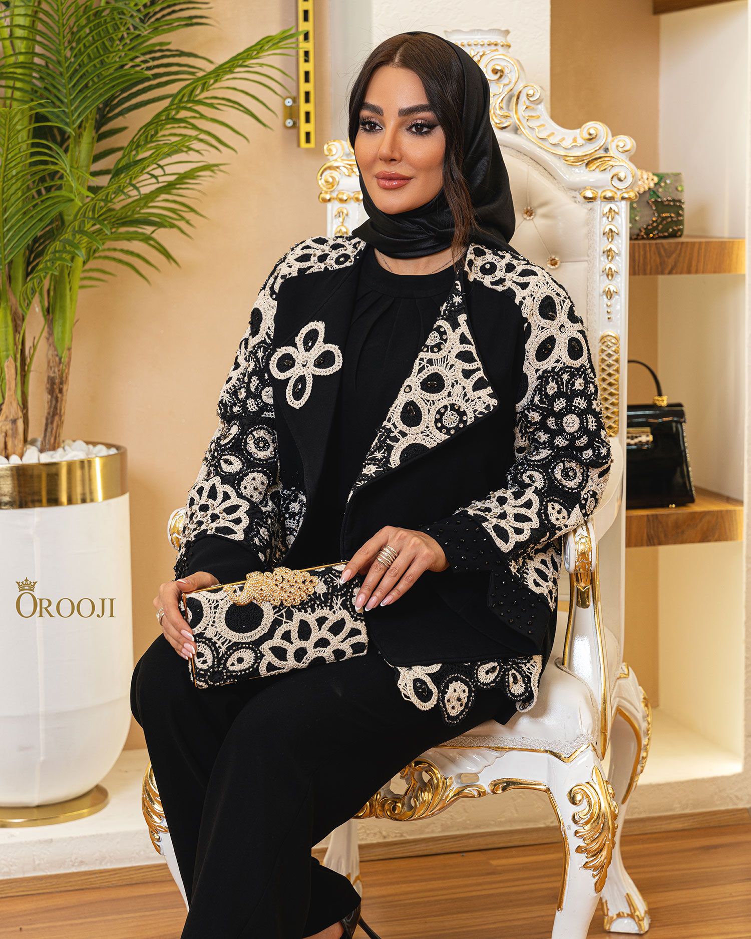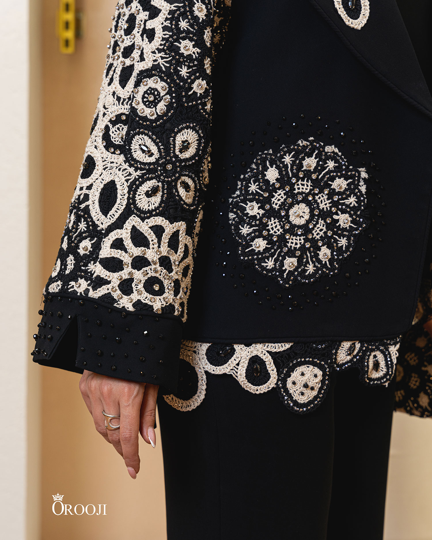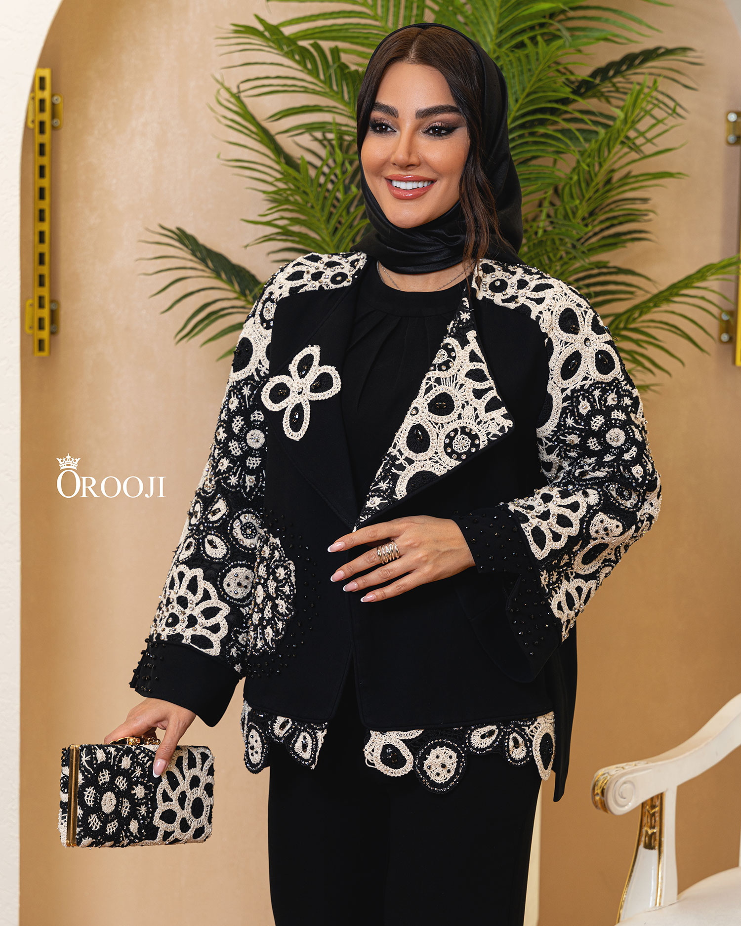 مانتوی «رگلان گیپور خورشید» تلفیقی هوشمندانه از ساختار مدرن و ظرافت هنر دست است که با برش رگلان، ایستایی نرم و وقارمند را روی اندام ایجاد میکند. استفاده از گیپورهای برجسته با نقوش دایرهای الهامگرفته از خورشید، در تضاد چشمنواز با زمینهی مشکی پارچه، عمق بصری و هویت لوکسی به طراحی بخشیده است. جانمایی دقیق نقوش گیپور در سرشانهها، آستینها و لبهها، همراه با تزیینات ظریف مهرهدوزی، نشان از دقت بالا در طراحی و اجرای این اثر دارد. یقه و جلوی مانتو با خطوط تمیز و مینیمال، تعادل کاملی میان شلوغی کنترلشدهی گیپور و سادگی بدنه ایجاد کرده و آن را به انتخابی شاخص برای استایلهای رسمی و مجلسی تبدیل میکند؛ مانتویی که همزمان قدرت، ظرافت و اصالت را به نمایش میگذارد