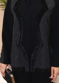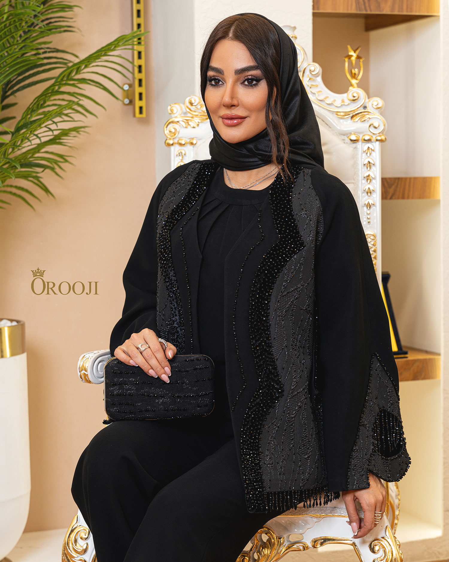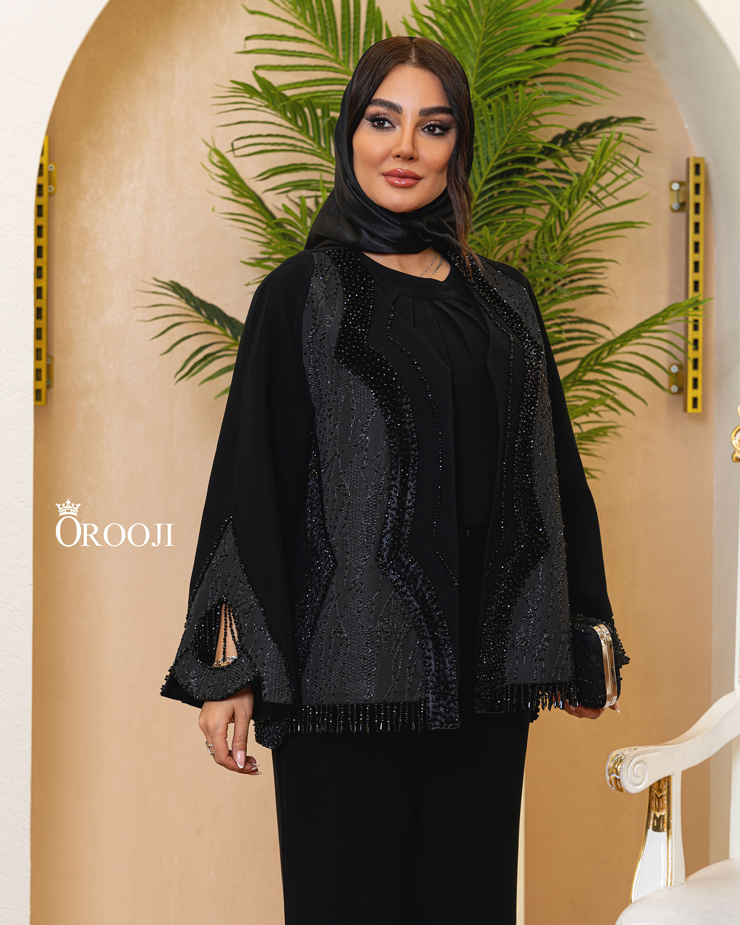 طرح «آرال آستانه» یک کتمانتوی کوتاهِ مزونی با شخصیت کاملاً فشن و مجلسی است که بازیِ متریال در آن نقش اصلی را دارد: در جلوی کار، ژاکارد ترک با بافت برجسته و درخشش کنترلشده قرار گرفته و مثل یک پنل لوکس، فرم جلوتنه را قاب میگیرد؛ در مقابل، آستینها عمدتاً از کرپ درجهیک کنزو اجرا شدهاند تا روی دست ریزش تمیز و ایستایی شیک داشته باشند. سرآستینها ژاکارد شده تا ارتباط بصری با جلوتنه حفظ شود و در کنار آن، نوارهای جلو با کرپ بهعنوان فریمِ تمیزکاری کار شدهاند. جذابترین امضای طراحی، نوار مخملِ جلوی مانتو است که روی آن جواهردوزی انجام شده و یک خطِ درخشانِ عمودی میسازد؛ همین خط، قد را کشیدهتر نشان میدهد و حس “لوکسِ آرام” ایجاد میکند. فرم آستینها آزاد و فون با برش تزئینی/چاک ظریف است که حرکت دست را چشمگیرتر میکند. یقه این مدل «یقه گردِ بدون یقه (Collarless Round Neck)» است؛ یعنی یقه حالت گرد و مینیمال دارد و با همان فریم و نوارهای جلویی (بهخصوص مخمل جواهردوز) تمیز و لوکس پرداخت شده، بدون اینکه یقهی برگشته یا بلیزر داشته باشد. قد جلو 66، قد پشت 70 و قد آستین 60 سانتیمتر است و این اختلاف قدِ پشت، به فرم کت ایستایی حرفهایتر و پوشانندگی شیکتری میدهد.