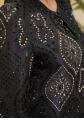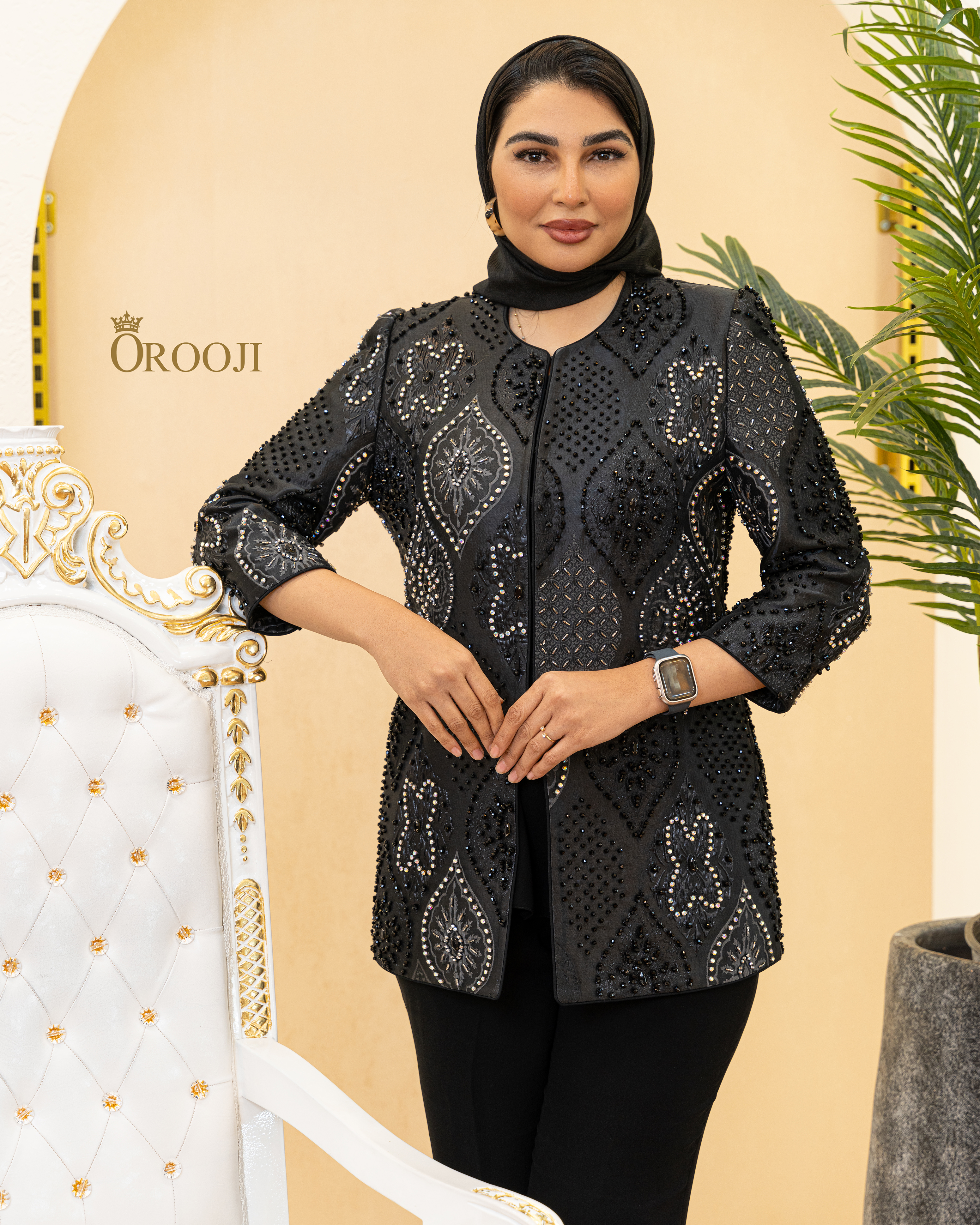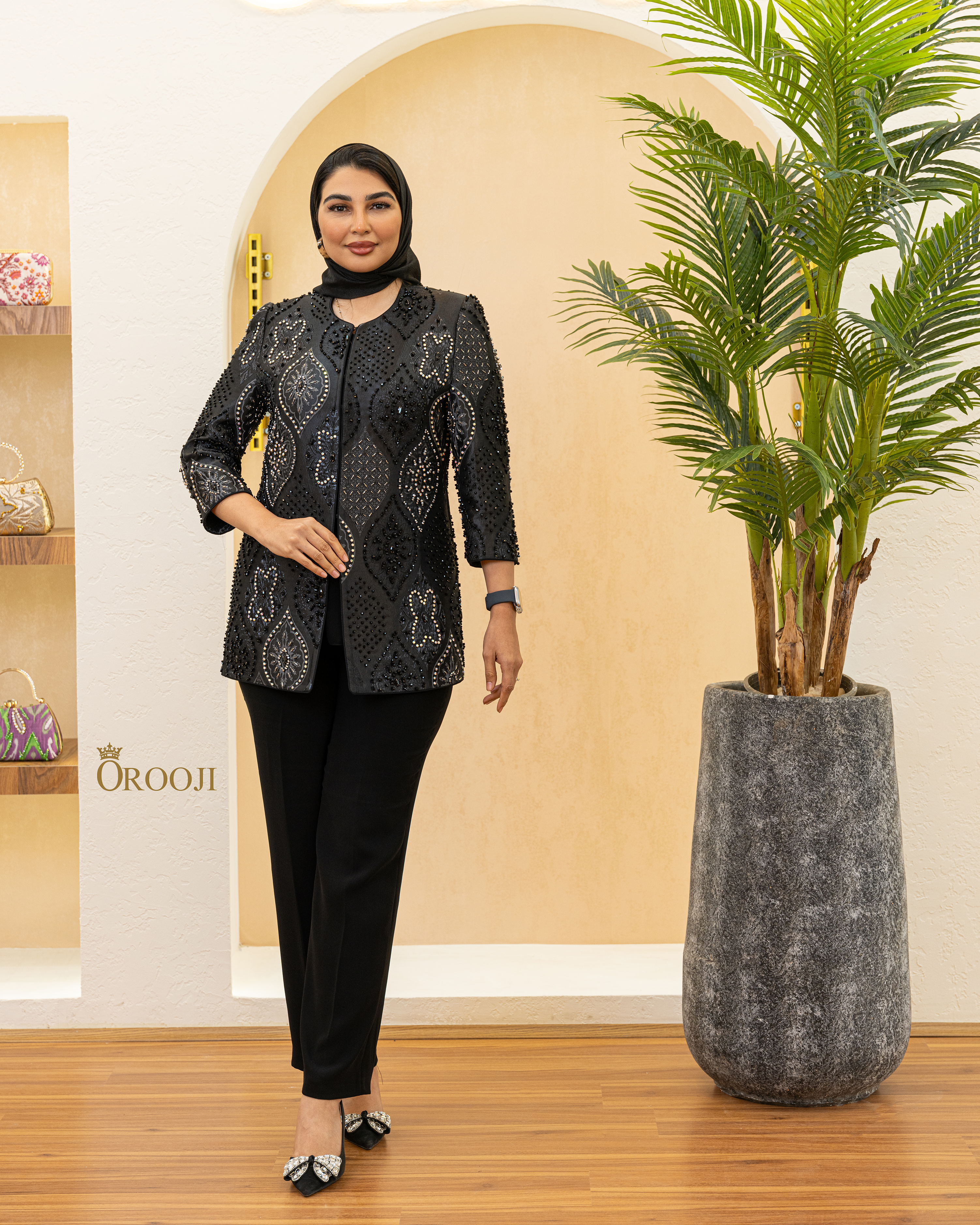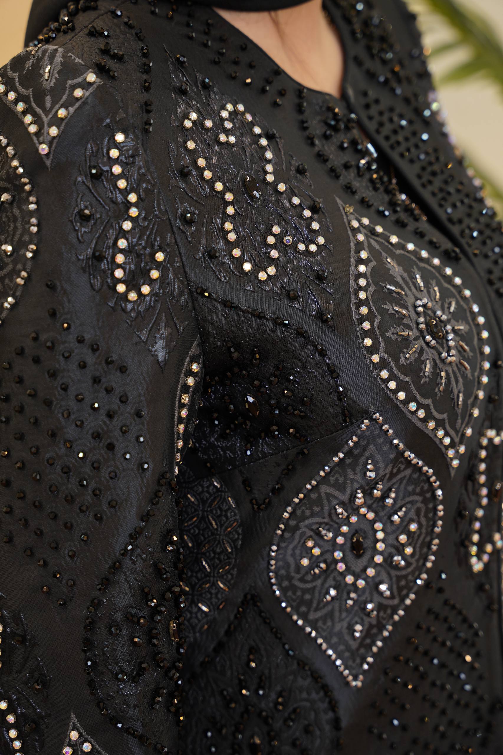 تمام سنگدوزیها با دست و با سنگهای اورجینال کریستالی انجام شدهاند؛ هر بخش از پارچه با رنگ و نور متفاوت میدرخشد و جلوهای عمیق و سهبعدی ایجاد میکند.