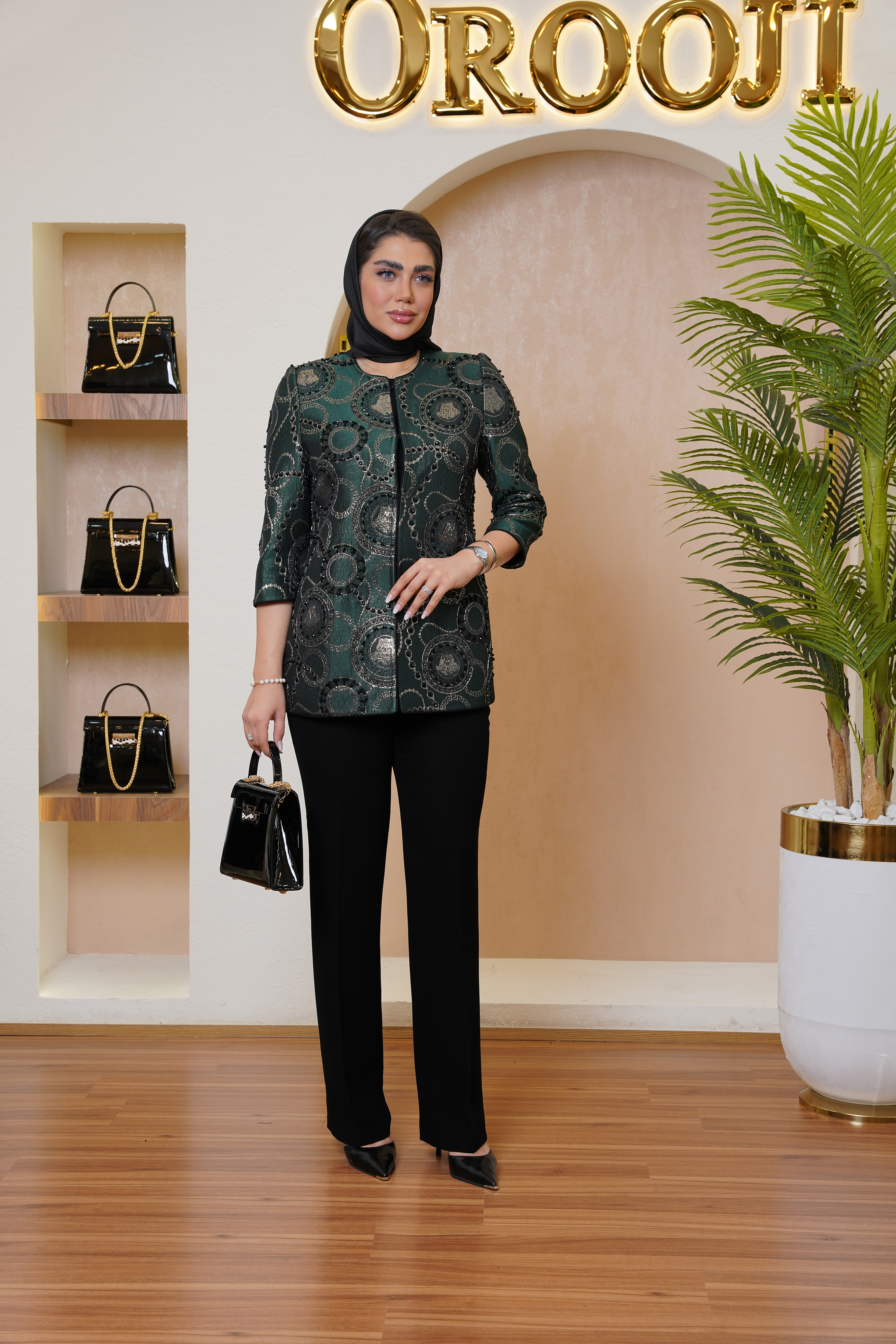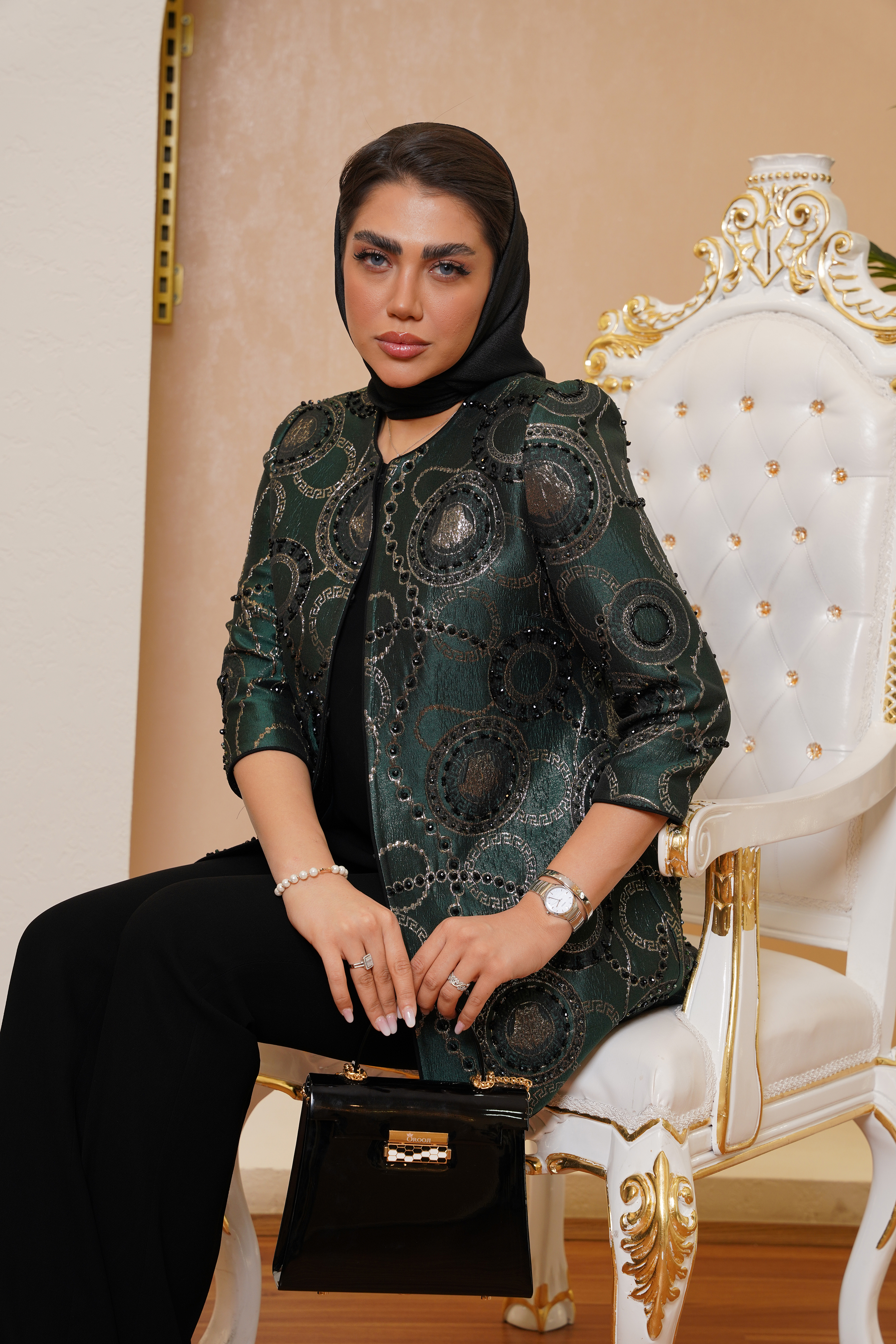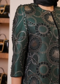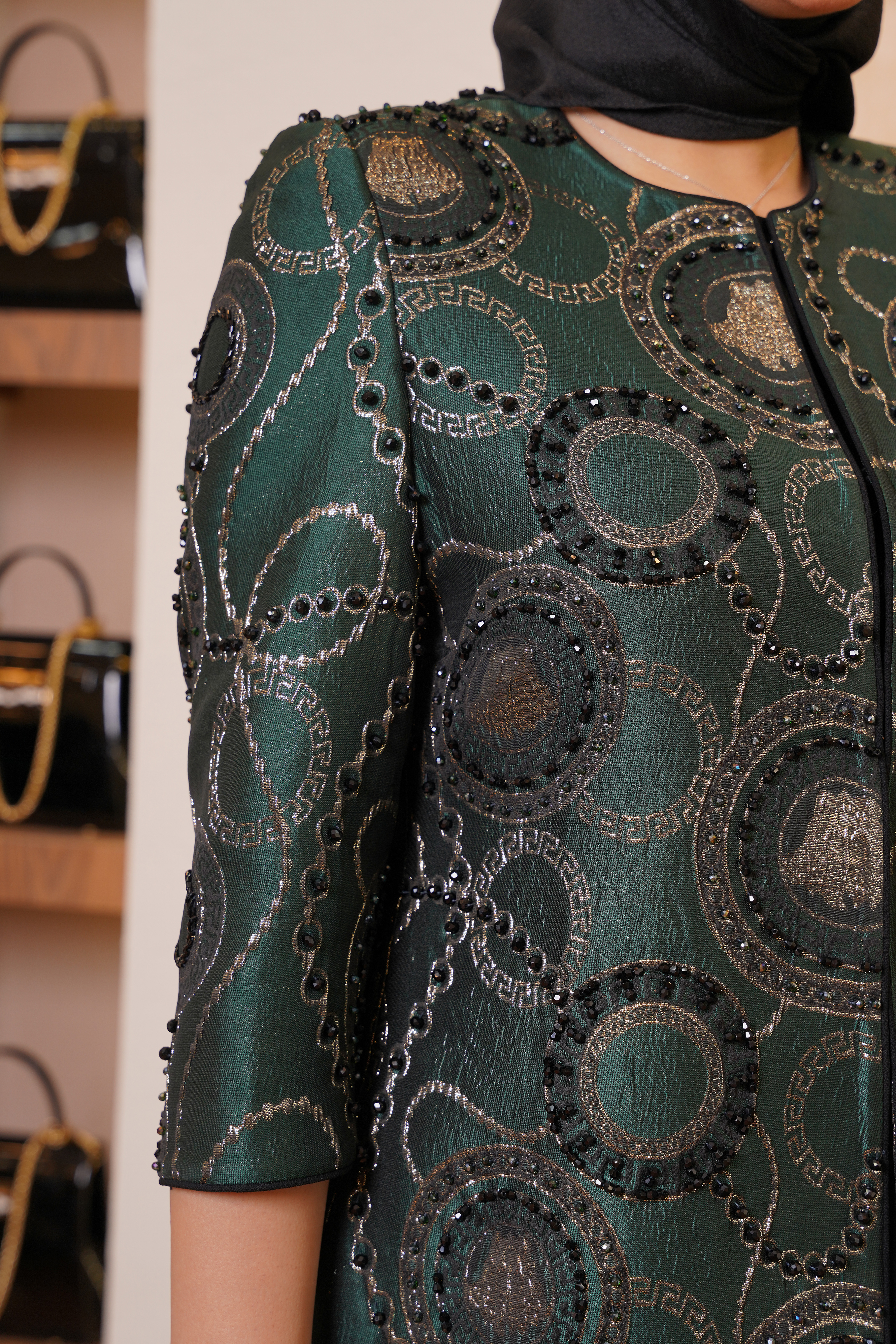 مانتوی ژاکارد ورساچ یکی از طراحی‌های لوکس برند عروجی است که تلفیقی از دوخت دقیق، پارچه‌ای خاص و سنگ‌دوزی ظریف را در خود جای داده است. بافت پارچه، الهام‌گرفته از نقوش کلاسیک ورساچه است که جلوه‌ای اشرافی و چشمگیر به استایل می‌بخشد. استفاده از طیف سبز تیره متالیک در کنار دوخت مرواریدی مشکی و نقره‌ای، ترکیبی از اصالت و مدرنیته را خلق کرده است.