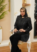 مانتو خاتون یک قطعهی کاملاً ساختارمند و «شبپوش» است که بر پایهی یک پارچهی مشکی با بافت ریزِ شبکهای/ژاکاردی ساخته شده و روی آن موتیفهای داماسکِ برجسته با لایهگذاری دقیق اجرا شدهاند؛ برجستگیها فقط تزئینی نیستند، با پخشِ حسابشدهی کریستال روی مسیرِ نقوش، عمق بصری ایجاد میکنند و نور را بهصورت نقطهای و کنترلشده برمیگردانند. سرشانهها کمی حجیم و فرمگیرند تا بالاتنه را مقتدر نشان دهد، در حالیکه خطوط روی تنه با تقارن و تداوم طرحها، سیلوئت را جمعوجور و تمیز نگه میدارد.
