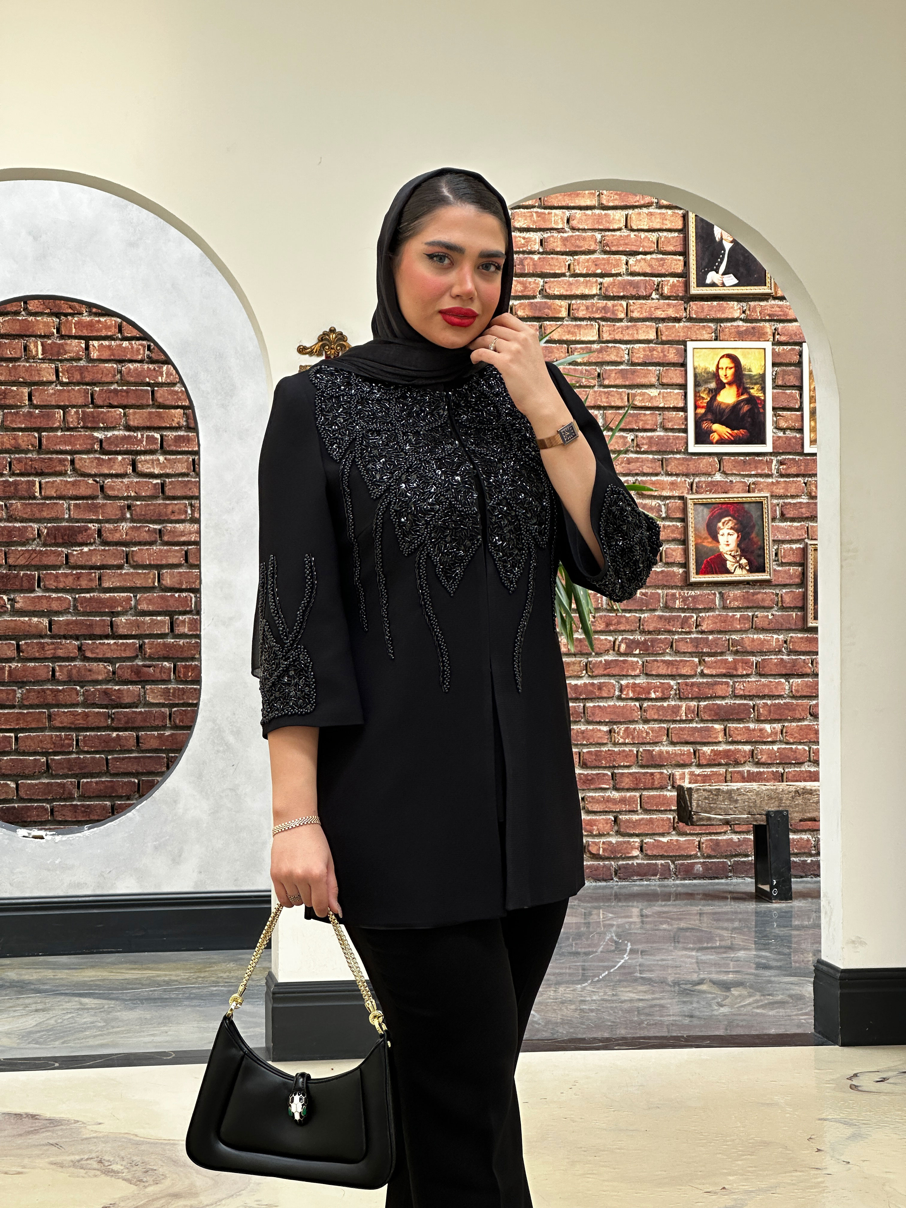 مانتو مانیا یکی از کارهای خاص مزون عروجی است که با پارچهی کرپ مازراتی درجهیک و سنگدوزی مشکی ظریف روی یقه، سرشانه و آستین طراحی شده است. فرم ایستایی بسیار شیک، دوخت مزونی تمیز و جلوهای کاملاً مجلسی به این کار داده است. این مانتو با قد ۷۷ سانتیمتر و آستین سهربع طراحی شده و برای مجالس، مراسم رسمی و استایلهای شب گزینهای کاملاً حرفهای محسوب میشود.