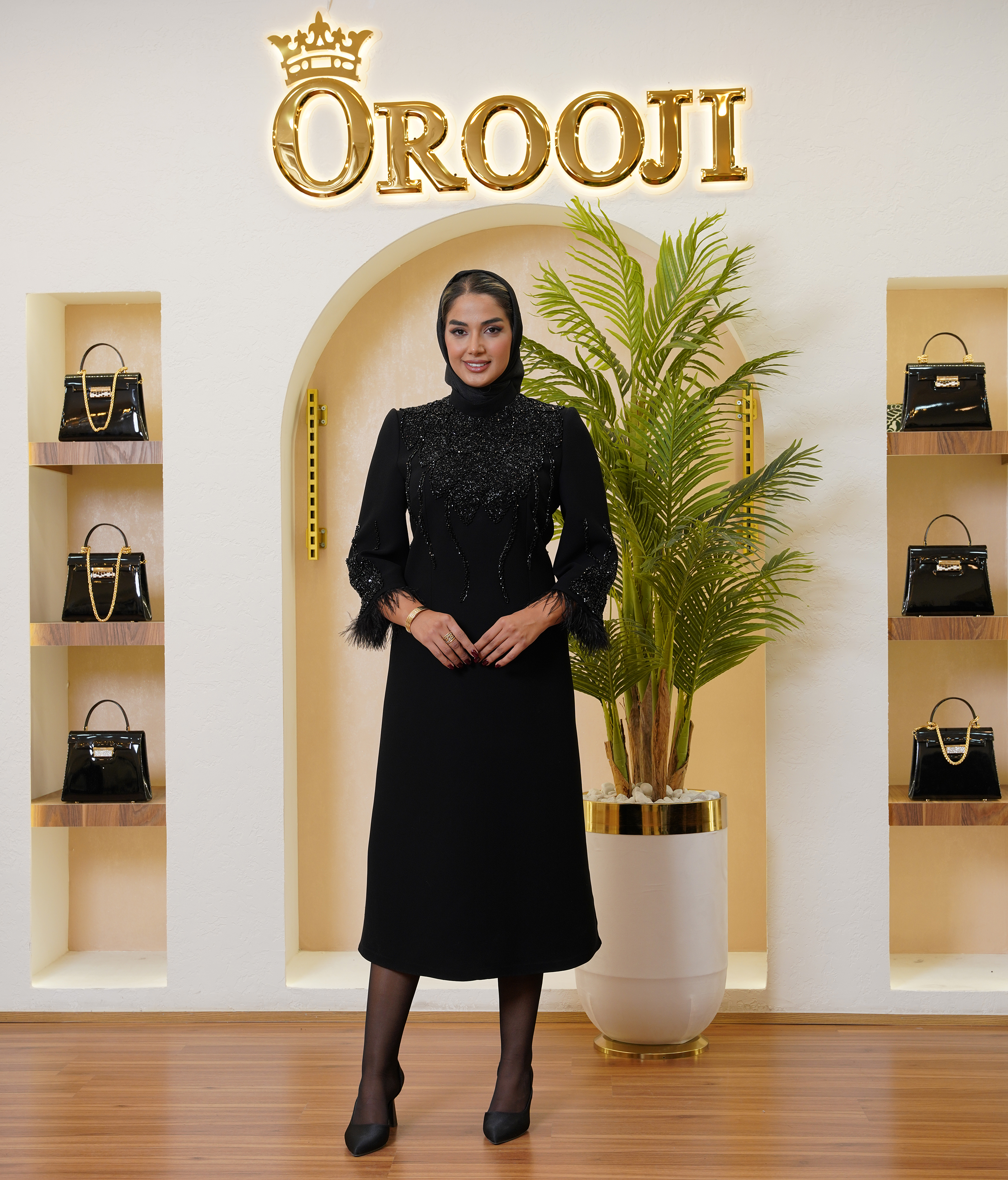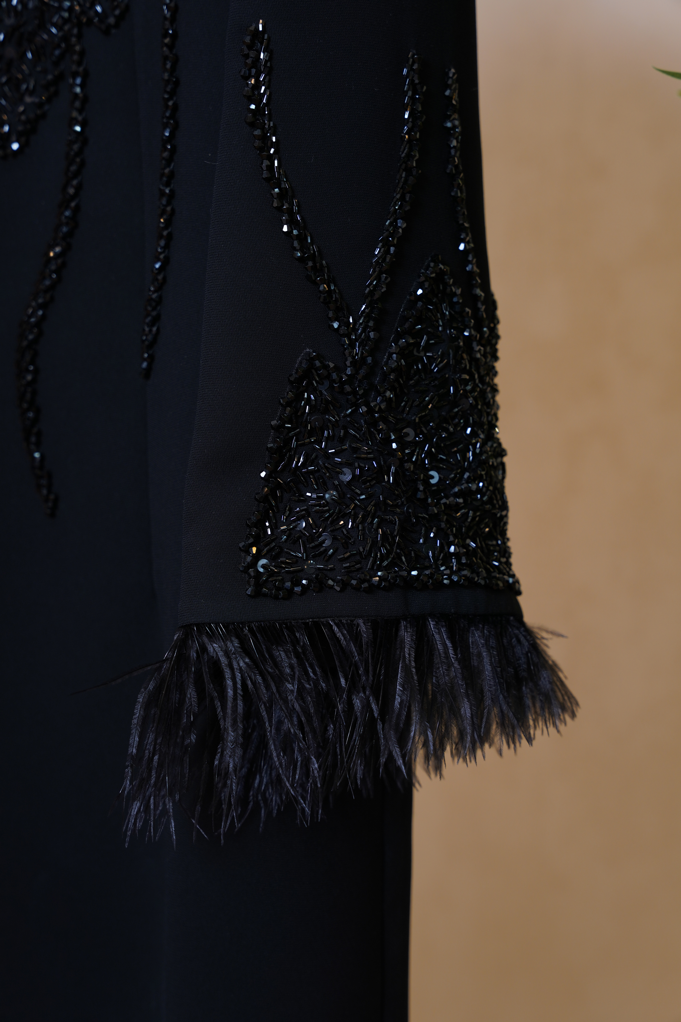 قد کار ۱۳۵ سانتیمتر و قد آستین ۶۰ سانتیمتر بوده و بخش پایینی آستین با پر مشکی طبیعی تزئین شده تا حس نرمی و لطافت به طراحی اضافه شود.