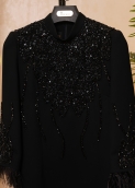سنگدوزیهای ظریف روی شانه، یقه و آستین با ترکیب کریستال و منجوق مشکی انجام شدهاند؛ کاری دقیق و پرجزئیات که هر قطعه از آن حاصل ساعتها هنر دست است.