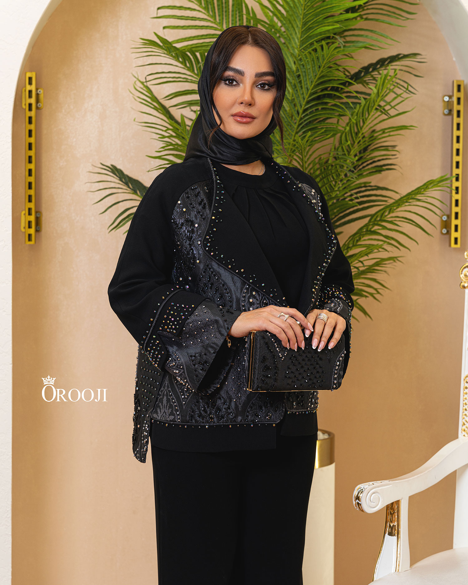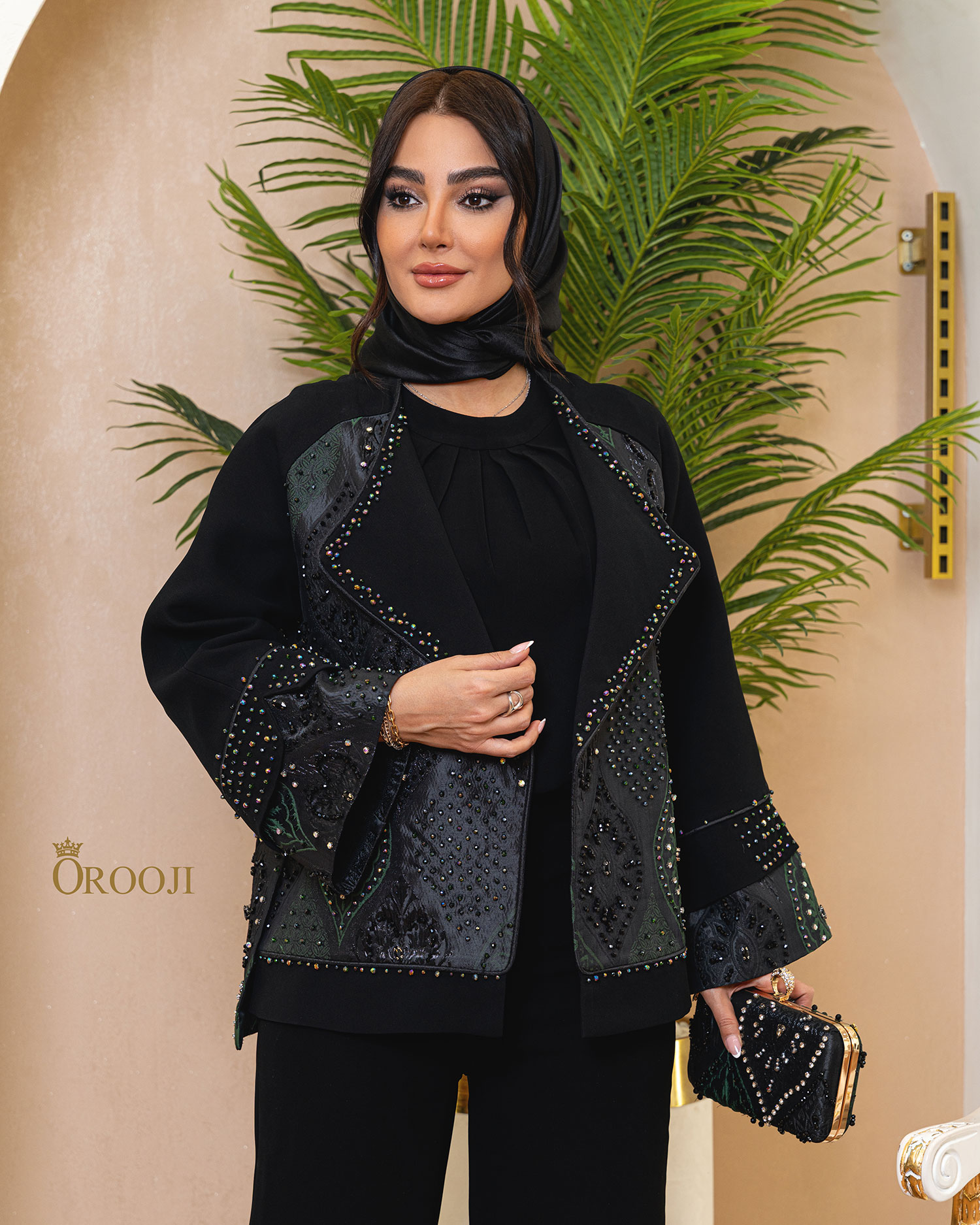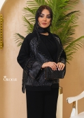 مانتو رگلان «گنبد» با بیسِ مشکیِ یکدست طراحی شده تا تمام تمرکز روی خرجکارِ ژاکاردِ نقشدار و جواهردوزیهای ظریف بنشیند؛ فرم کت کوتاه و مزونی آن، با سرشانهی رگلان، تنخور را نرم و فاخر میکند و در عین حال روی بدن “ایستایی” لوکس میدهد. یقه به شکل یقهی بلیزر/شالگونهی باز طراحی شده؛ لبهها با ردیف جواهردوزی منظم قاب گرفتهاند تا حس “فریم طلایی” روی یک زمینهی مشکی ایجاد شود. آستینها با کات رگلان و سرآستینِ کلوش (زنگولهای) تمامکنندهی استایلاند؛ جواهردوزی لب آستین مثل یک خط نور، حرکت دست را چشمگیر میکند. سه ترکیبرنگِ خرجکار (در تونهای تیره و اشرافی مثل نوکمدادی/یشمی-زمردی/بنفشِ عمیق) باعث میشود هر رنگ، یک شخصیت جدا داشته باشد: یکی مینیمالتر و رسمیتر، یکی جسور و خاصپسند، و یکی کلاسیکِ شیک برای استایلهای شب.