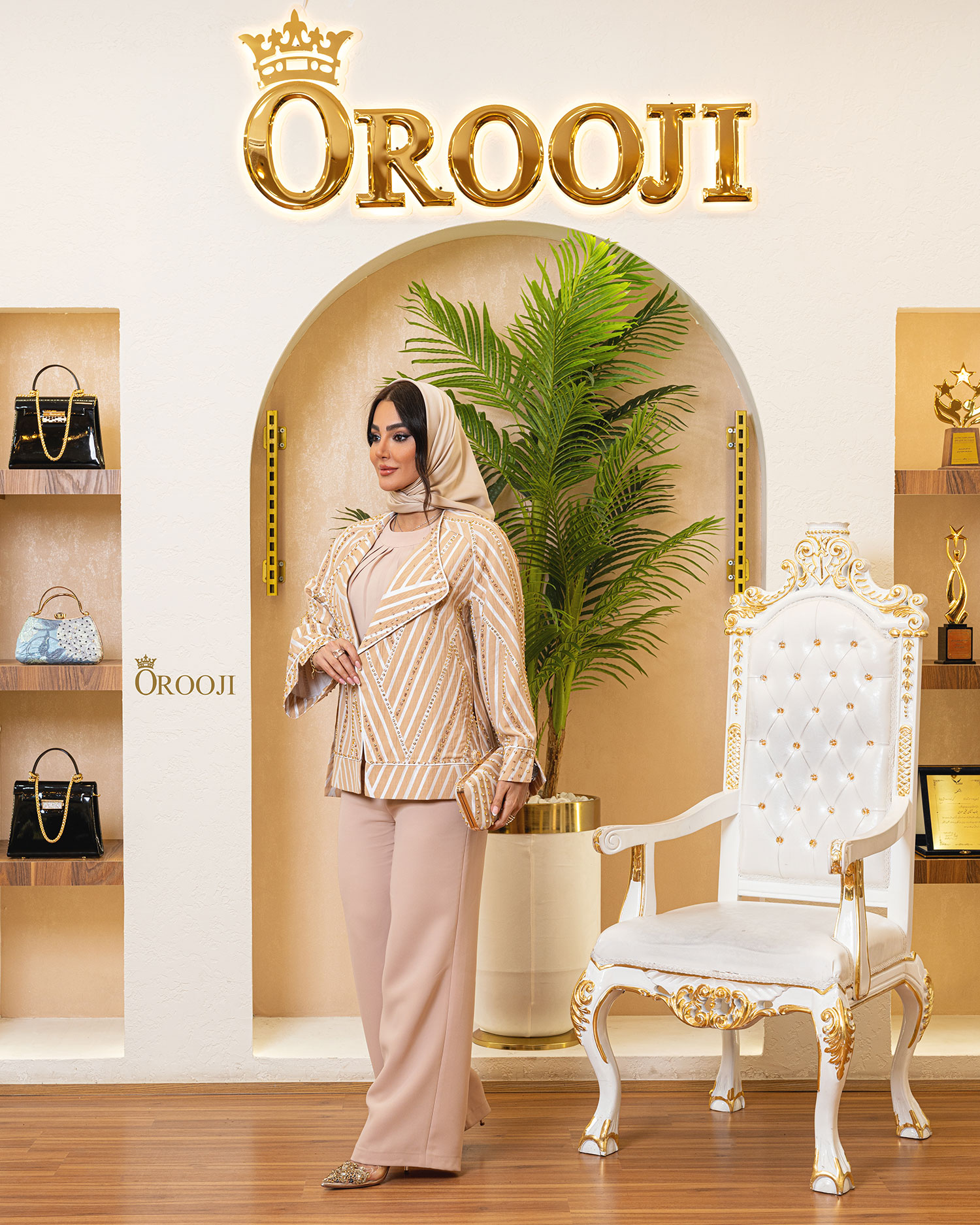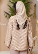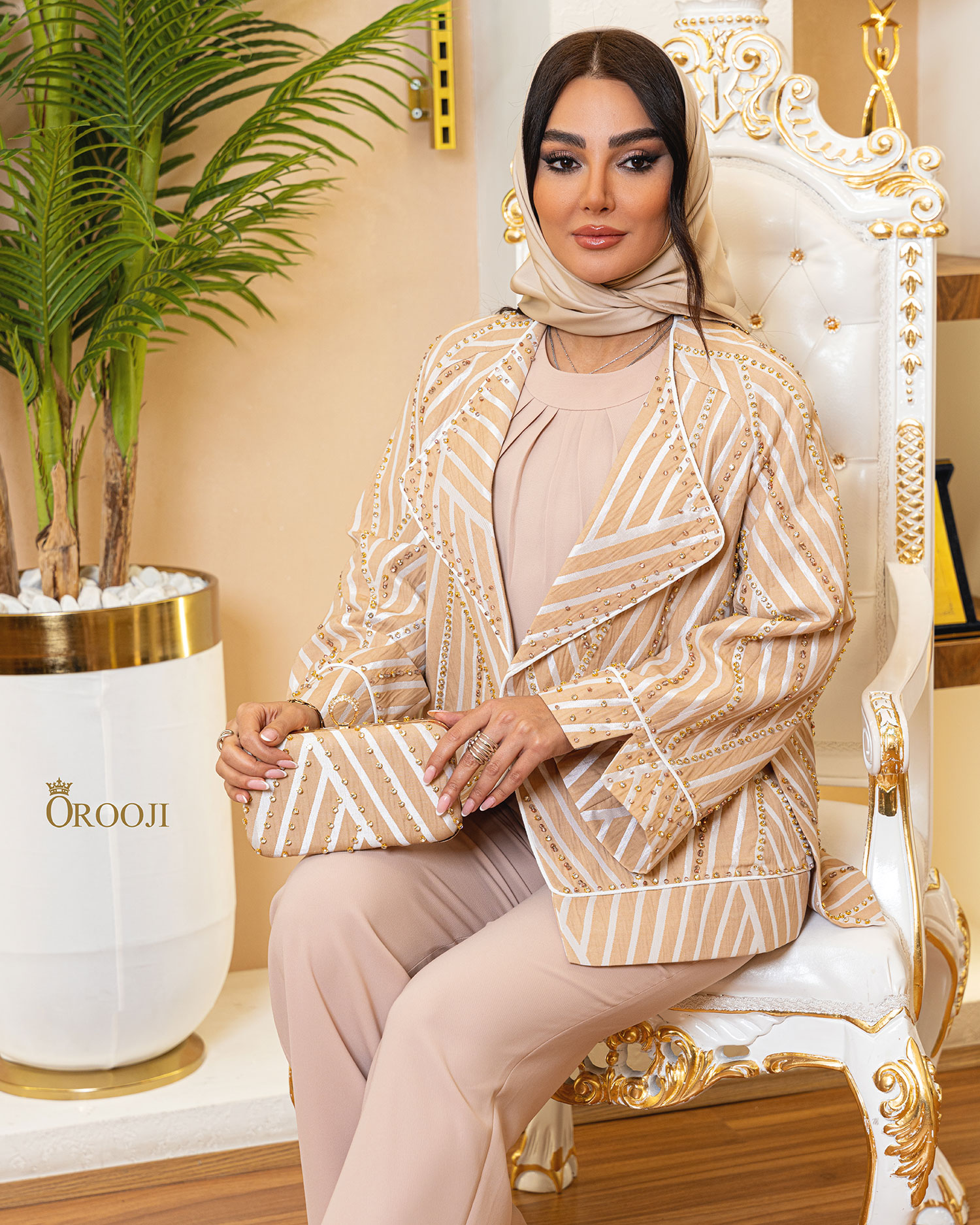 مانتو رگلان ژاکارد خطی، یک کت/رویه‌ی کوتاه با سیلوئت نیمه‌آزاد و شانه‌های نرم محور اصلی است که روی یک ست ساده و تک‌رنگ لایه‌گذاری شده تا تمام تمرکز روی «بافت، خطوط و کاردست» بماند. پارچه‌ی رویه حالت ژاکارد با رگه‌های مورب دارد و روی آن کریستال های ریز، مسیر برش‌ها و قاب‌بندی‌ها برجسته شده؛ همین باعث می‌شود کت در عین سادگی، کاملاً لوکس و مجلسی دیده شود. یقه‌ی پهن برگشته و جلوی آزاد، قاب صورت را باز و شیک می‌کند و سرآستین‌های پهن و پایین‌دوزی تمیز حس ساختار و کیفیت را بالا می‌برد. رنگ‌بندی‌ها هم هوشمندانه سه مود متفاوت می‌سازد: مشکی برای جلوه‌ی رسمی و مینیمالِ قوی، کرم/بژ راه‌راه با جزئیات طلایی برای حال‌وهوای گرم و مجلل، و سفید با دیتیل‌های نقره‌ای برای استایل روشن و مدرن؛ هماهنگی کیف با هر رنگ (کلاچ مشکی با فریم طلایی، کلاچ راه‌راه هم‌طرح، و کلاچ سفید) نقش نقطه‌ی تأکید را کامل کرده و خروجی را یک ست یکپارچه و ویترینی می‌کند.
