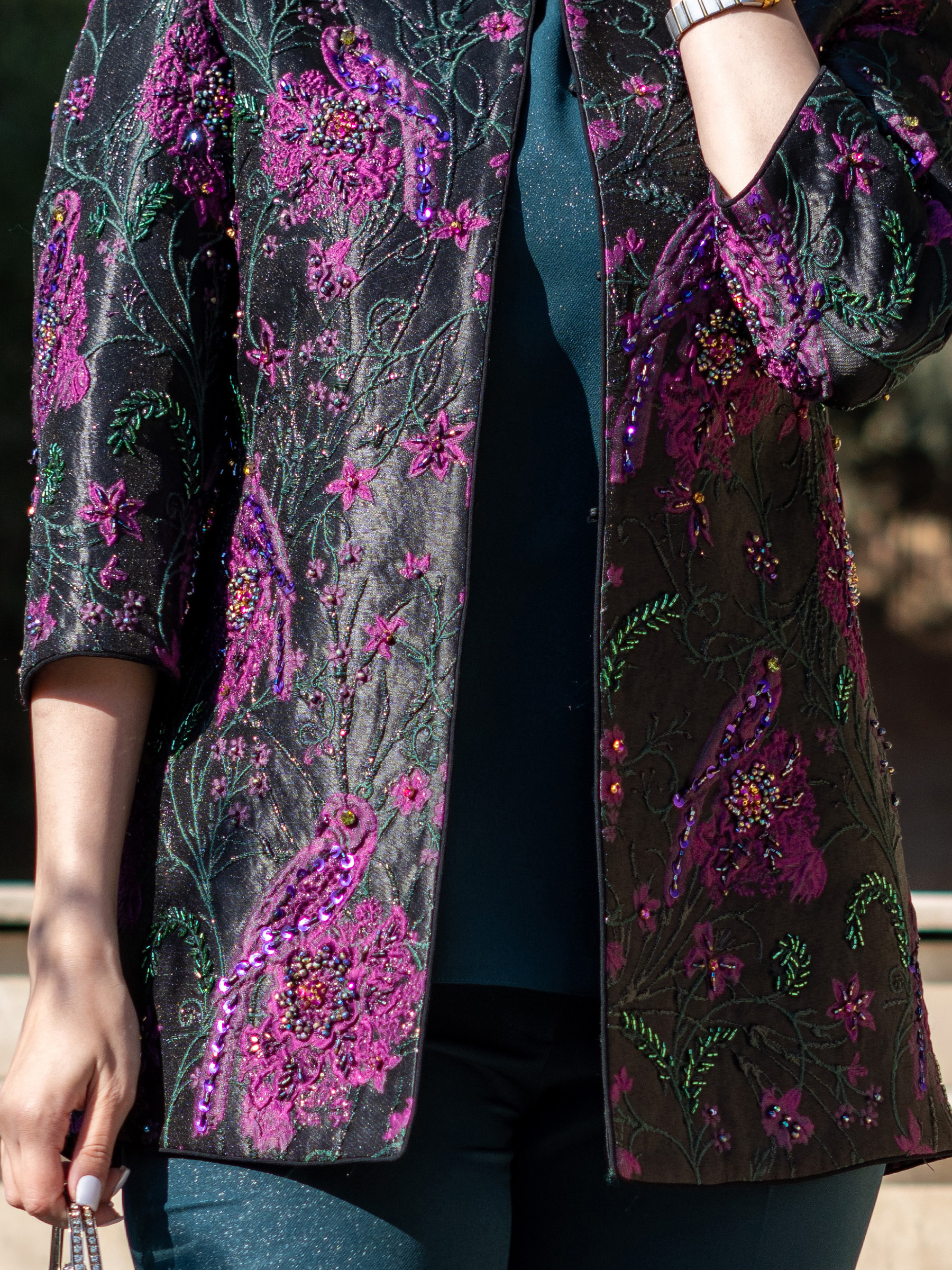 مانتو طوطی یکی از خاص‌ترین و هنری‌ترین طراحی‌های برند عروجی است؛ تلفیقی چشم‌نواز از ژاکارد ترک لوکس، رنگ‌های سبز زمردی و بنفش سلطنتی و بافت‌هایی که همچون یک تابلو نقاشی زنده روی پارچه نشسته‌اند.