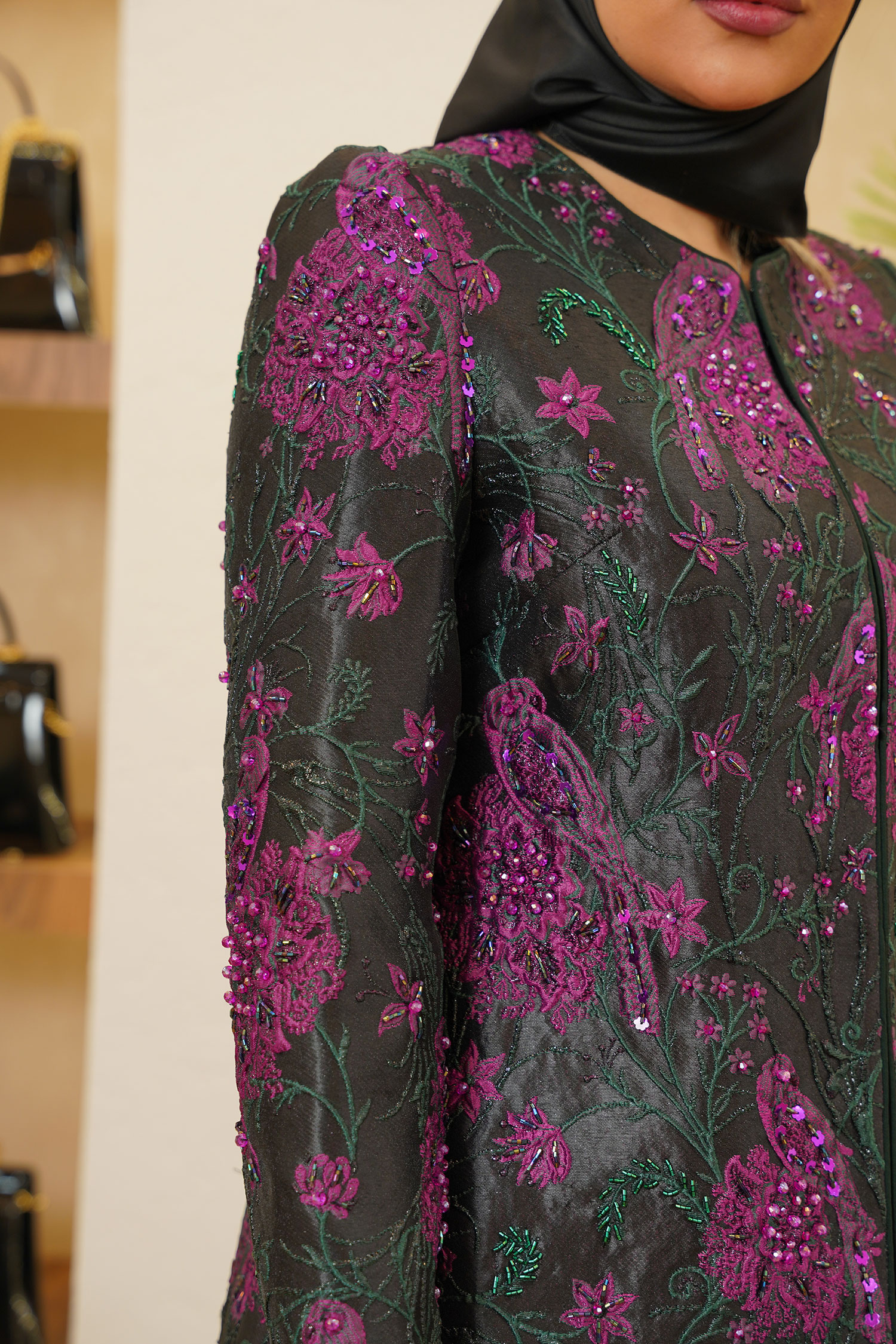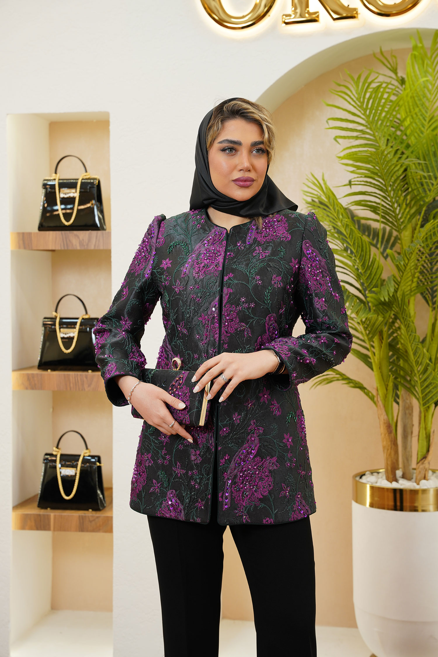 مانتو طوطی یکی از خاصترین و هنریترین طراحیهای برند عروجی است؛ تلفیقی چشمنواز از ژاکارد ترک لوکس، رنگهای سبز زمردی و بنفش سلطنتی و بافتهایی که همچون یک تابلو نقاشی زنده روی پارچه نشستهاند.