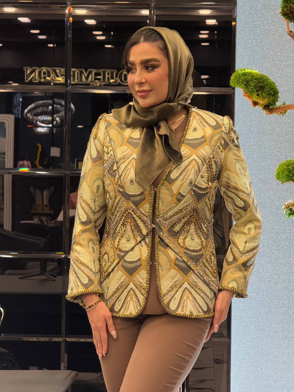 بهترین استایل برای کت طرح ژیله مغزی، ترکیب آن با شلوار راسته یا جذب کرم، نسکافه‌ای یا قهوه‌ای روشن است که تناژ رنگی کار را برجسته می‌کند. استفاده از کفش پاشنه‌دار ظریف در رنگ‌های نود، طلایی یا قهوه‌ای روشن، همراه با شال ساده در طیف‌های زیتونی، کرمی یا قهوه‌ای، جلوه مزونی و لوکس کت را کامل می‌کند. انتخاب کیف کوچک رسمی، اکسسوری طلایی و میکاپ گرم نیز این استایل را برای مهمانی، مراسم رسمی و عکس‌برداری حرفه‌ای کاملاً یک‌دست و شیک می‌سازد.