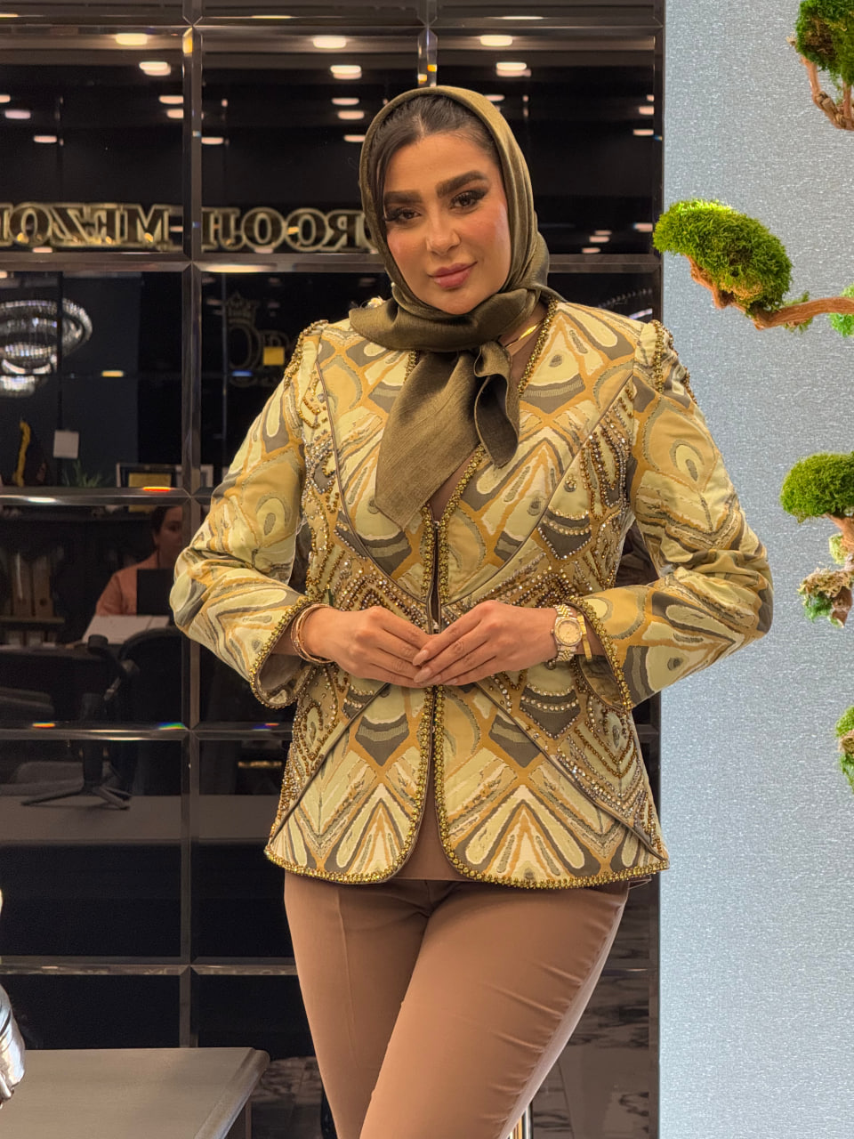 طرح ژیله مغزی یکی از مدل‌هایی است که ترکیب هنر دوخت مزونی و پارچه ژاکارد ترک را در اوج زیبایی نشان می‌دهد. این مدل با الگوی کاملاً اختصاصی مزون عروجی طراحی شده و روی پارچه، نگین‌کاری‌های منظم، مغزی‌دوزی تمیز و برش‌های هلالی کاملاً هماهنگ به چشم می‌خورد. قد 65 سانتی‌متر، آستین سه‌ربع، برش‌های فرم‌دهنده در پهلو و سرشانه و استفاده از لایه‌کشی حرفه‌ای باعث شده تنخور این مدل بسیار ایستاده، شیک و فاخر باشد.