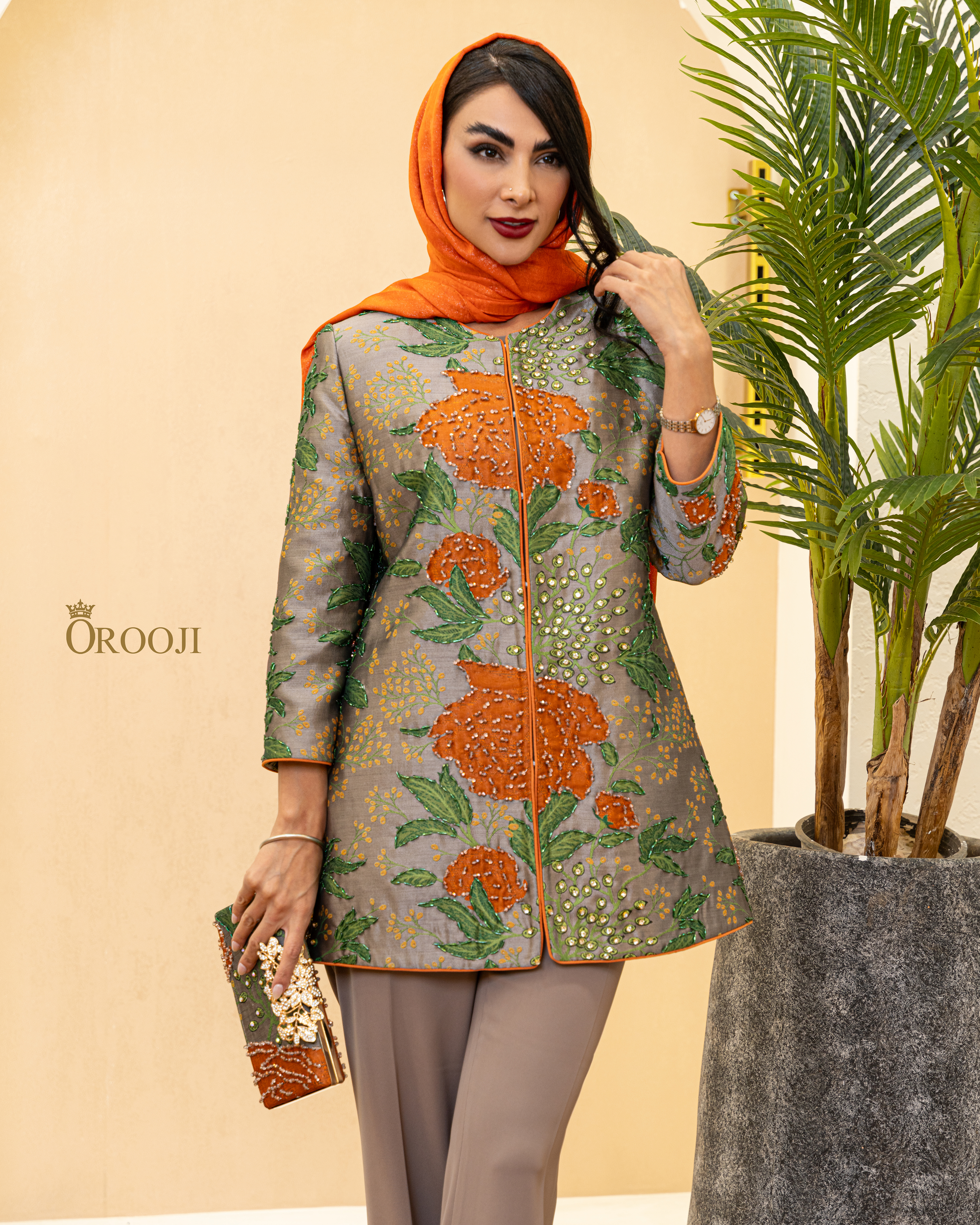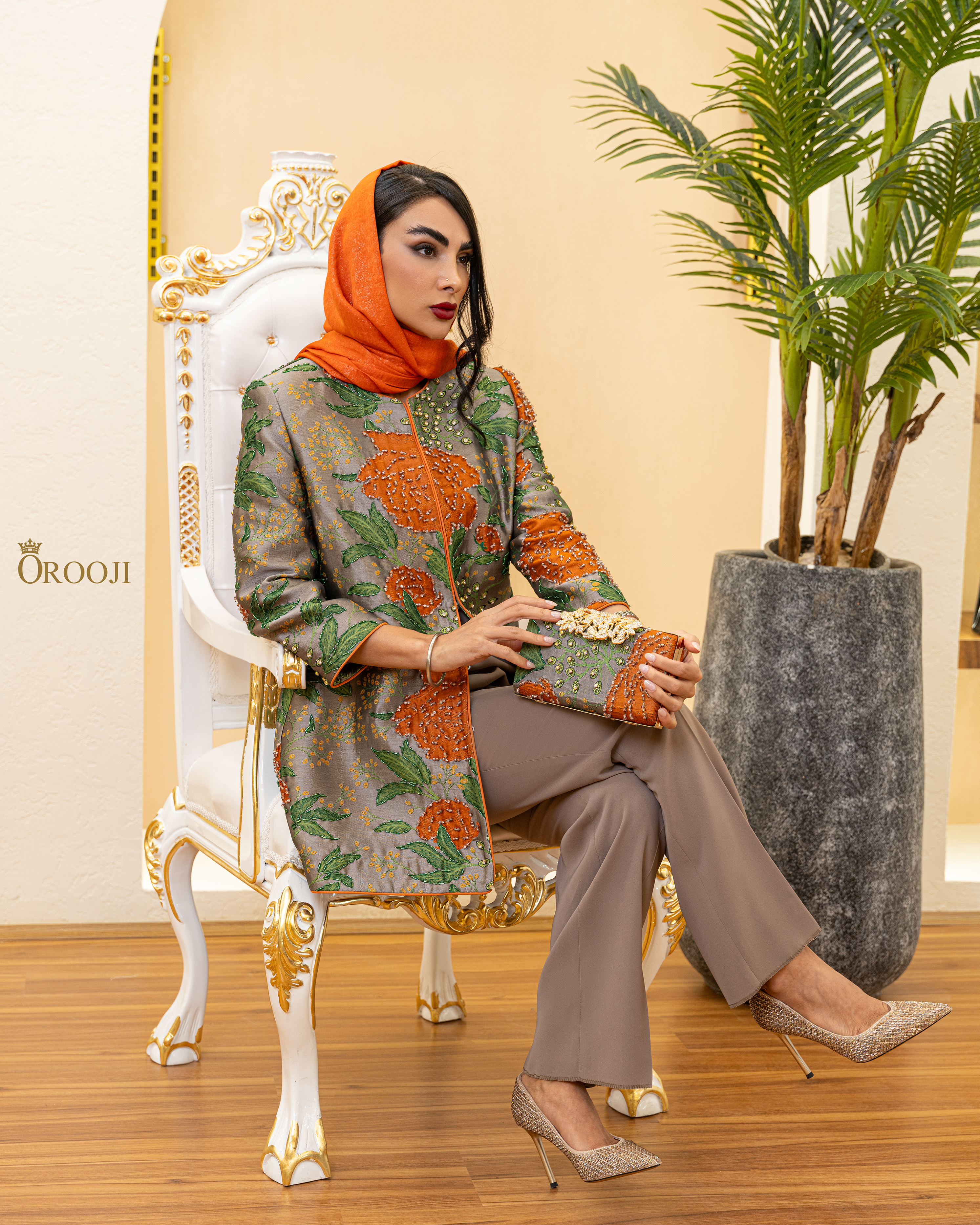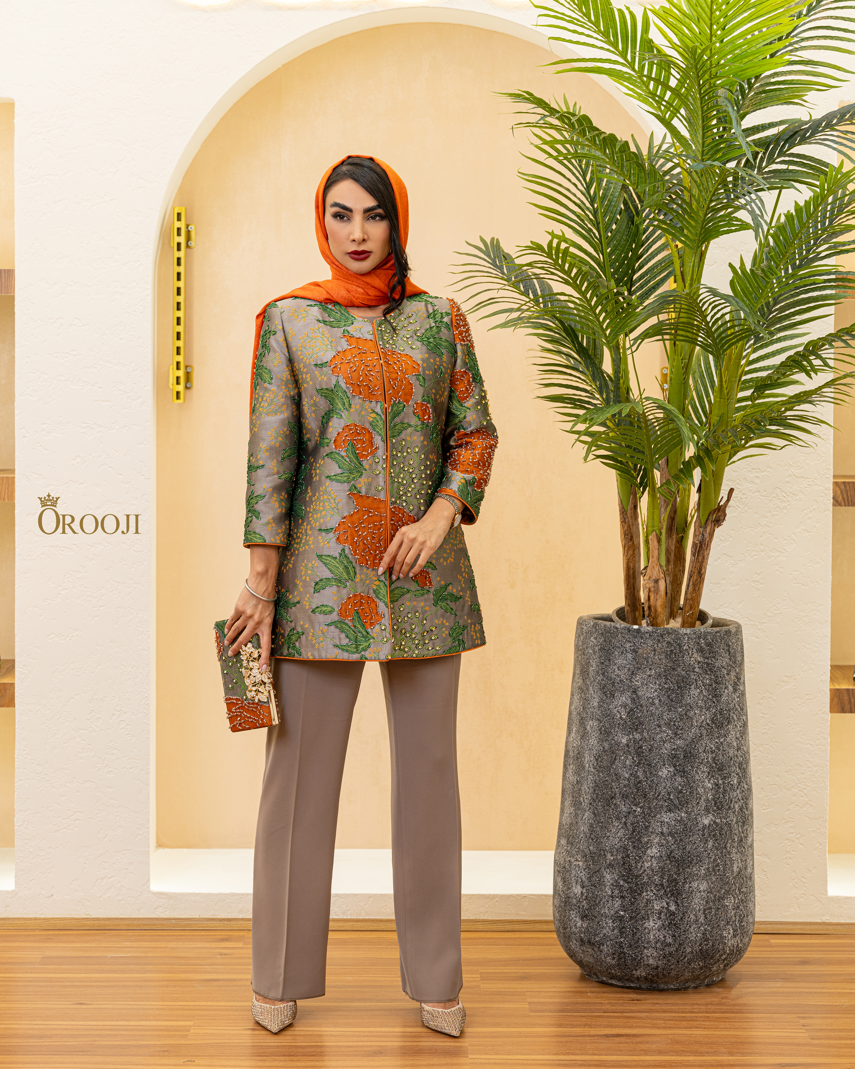 مانتو طرح آرنیا یکی از کارهای خاص و متفاوت مزون عروجی است؛ با پارچه‌ی ژاکارد ترک و سنگ‌دوزی‌های اورجینال که با ظرافت تمام به‌صورت دستی کار شده‌اند. طراحی چشمگیر گل‌ها و رنگ‌بندی منحصربه‌فرد، این مدل را به یکی از گزینه‌های خاص برای استایل‌های رسمی و لاکچری تبدیل کرده است.