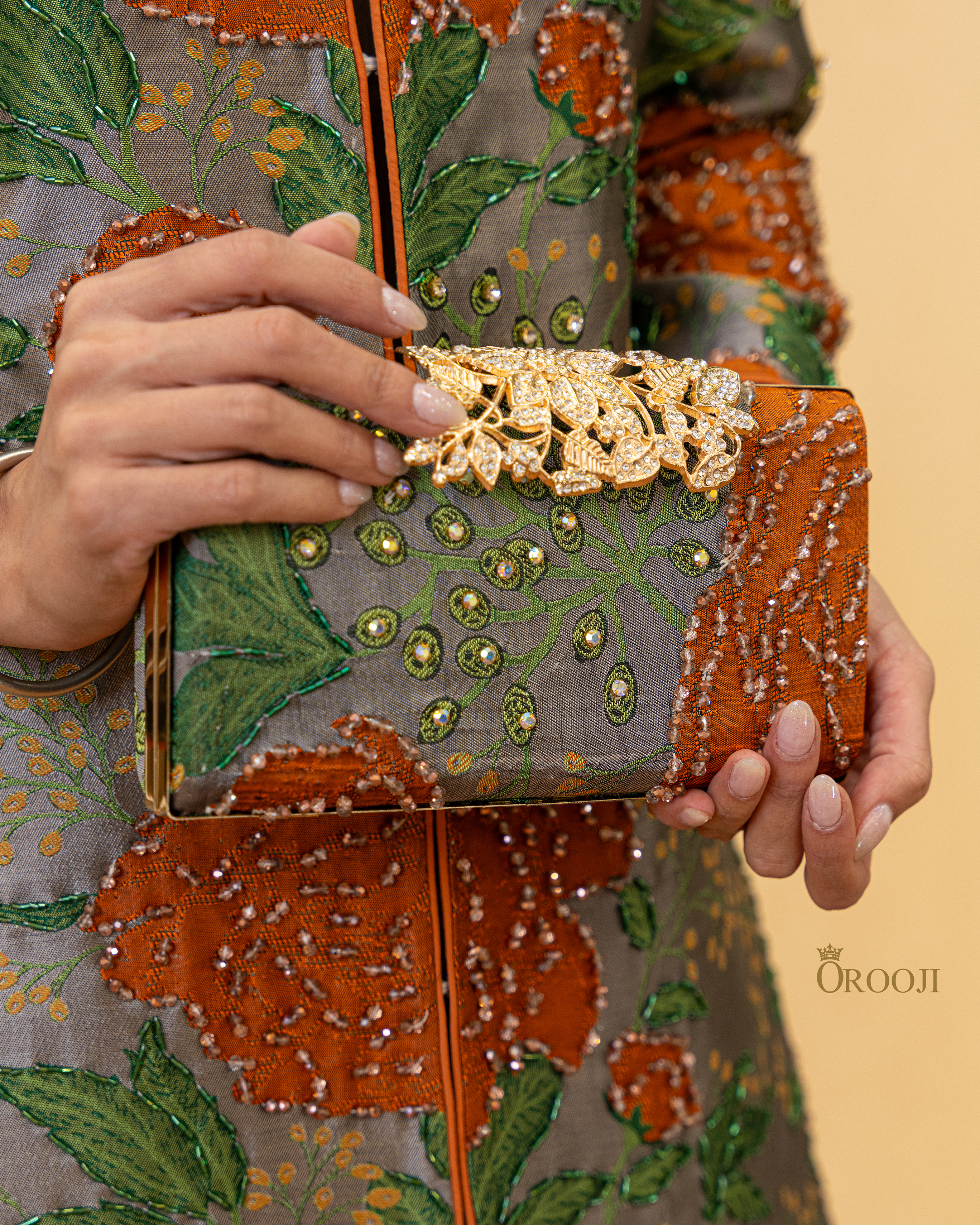 سنگدوزی‌های دست‌دوز اورجینال روی گل‌های بزرگ و برگ‌های سبز، با دانه‌کاری‌های طلایی و کریستالی، جلوه‌ای سه‌بعدی و خاص ایجاد کرده است.