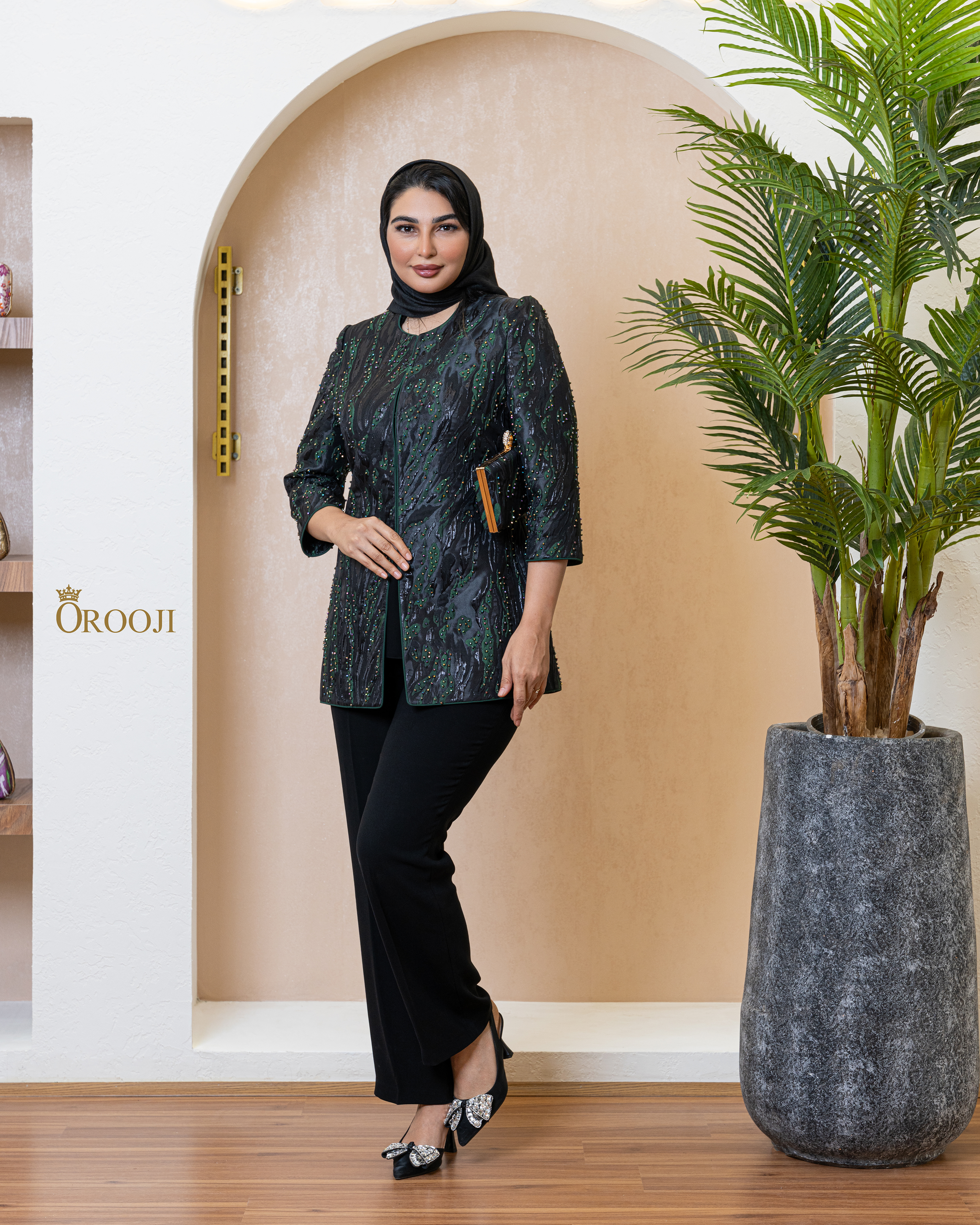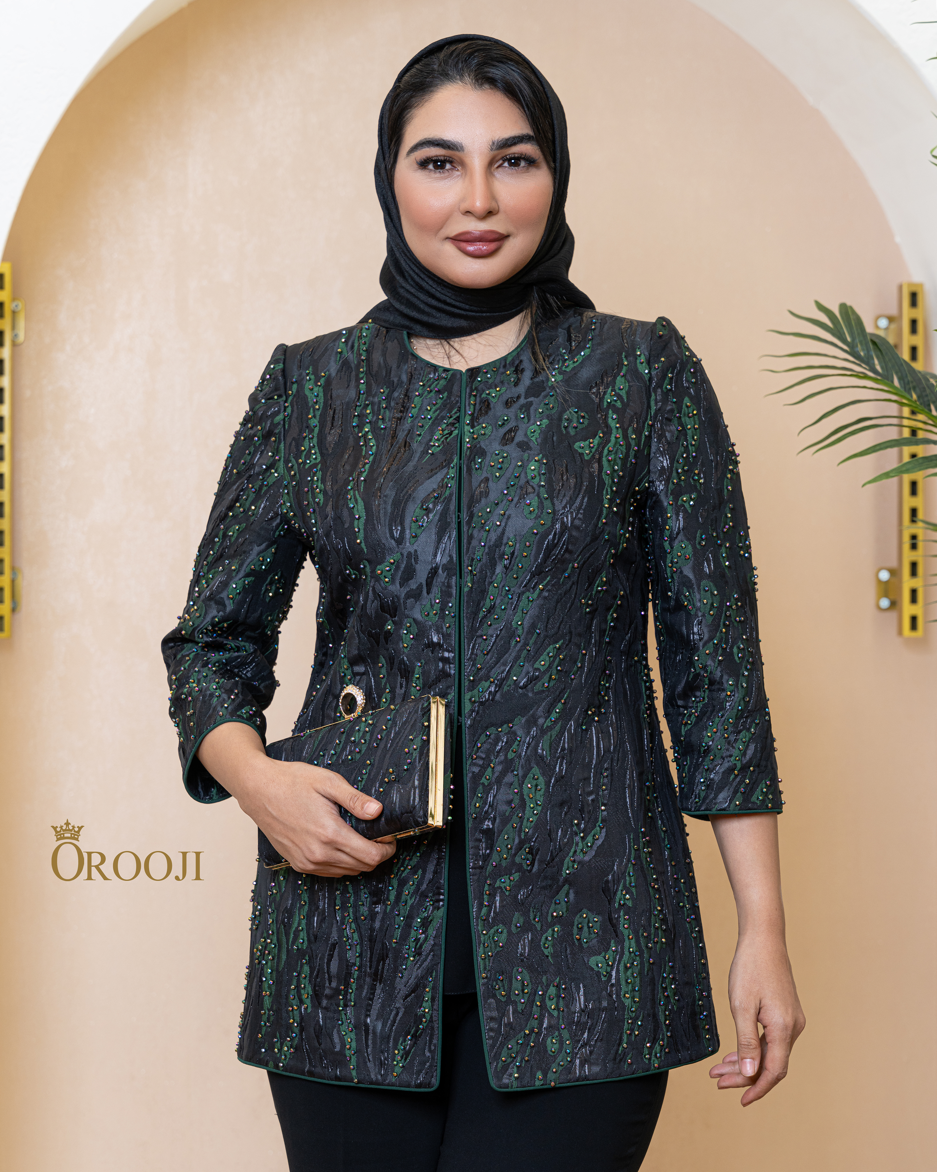 مانتو طرح ملورین از مجموعه خاص مزون عروجی، تلفیقی از ظرافت و اصالت است. این مانتو با جنس ژاکارد ترک و سنگدوزی‌های اورجینال و گران‌قیمت به‌صورت دست‌دوز طراحی و دوخته شده است.