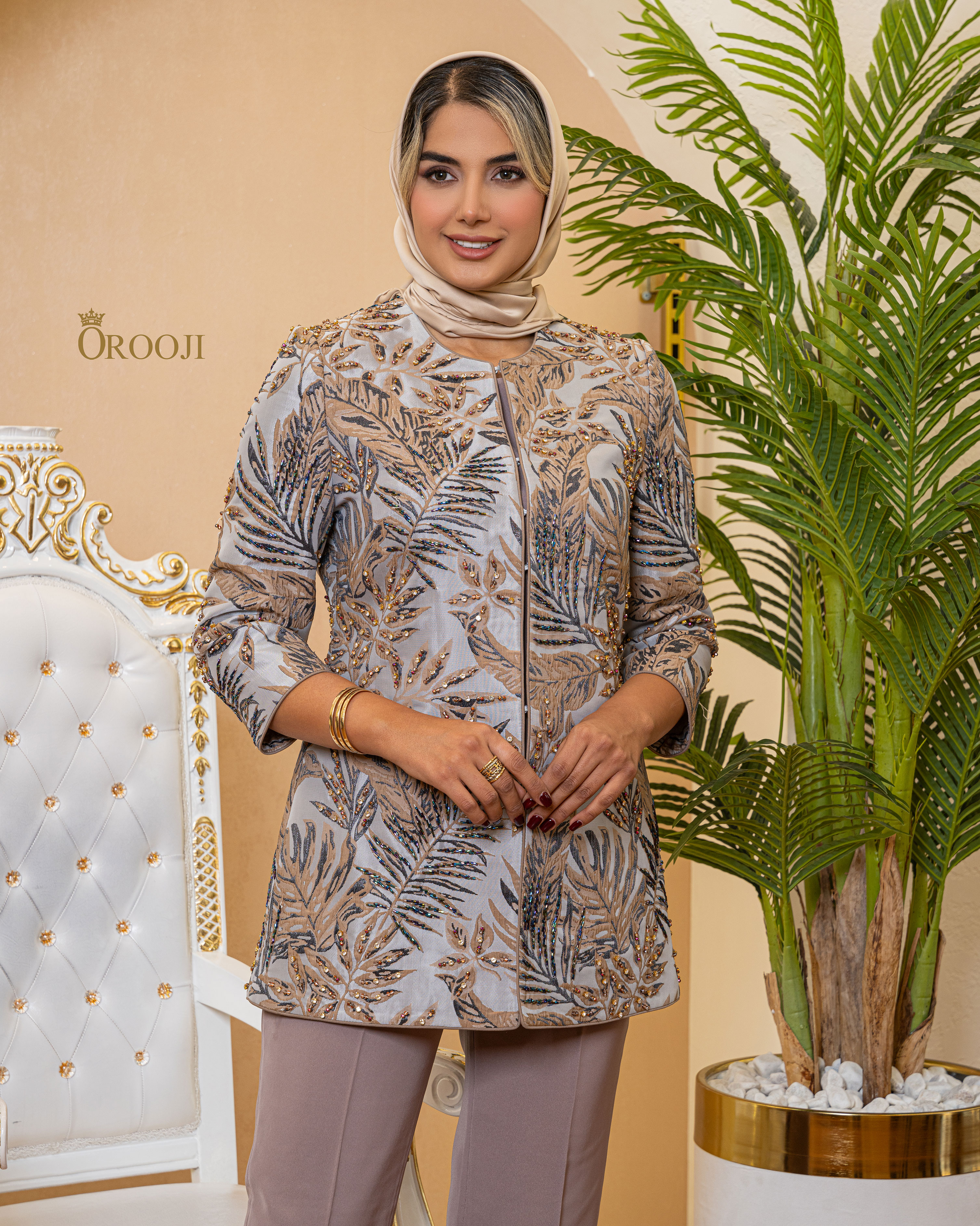 نقوش برگگونهی روی پارچه بهصورت برجسته و با دوخت ترکیبی از نخ براق و سنگهای اورجینال کار شده که جلوهای لوکس و در عین حال طبیعی به لباس میدهد.