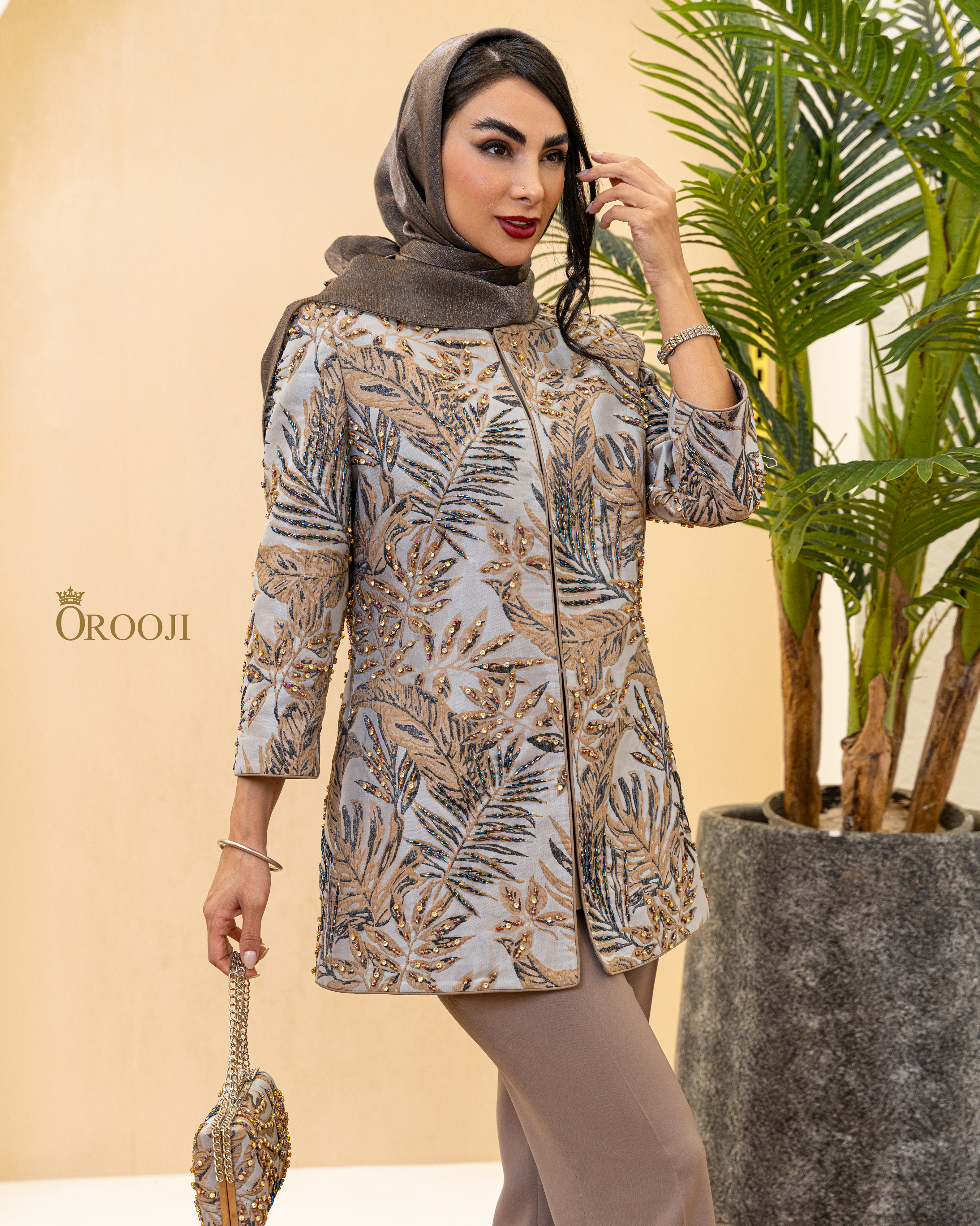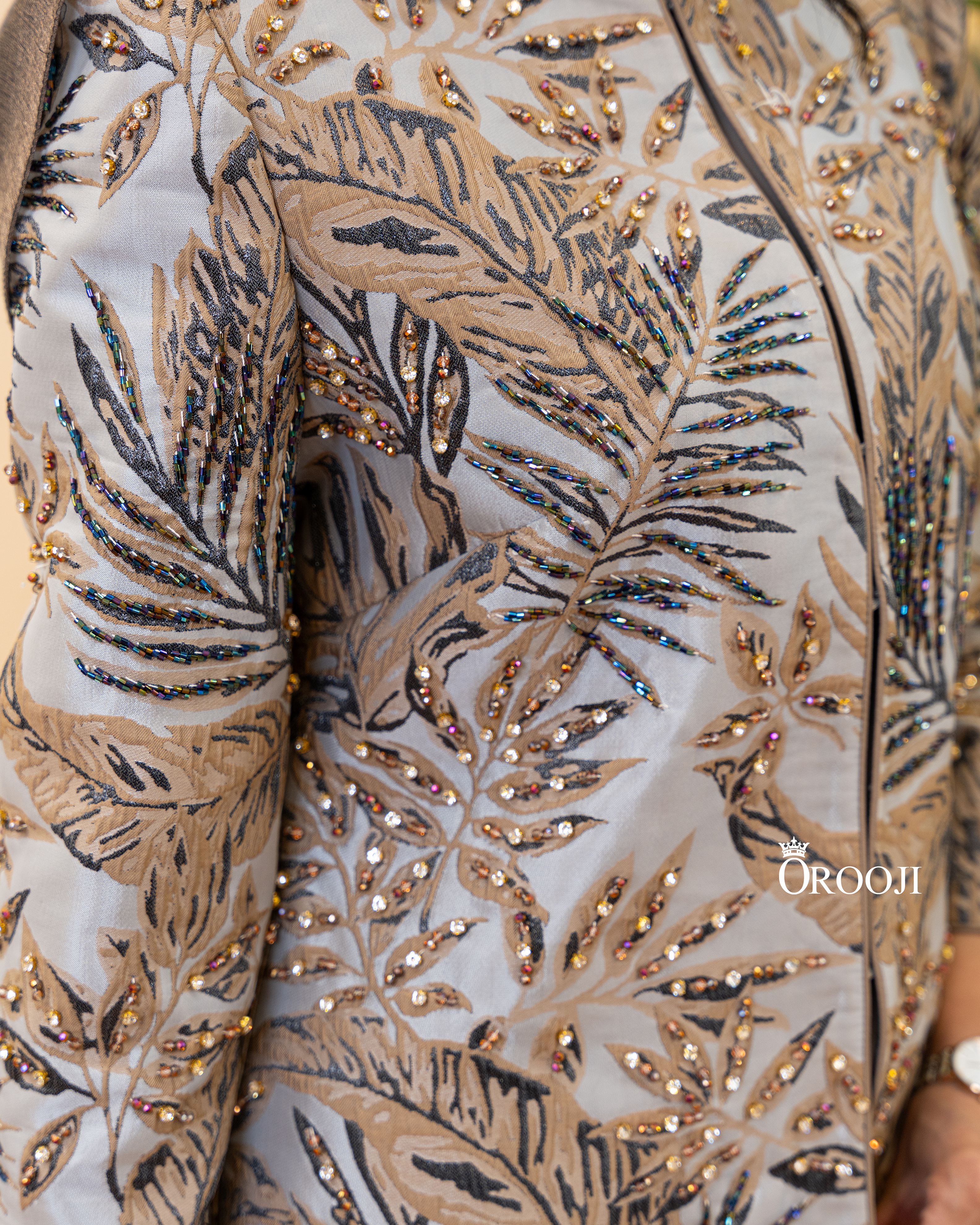 نقوش برگگونهی روی پارچه بهصورت برجسته و با دوخت ترکیبی از نخ براق و سنگهای اورجینال کار شده که جلوهای لوکس و در عین حال طبیعی به لباس میدهد.
