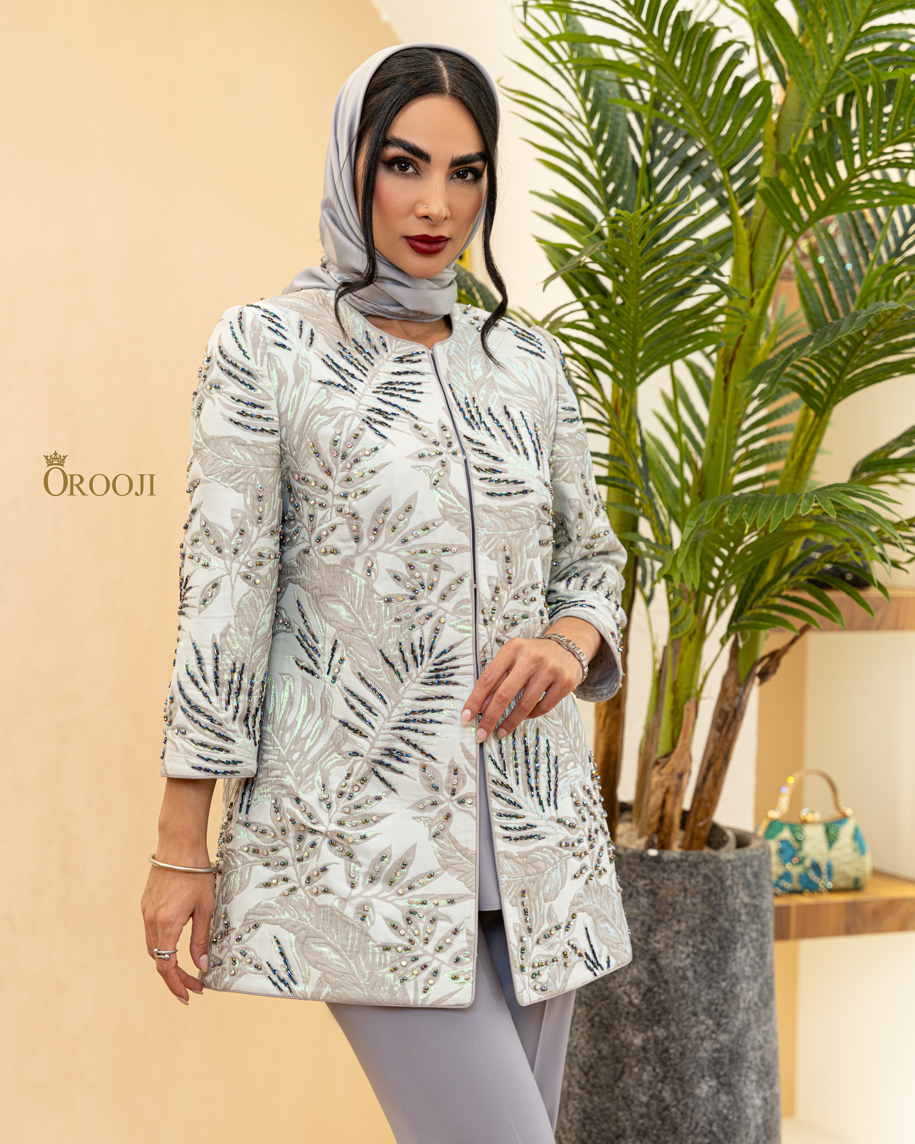 نقوش برگگونهی روی پارچه بهصورت برجسته و با دوخت ترکیبی از نخ براق و سنگهای اورجینال کار شده که جلوهای لوکس و در عین حال طبیعی به لباس میدهد.