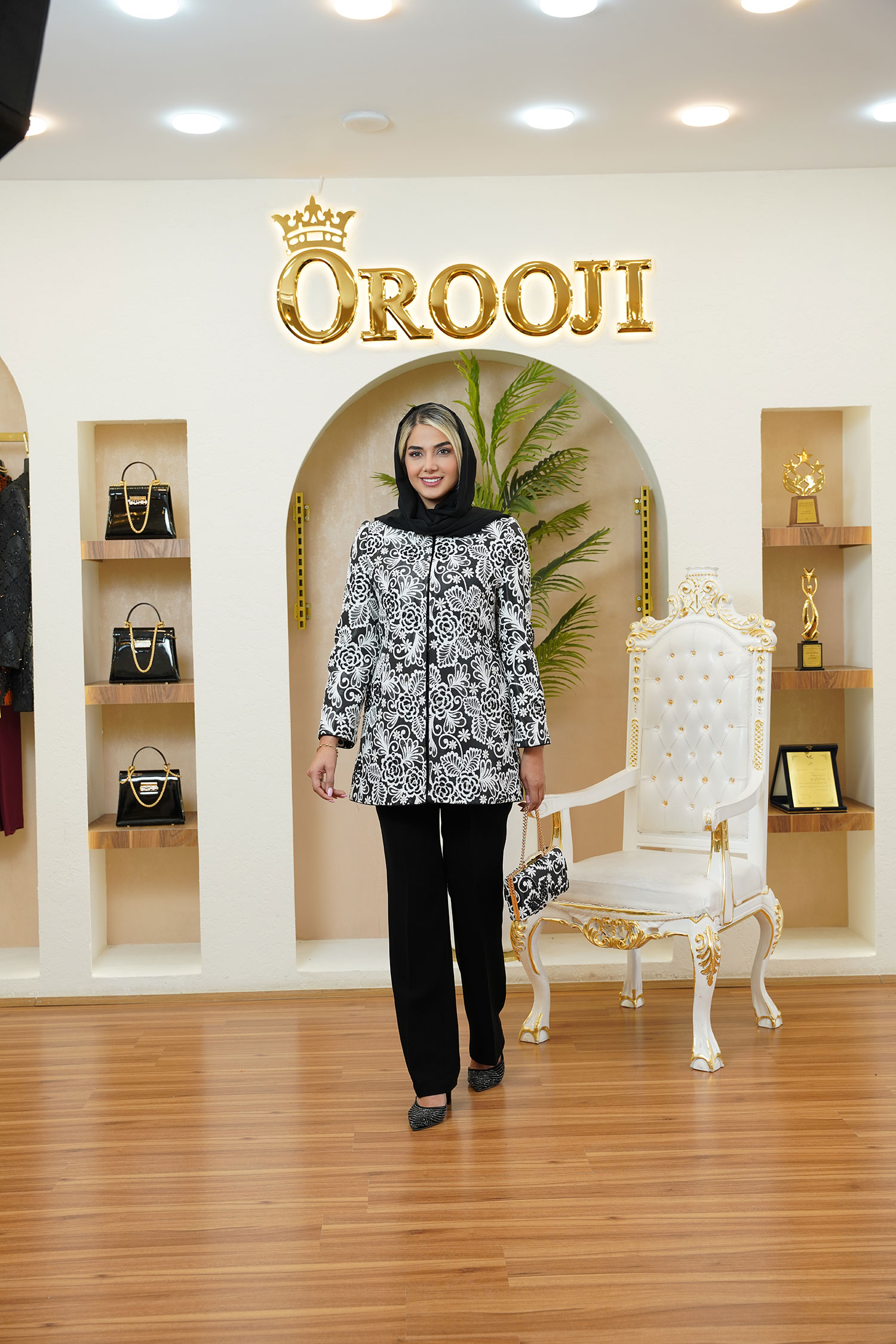 مانتو نیو مارگاریتا یکی از لوکسترین کارهای مزون عروجی است؛ طراحی شده با پارچهی شنل درجهیک، نقوش گلدار برجسته و سنگدوزی حرفهای با کریستالهای درخشان. ترکیب رنگ مشکی–سفید همراه با جزئیات مغزیدوزی، جلوهای کاملاً ظریف و چشمنواز ایجاد کرده است. قد 80 سانتیمتر، آستین قد 60 و دوخت مزونی تمیز باعث شده این کار برای مجالس، مهمانیها و استایلهای کلاس شب انتخابی بیرقیب باشد.