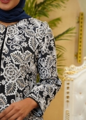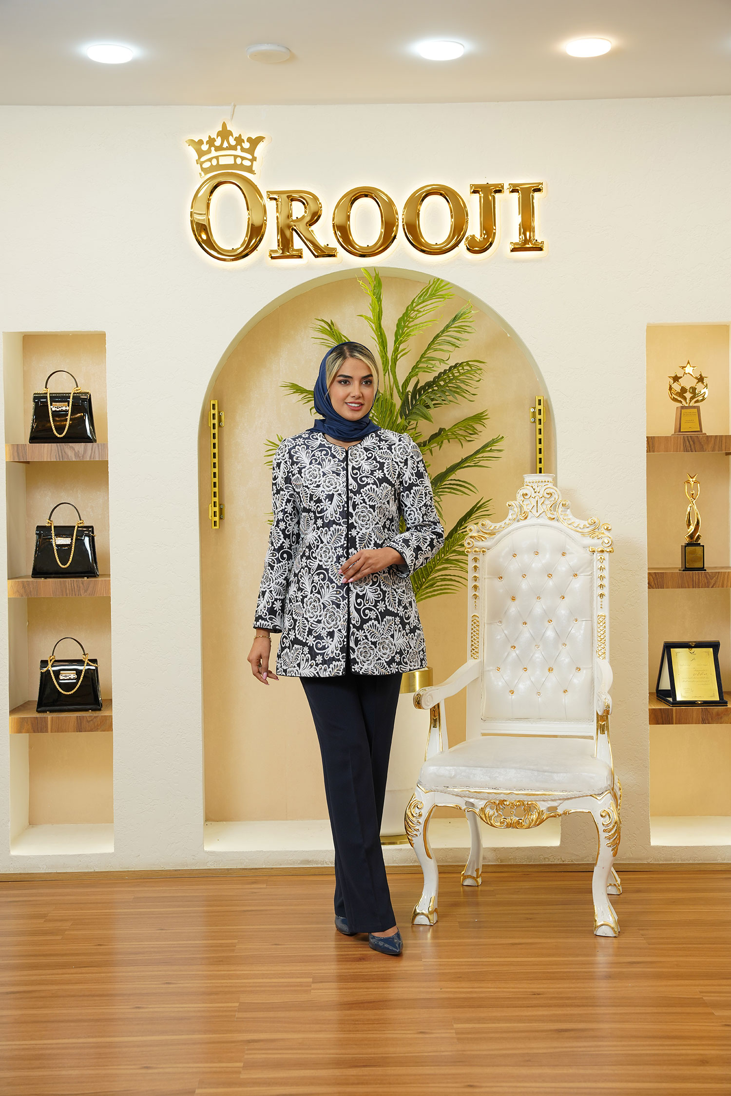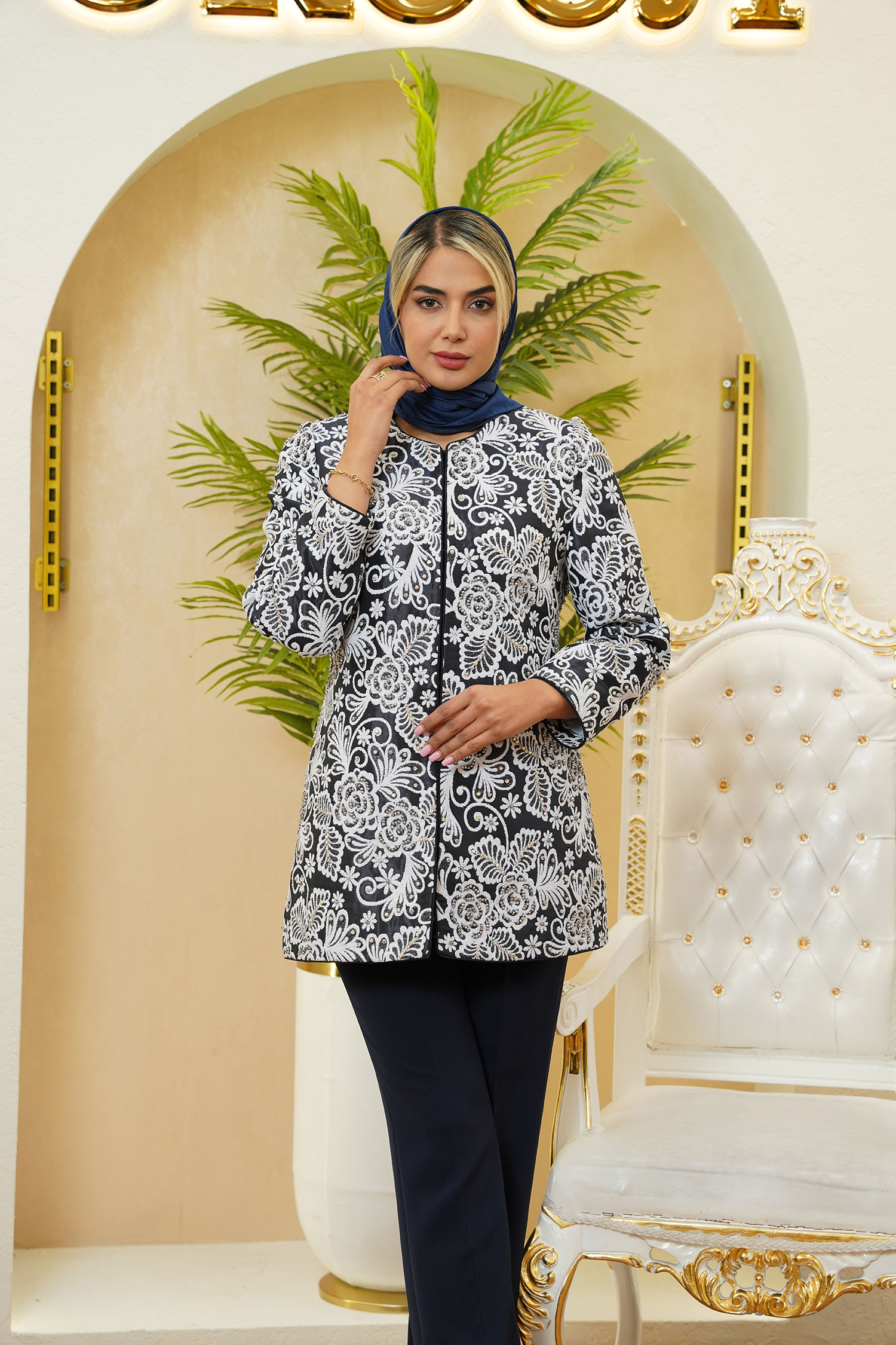 مانتو نیو مارگاریتا یکی از لوکسترین کارهای مزون عروجی است؛ طراحی شده با پارچهی شنل درجهیک، نقوش گلدار برجسته و سنگدوزی حرفهای با کریستالهای درخشان. ترکیب رنگ مشکی–سفید همراه با جزئیات مغزیدوزی، جلوهای کاملاً ظریف و چشمنواز ایجاد کرده است. قد 80 سانتیمتر، آستین قد 60 و دوخت مزونی تمیز باعث شده این کار برای مجالس، مهمانیها و استایلهای کلاس شب انتخابی بیرقیب باشد.