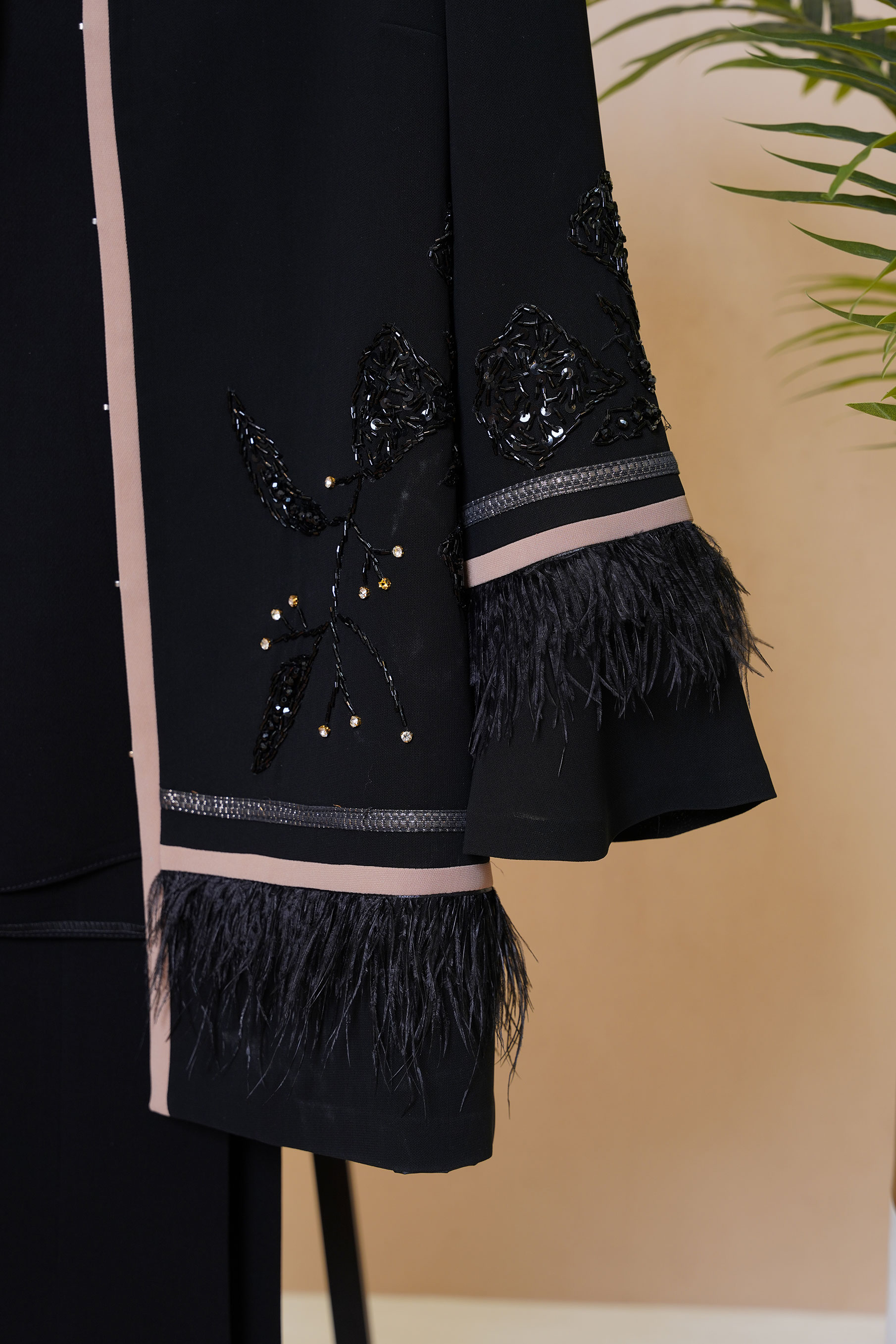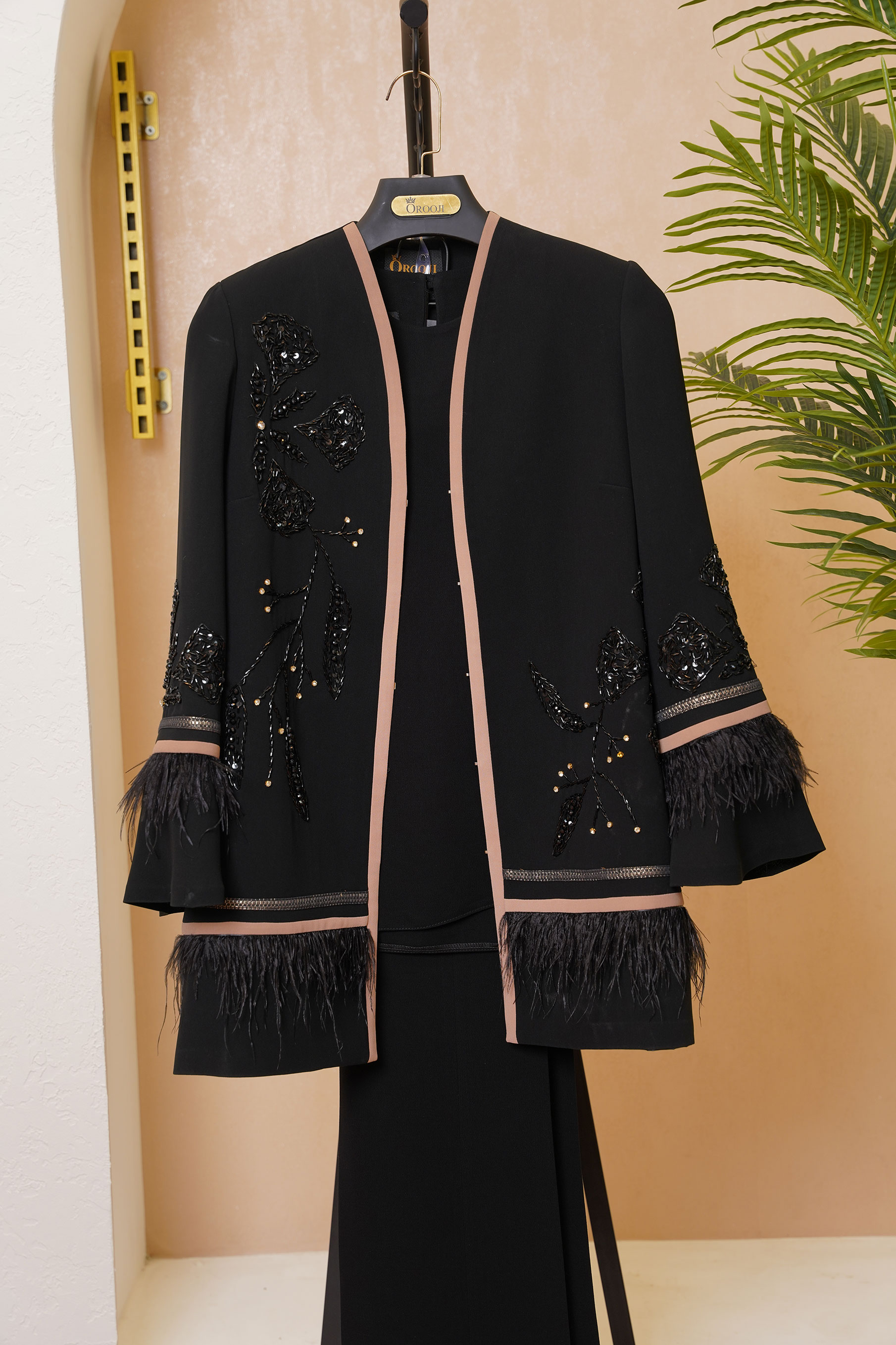 فرم آستینها کمی فون/کلوش طراحی شده و به خاطر جزئیاتِ پر/ریشریشِ سرآستین، هنگام حرکت دستها یک جلوهی بسیار مجلسی و پرجزئیات ایجاد میکند. پایین کت هم همین پرداخت را دارد تا در عکس و ویدئو، «لوکس بودن» کاملاً دیده شود.