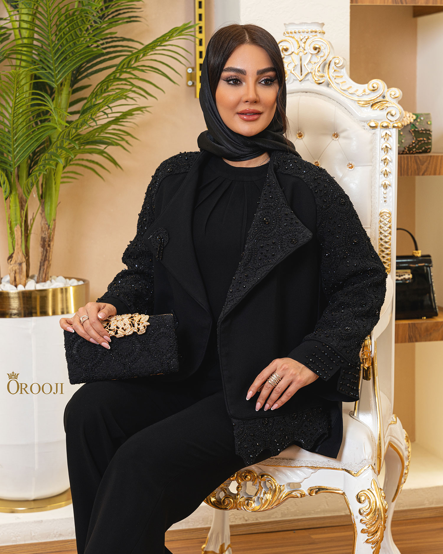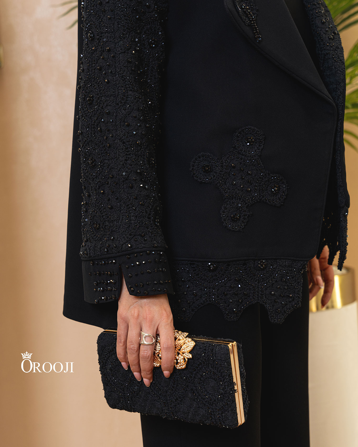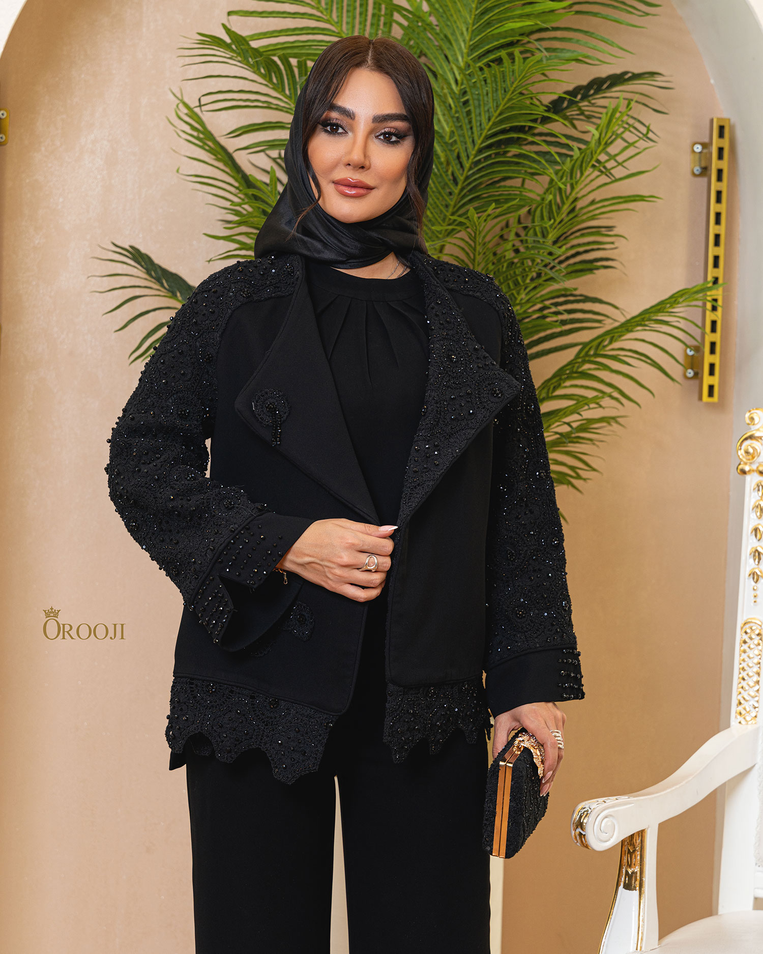 مانتو «رگلان گیپور کرپ ۶ ضلعی» یک کتمانتوی کوتاهِ تمامعیار برای استایلهای مهمانیهای بسیار رسمی است؛ فرم کلی کار، کتِ کوتاهِ مزونی با برش رگلان است تا تنخور نرم و شیک روی سرشانه بنشیند و در عین حال ایستایی تمیزِ کت حفظ شود. نقطهی امضای طراحی، ترکیب پارچهی کرپ کنزو با گیپور/دانتل برجسته و گلدوزی مرواریدی-کریستالی روی آستینها و لبههاست؛ این تزئینات، درخشش را کاملاً کنترلشده و کلاسیک نگه میدارند. یقهی بلیزرِ شالگونه (Shawl Lapel) با لبههای پهن و خطوط نرم، فریم صورت را مرتبتر نشان میدهد و به استایل حالت تشریفاتی میدهد؛ در کنار آن، سرآستینهای کلوش با برش/چاک هندسی باعث میشوند حرکت دست زیباتر و عکسها چشمگیرتر شوند. پایینکار با ردیف گیپور و لبهدوزی تمیز تمام شده و مجموعاً نتیجه، یک مانتوی مشکی بسیار شیک و مجلسی است