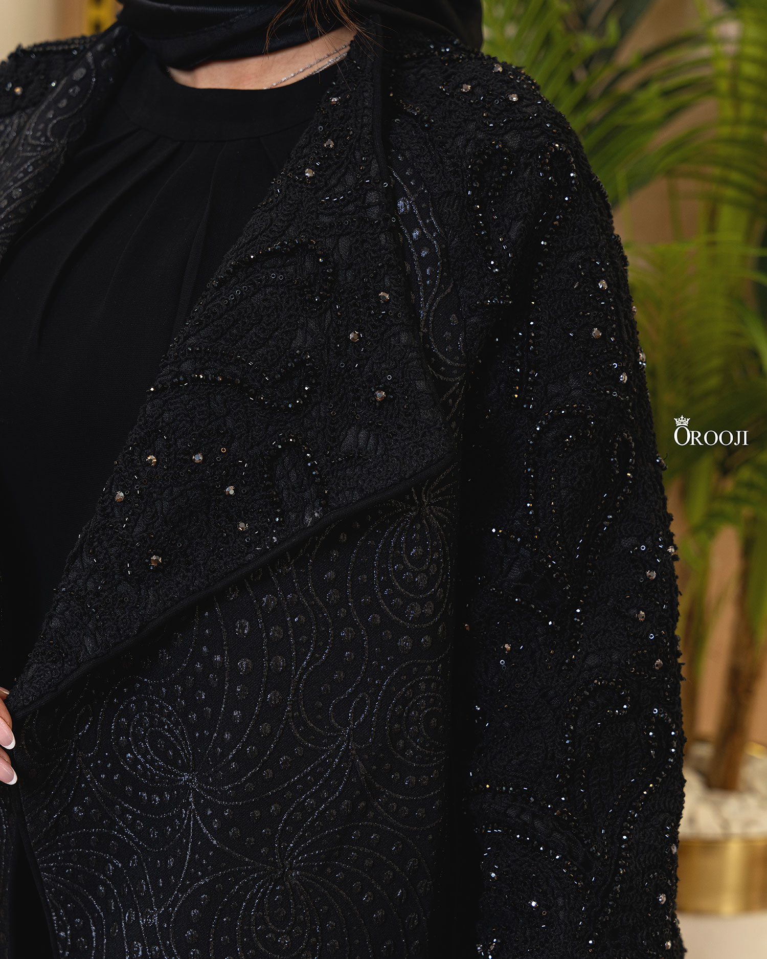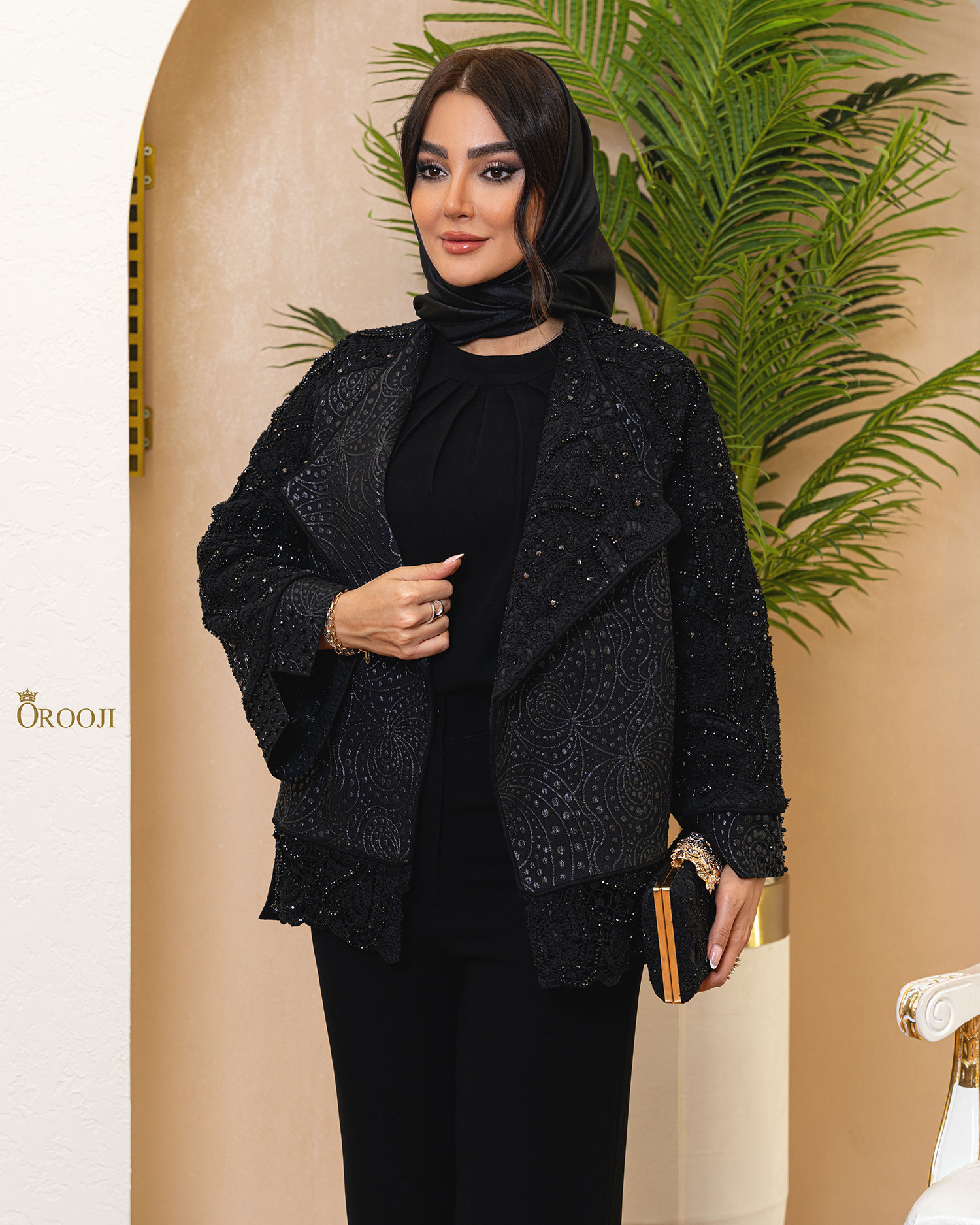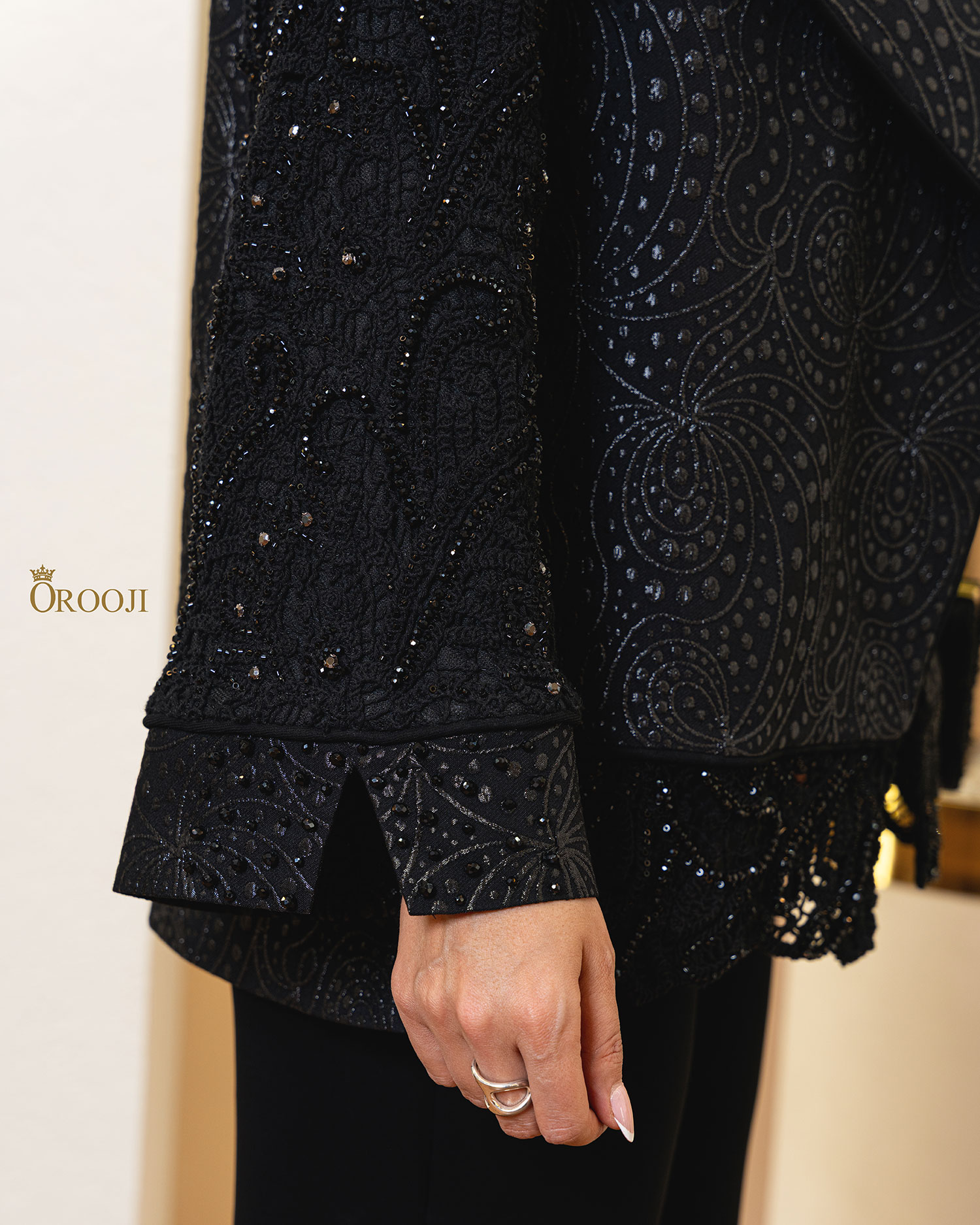 مانتو «رگلان گیپور ژاکارد گل جناقی» یک کت‌مانتوی کوتاهِ تمام‌عیار برای استایل‌های مهمانی‌های بسیار رسمی است؛ فرم کلی کار، کتِ کوتاهِ مزونی با برش رگلان است تا تن‌خور نرم و شیک روی سرشانه بنشیند و در عین حال ایستایی تمیزِ کت حفظ شود. نقطه‌ی امضای طراحی، ترکیب پارچه‌ی ژاکارد ترک با گیپور/دانتل برجسته و گل‌دوزی مرواریدی-کریستالی روی آستین‌ها و لبه‌هاست؛ این تزئینات، درخشش را کاملاً کنترل‌شده و کلاسیک نگه می‌دارند. یقه‌ی بلیزرِ شال‌گونه (Shawl Lapel) با لبه‌های پهن و خطوط نرم، فریم صورت را مرتب‌تر نشان می‌دهد و به استایل حالت تشریفاتی می‌دهد؛ در کنار آن، سرآستین‌های کلوش با برش/چاک هندسی باعث می‌شوند حرکت دست زیباتر و عکس‌ها چشمگیرتر شوند. پایین‌کار با ردیف گیپور و لبه‌دوزی تمیز تمام شده و مجموعاً نتیجه، یک مانتوی مشکی بسیار شیک و مجلسی است