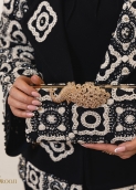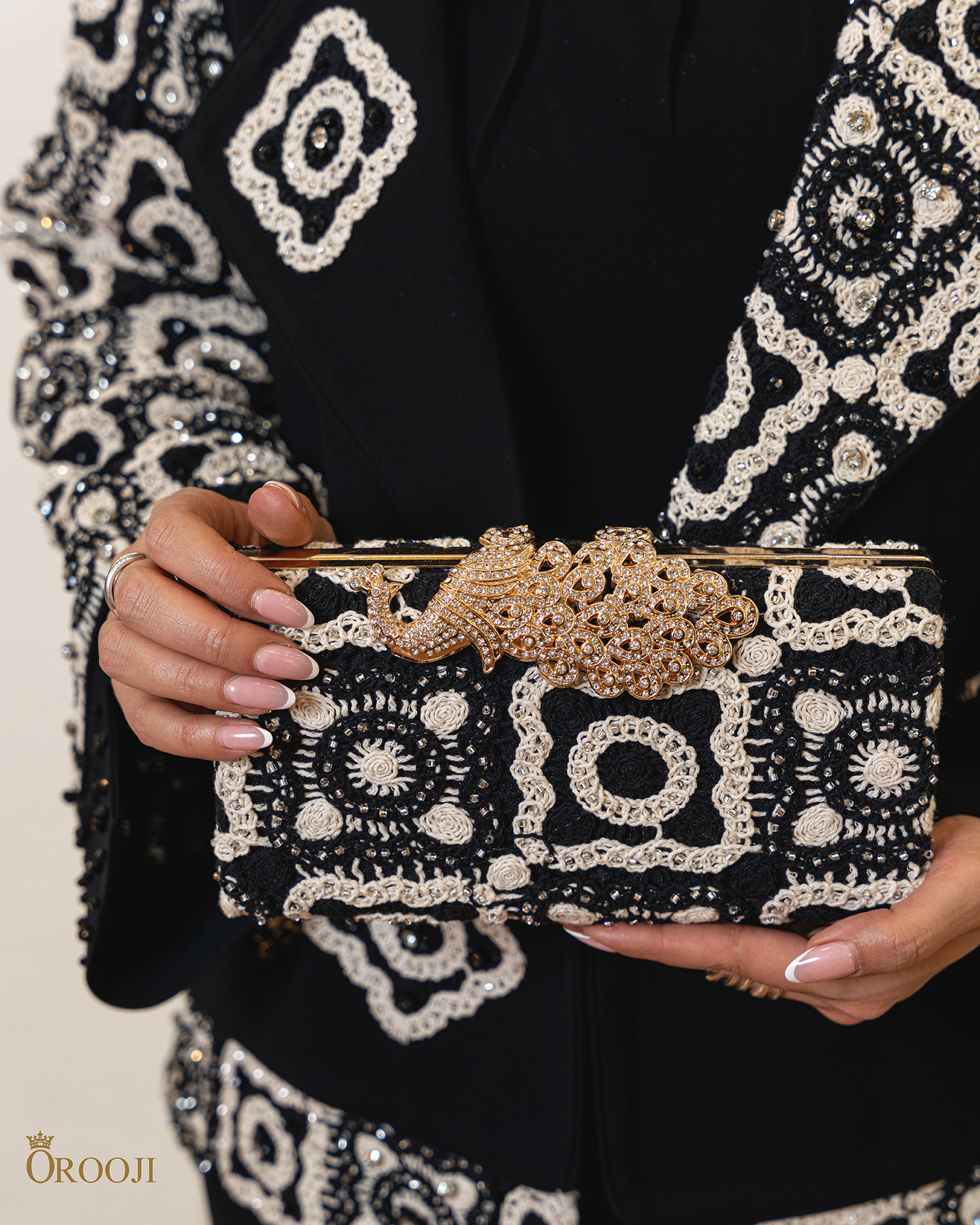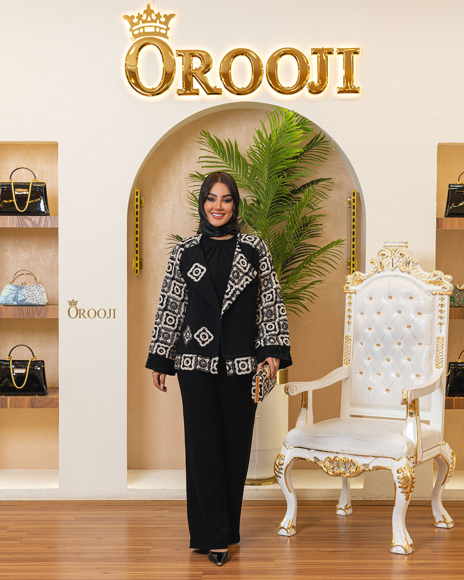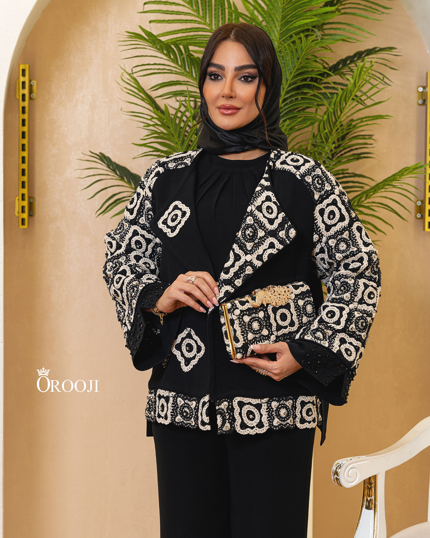 این مدل یک مانتوی رگلانِ مجلسی با زبان طراحی کاملاً گرافیکی و «کنتراستمحور» است؛ ترکیب زمینهی مشکیِ یکدست با گیپور برجستهی سفید، جلوهای بسیار چشمگیر و لوکس ایجاد کرده که هم از دور خواناست و هم از نزدیک پرجزئیات. نقوش اصلی به شکل مدولهای هندسیِ چهارگوش و لوزی طراحی شدهاند؛ داخل هر قاب، ریزنقشهای دایرهای و گلمانند نشسته که حس «موزاییکی» و منظم به کار میدهد و باعث میشود طرح شلوغ نشود و ریتم بصری یکنواخت و حرفهای داشته باشد. این موتیفها بهصورت هوشمندانه روی سرشانه و آستینها پخش شدهاند تا برش رگلان را برجستهتر کنند و در عین حال، روی تنهی مانتو فضای مشکیِ خالص حفظ شده تا اندام کشیدهتر دیده شود. یقهی لَپِلدار با شکست تمیز و لبههای دقیق، قاب صورت را شکیل میکند و ادامهی همان زبان هندسی را با یک یا دو مدول شاخص روی سینه کامل میسازد. در پایینِ مانتو نیز یک نوار حاشیهای از همین مدولها کار شده که مثل قاب، کار را جمعبندی میکند و به خروجی نهایی حس «ست کامل و کادربندیشده» میدهد. ریزتزئینات براق (نگین/منجوقهای نقطهای) بهصورت کنترلشده روی بعضی بخشها و بهخصوص سرآستینها کار شده تا بافت سهبعدی ایجاد کند بدون اینکه طرح را شلوغ یا بیشازحد درخشان کند؛ نتیجه یک مانتوی رسمی–مجلسیِ بسیار خاص است که هم با اکسسوری طلایی عالی مینشیند و هم با کیف ستِ طرحدار، یک استایل کامل و برند-پسند میسازد.