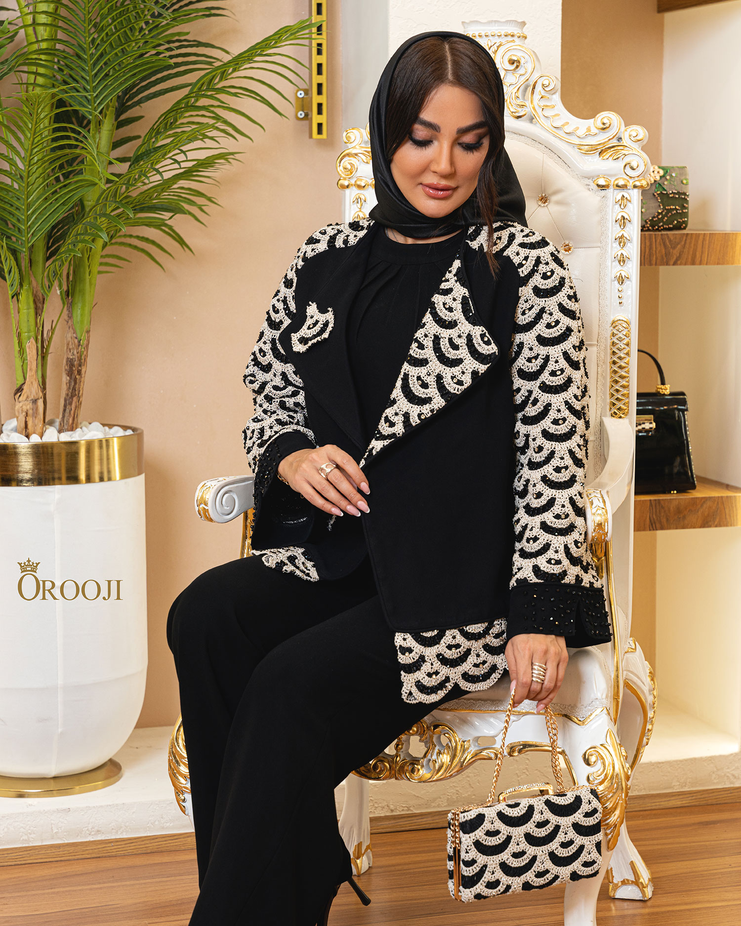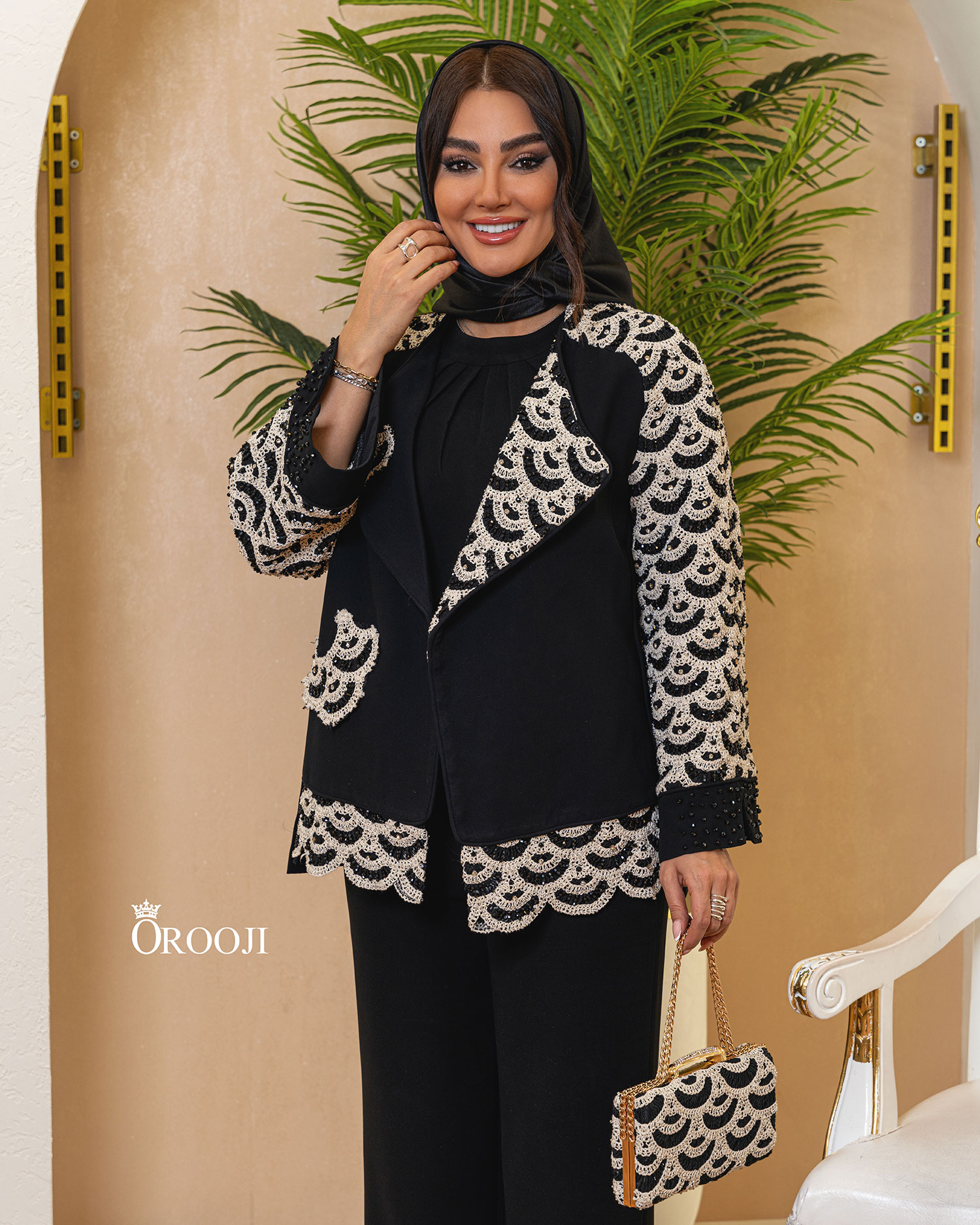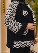 این مانتو با برش رگلان و ترکیب پارچهی کرپ کنزو در بدنه با گیپور برجستهی نقشدار در آستینها و حاشیهها، جلوهای متعادل از وقار و ظرافت ایجاد کرده است. زمینهی مشکیِ ماتِ کرپ کنزو با ایستایی نرم و ریزش کنترلشده، بستر شیکی برای نمایش نقوش نیمدایرهای و موجمانندِ گیپور کرمرنگ فراهم کرده که بهصورت ریتمیک روی آستینها، یقه و لبهی پایین مانتو تکرار شدهاند. این تکرار منظم، حس هارمونی بصری و طراحی حسابشده را منتقل میکند. یقهی لَپِلدار با شکست تمیز، فرم کلاسیک و رسمی به کار داده و در کنار سرآستینهای مزین به ریزسنگهای مشکی، تعادل زیبایی میان سادگی و تزئینات ایجاد شده است؛ نتیجه، مانتویی مجلسی و شیک است که هم از نزدیک پرجزئیات دیده میشود و هم از دور استایلی یکپارچه و لوکس ارائه میدهد.