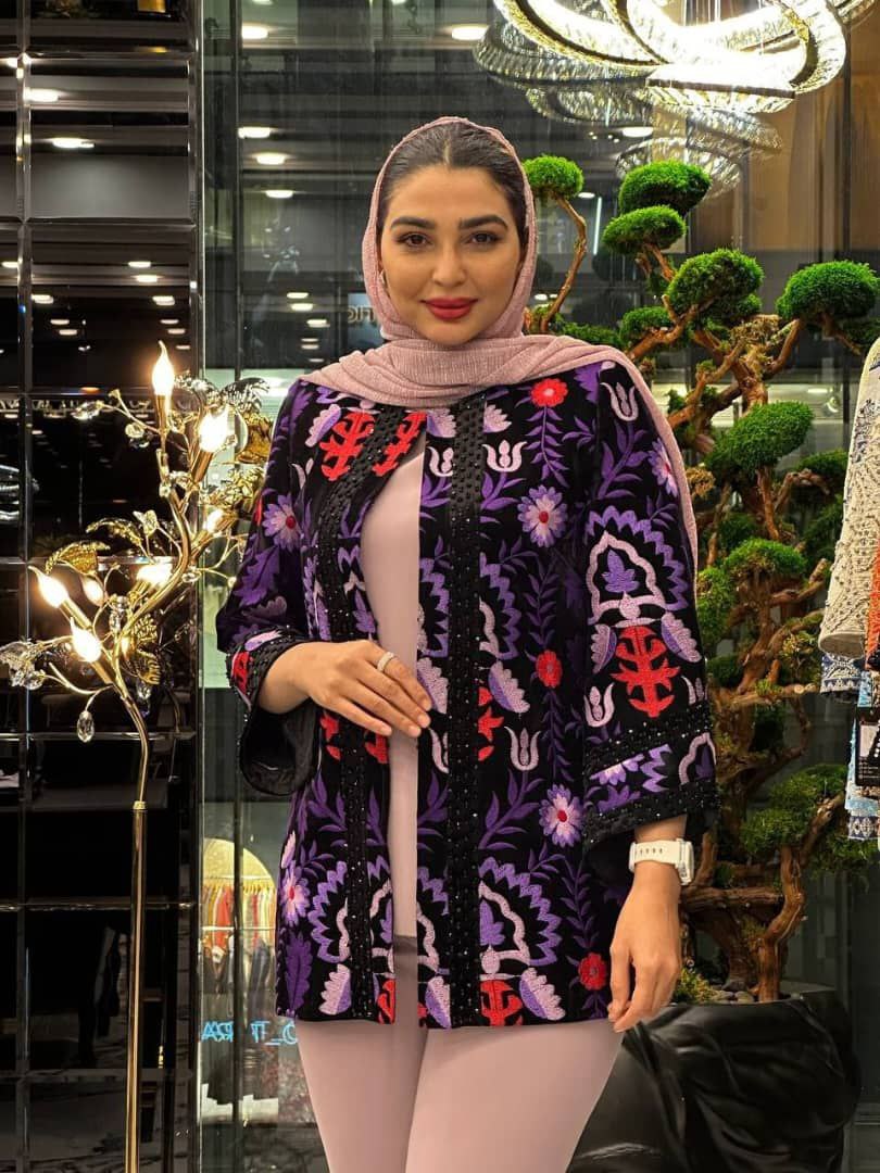 نقوش گلدار رنگی روی زمینهی بنفش تیره با جزییات برجسته، همراه با تزیینات کارشده در جلوی مانتو، این کار را تبدیل به یک انتخاب متفاوت کرده است.