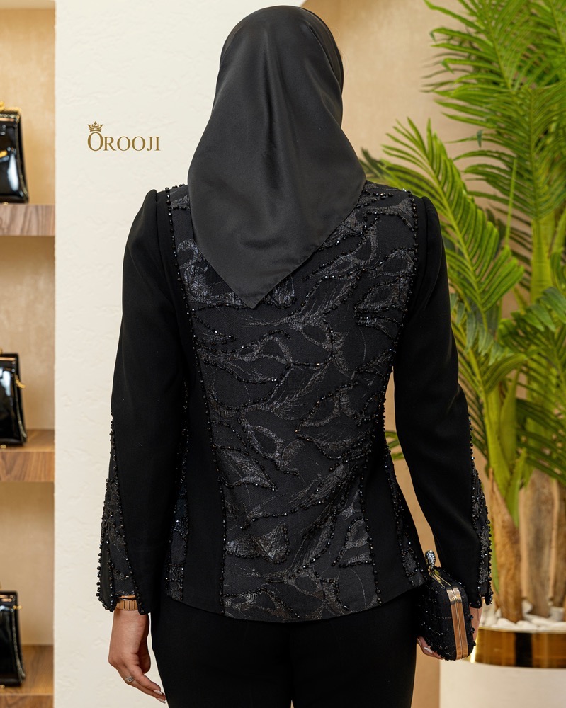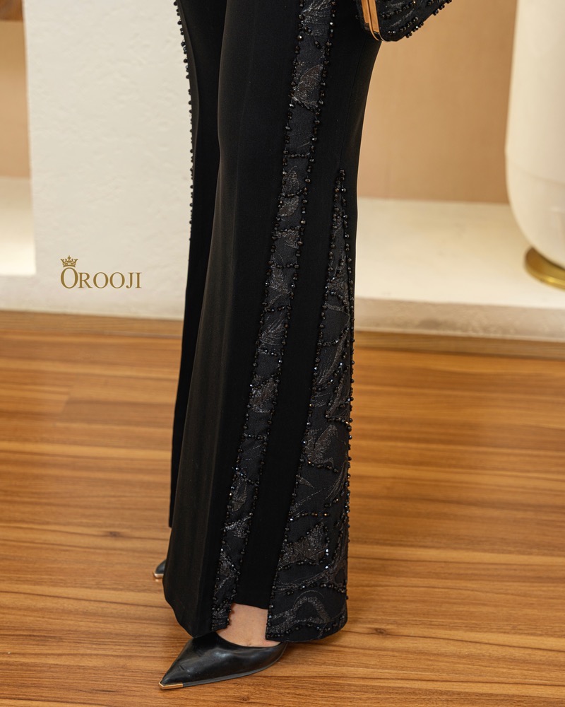 کتوشلوار مجلسی سها با نگاهی حرفهای به طراحی لباس شب، از ترکیب پارچهی ژاکارد و کرپ کنزو اجرا شده که تضادی ظریف میان بافتدار بودن و افت نرم ایجاد میکند. کت با قد ۶۲ سانتیمتر و آستین ۶۰ سانتیمتری، فرمی متعادل و خوشتناسب به بالاتنه میدهد و با برشهای دقیق، اندام را بهصورت ظریف فرمدهی میکند. استفاده از سنگدوزی اورجینال و کاملاً دستی در کنار ژاکارد، جلوهای لوکس و فاخر به طراحی بخشیده و ارزش هنری کار را برجسته میسازد. شلوار با کرپ کنزو و پنلهای ژاکارد عمودی، ضمن حفظ سادگی، امتداد بصری پاها را تقویت کرده و هماهنگی کاملی با کت ایجاد میکند. رنگ مشکی یکدست در کنار متریال باکیفیت و جزئیات حسابشده، کتوشلوار سها را به انتخابی شاخص برای مراسم رسمی و مجلسی سطح بالا تبدیل کرده است.