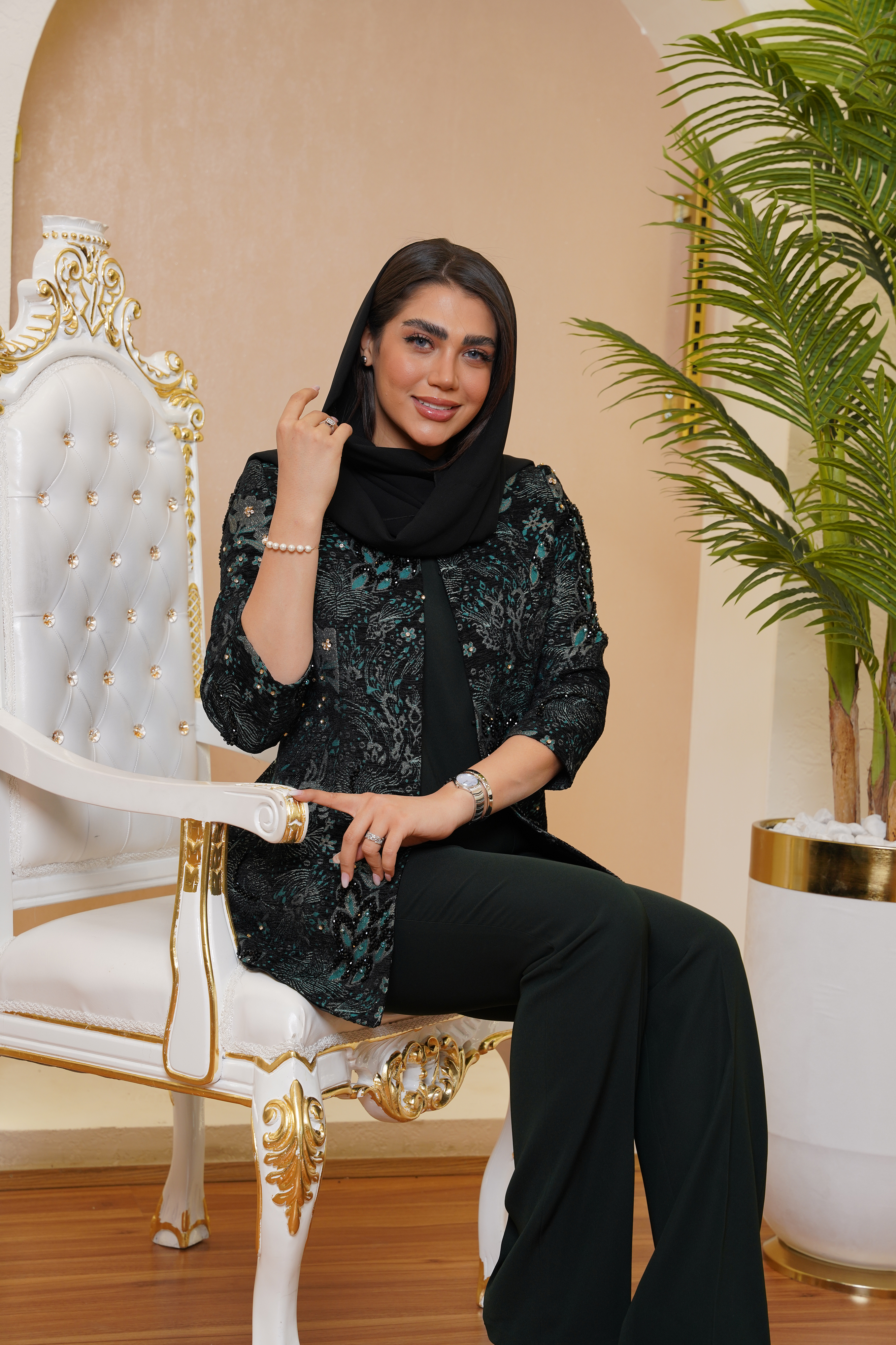 شنل راسپینا از طراحی‌های فاخر و متفاوت برند عروجی است؛ تلفیقی از پارچه‌ی ژاکارد لمه‌دار با سنگ‌دوزی‌های دست‌دوز و درخشش متالیک. این شنل با خطوط ظریف و دوخت خوش‌فرم خود، یکی از خاص‌ترین انتخاب‌ها برای بانوانی‌ست که به دنبال جلوه‌ای رسمی، درعین‌حال مدرن و چشمگیر هستند. دوخت دقیق و اجرای بینظیر سنگ‌ها روی بافت ژاکارد باعث شده نور در زوایای مختلف روی لباس بازی کند و جلوه‌ای خیره‌کننده خلق شود.