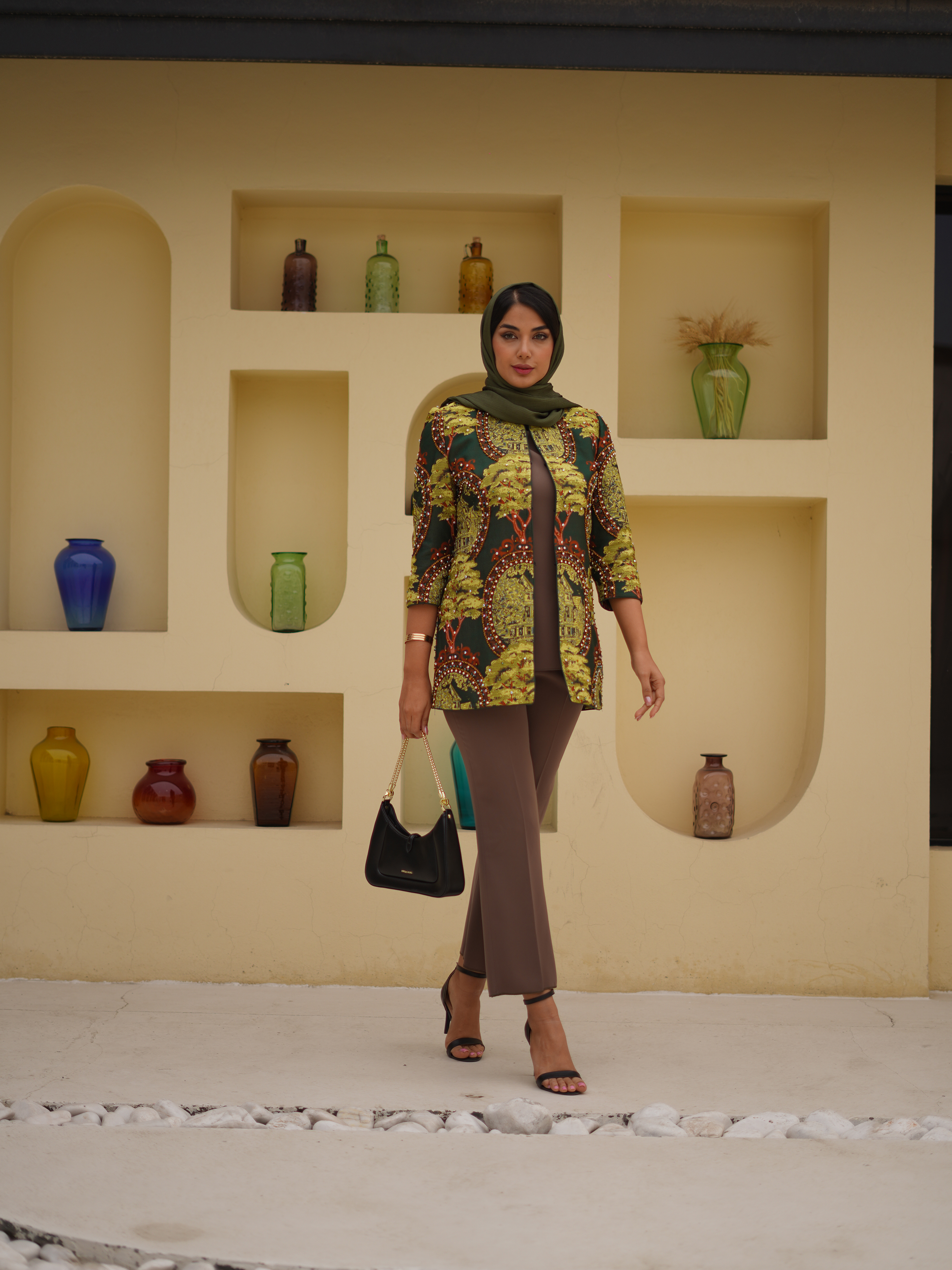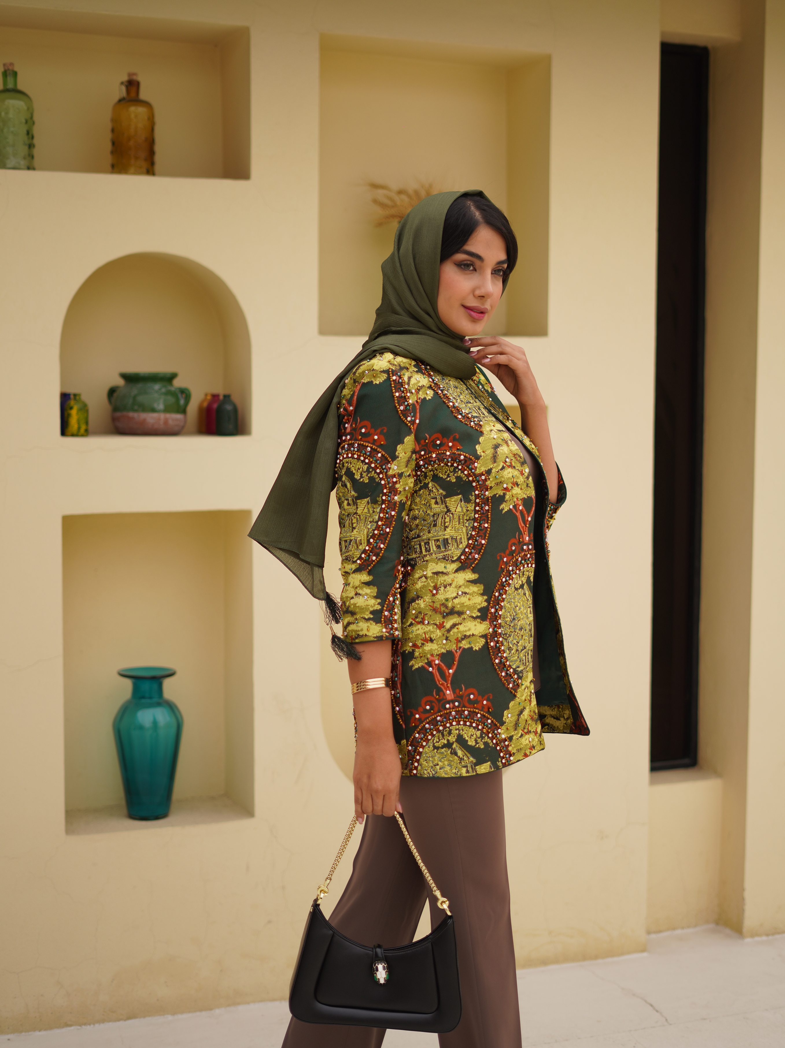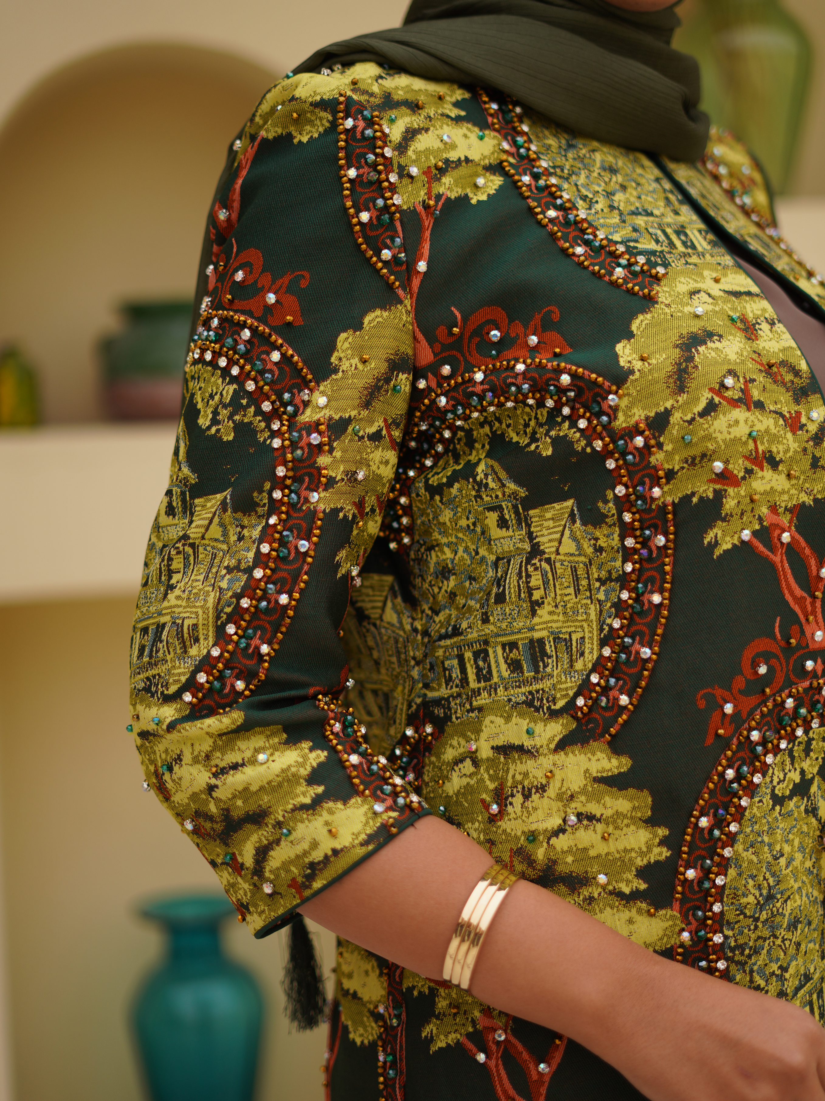 مانتوی ورساچ دایره با الهام از طرحهای سلطنتی و معماری کلاسیک، بر روی پارچهی ژاکارد ترک با تراکم بالا دوخته شده است.