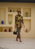 سطح پارچه با دایرههایی تزئینشده از نقوش باغ و قصر طراحی شده و با سنگدوزی اورجینال دستدوز تزئین گردیده است.