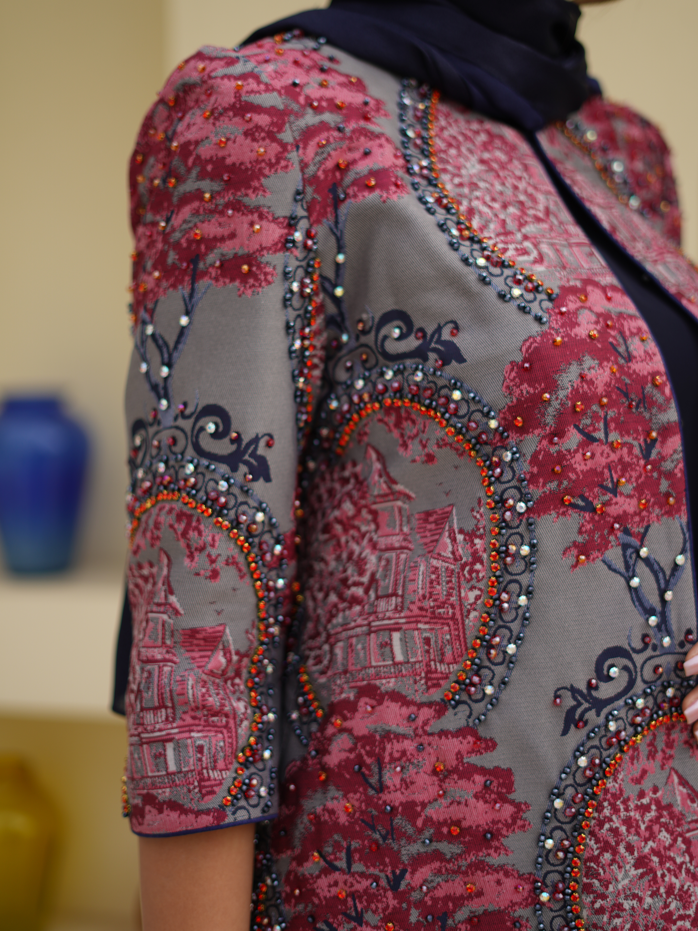 سطح پارچه با دایرههایی تزئینشده از نقوش باغ و قصر طراحی شده و با سنگدوزی اورجینال دستدوز تزئین گردیده است.