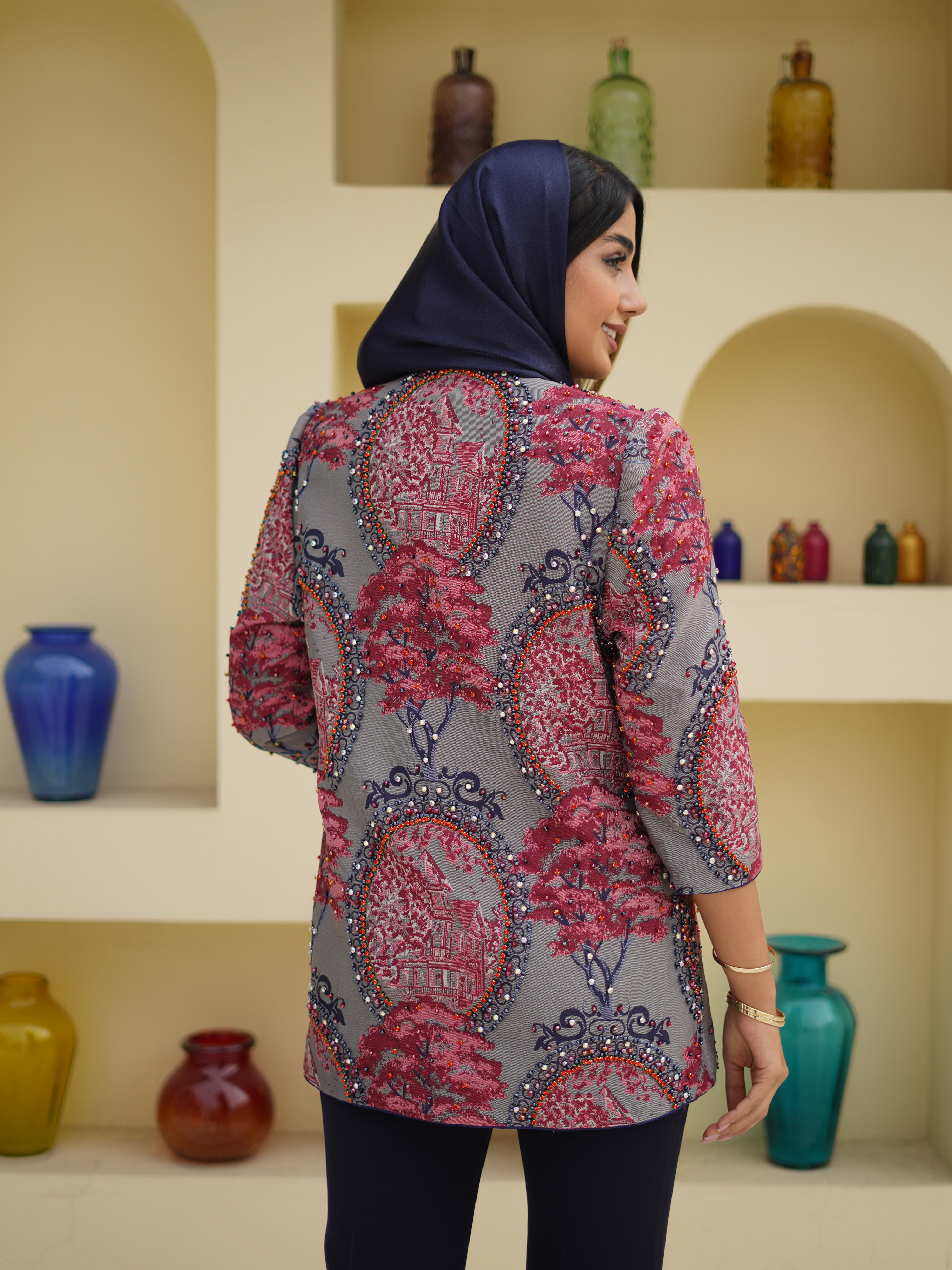 در بخش سرشانه و جلوی مانتو، چینش منظم سنگهای کریستالی باعث درخشش خاص زیر نور میشود.